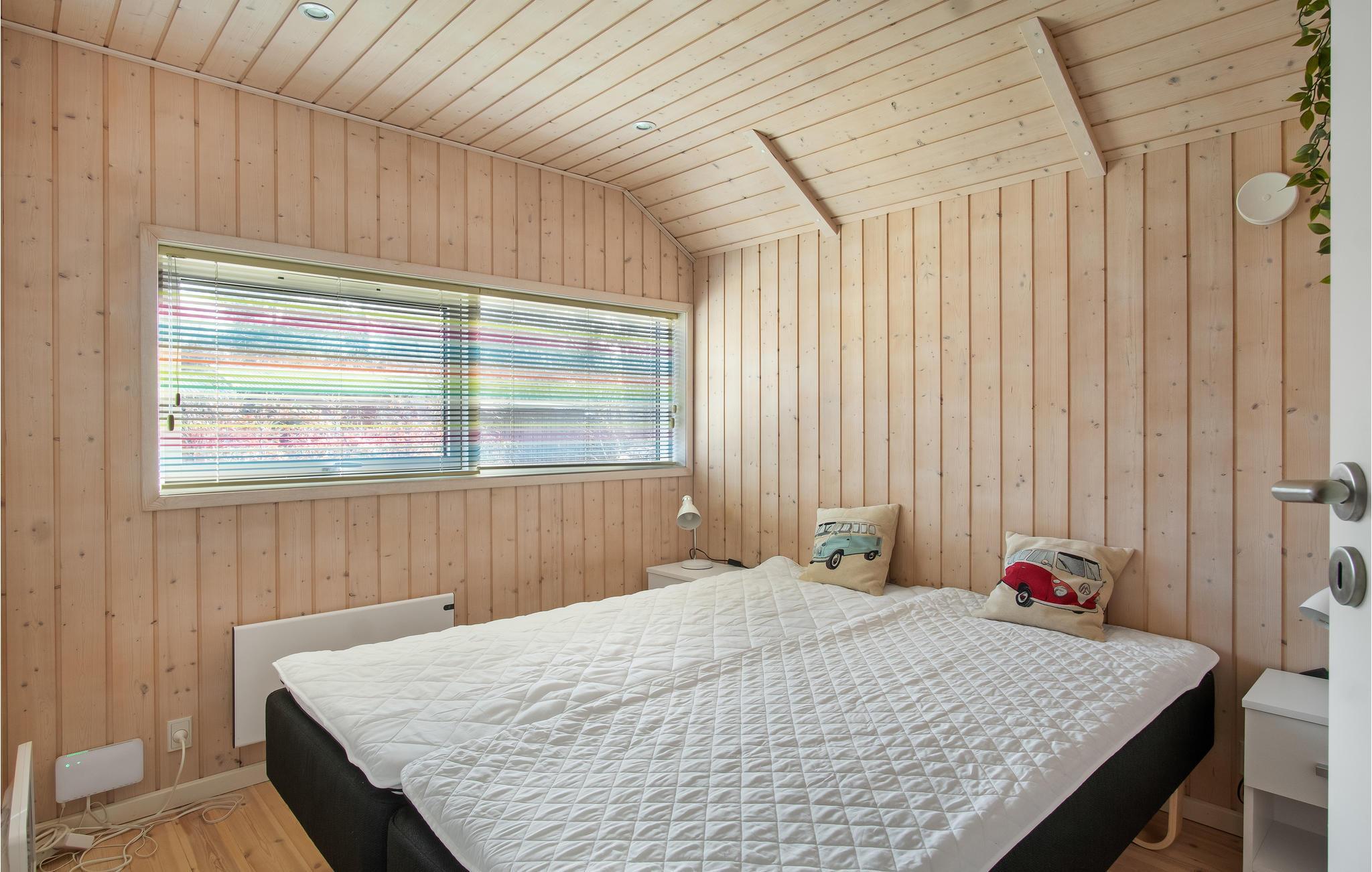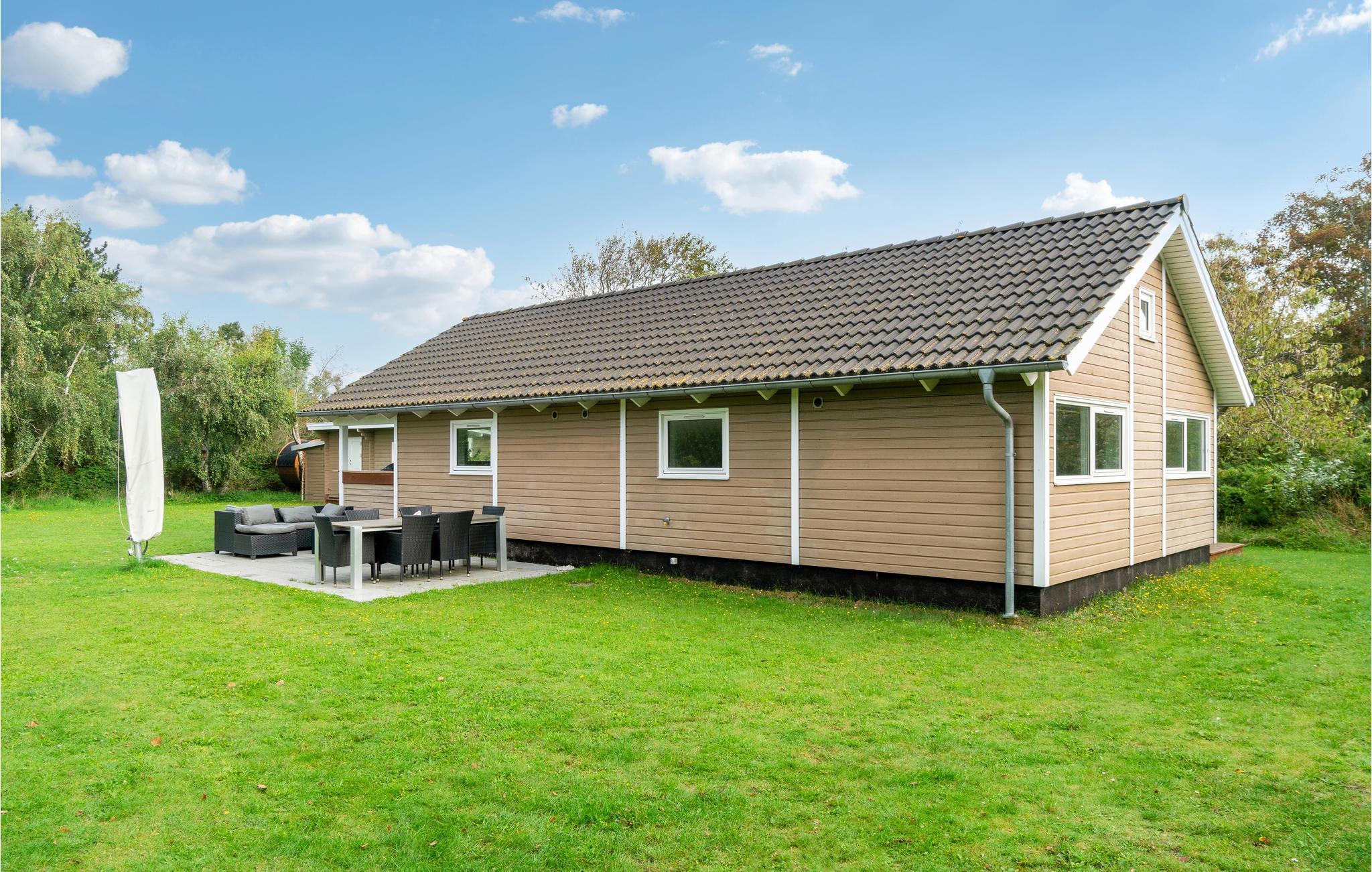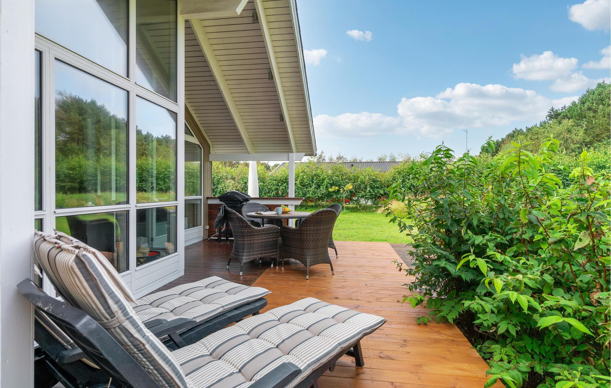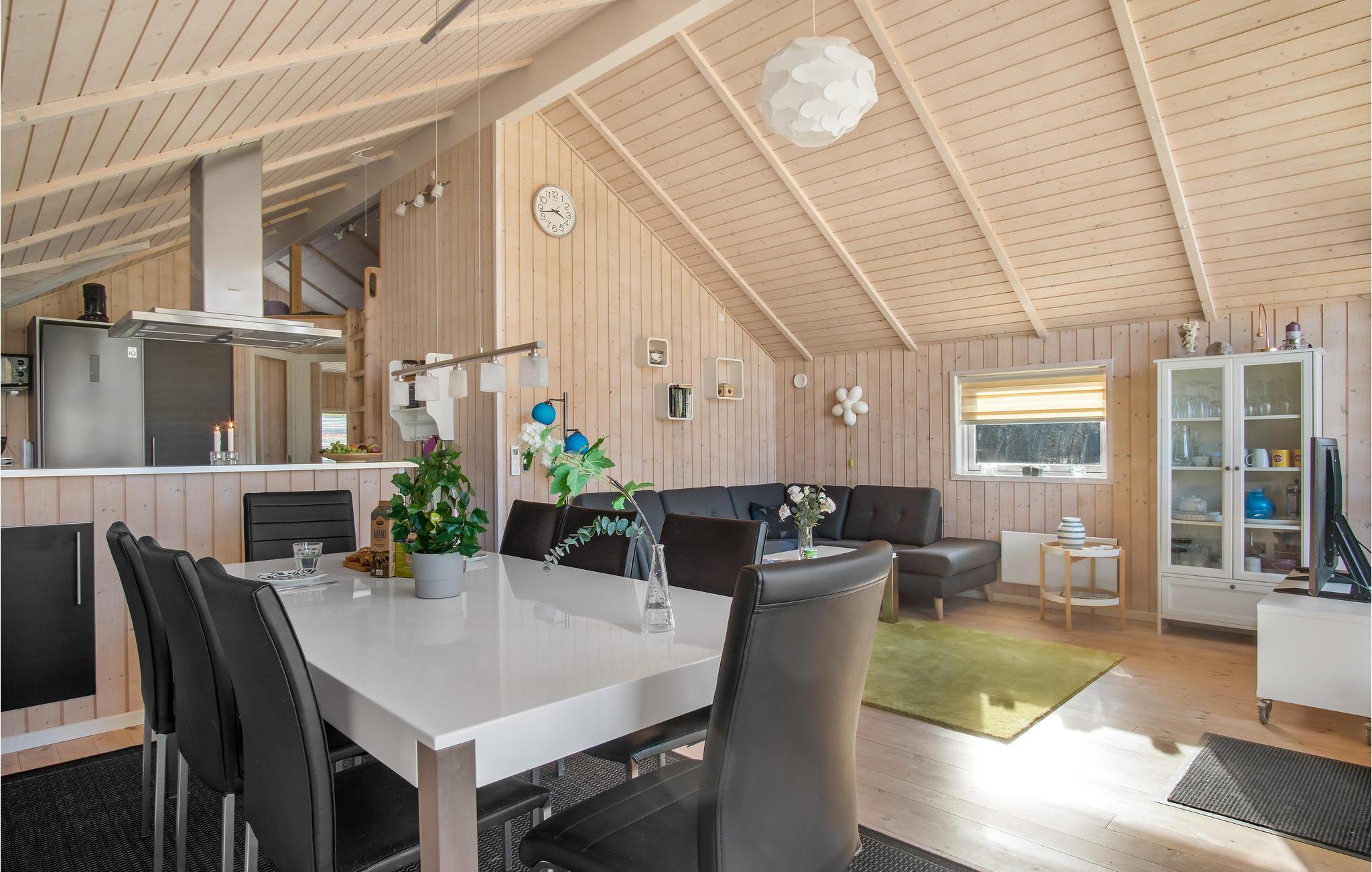 Glæd jer til at slappe af med hele familien i de lyse værelser i dette komfortable sommerhus. Træelementerne og den moderne indretning skaber en hjemlig atmosfære, mens glasfronten lukker masser af dagslys ind i huset. Lav mad her med udsigt over haven, nyd måltiderne sammen ved det lange spisebord, også med en vidunderlig udsigt over haven. Senere kan I finde jer godt til rette i sofaen, efter en dejlig dag på stranden eller en udflugt. Tænd op i brændeovnen om aftenen og sid behageligt sammen i lang tid. Feriehusets udendørsområde indbyder til mange glade timer i det fri. Nyd solen på terrassen, mens jeres børn løber rundt og leger. Slap af i den udendørs sauna og dæk derefter op til en lækker grillmiddag.