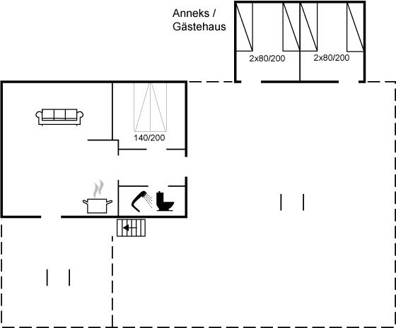 Der er i alt 3 soveværelser. Sovepladserne fordeler sig på: 2 sovepladser i dobbeltseng. 4 sovepladser i enkeltsenge. 4 af disse sovepladser befinder sig i et anneks (fordelt på 2 soveværelser).