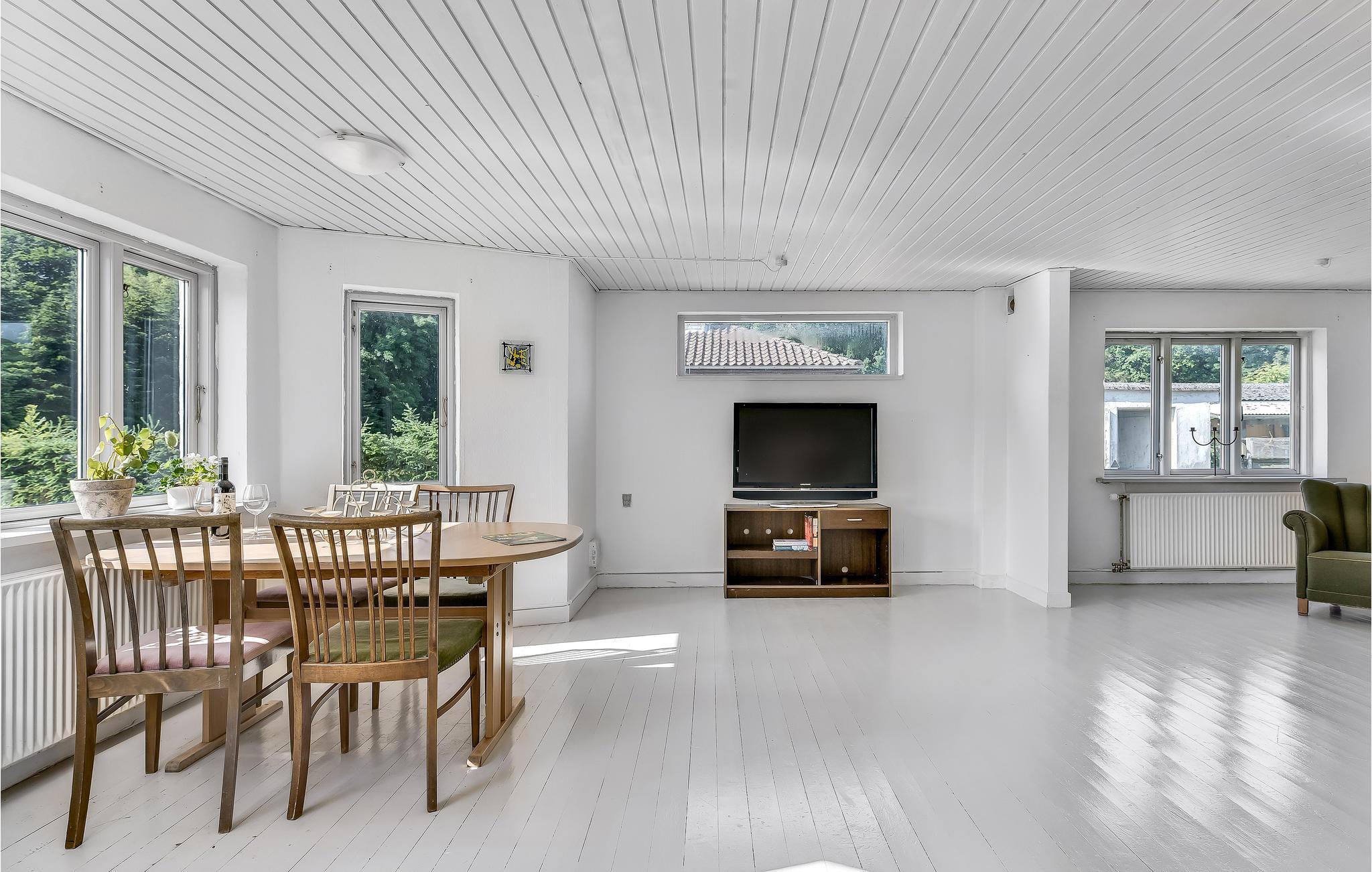 Kun en kort gåtur fra stenstranden inviterer dette moderne indrettede feriehus jer ind i de lyse værelser. Brug træskeen i det fuldt udstyrede køkken, og efter lange kystvandringer kan I forstærke jer med solide gryderetter ved spisebordet med udsigt over landskabet. Find jer godt til rette i sofaen, hel jer til en spændende bog eller organiser en hyggelig spilleaften.
