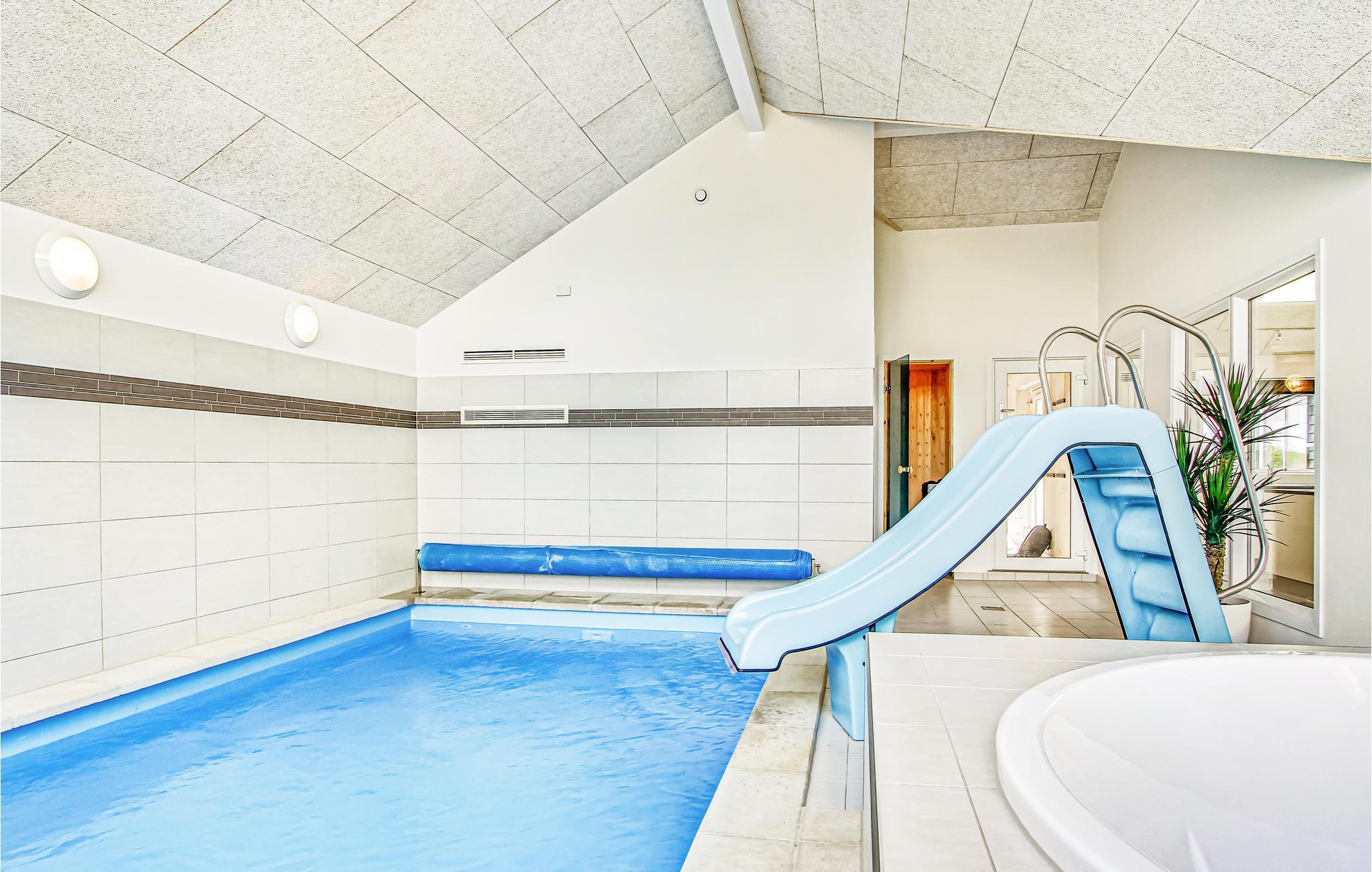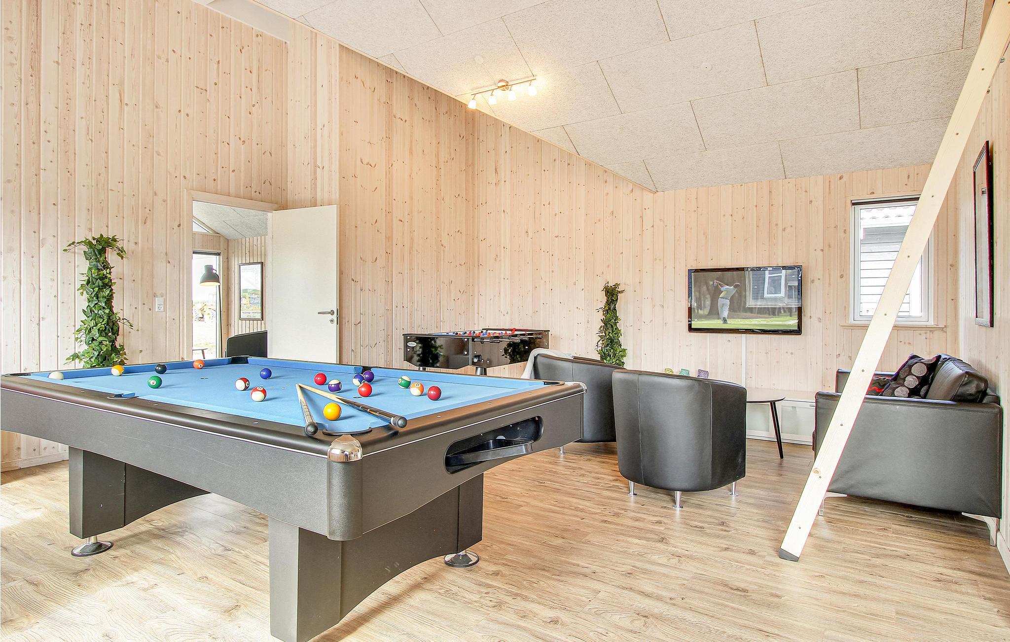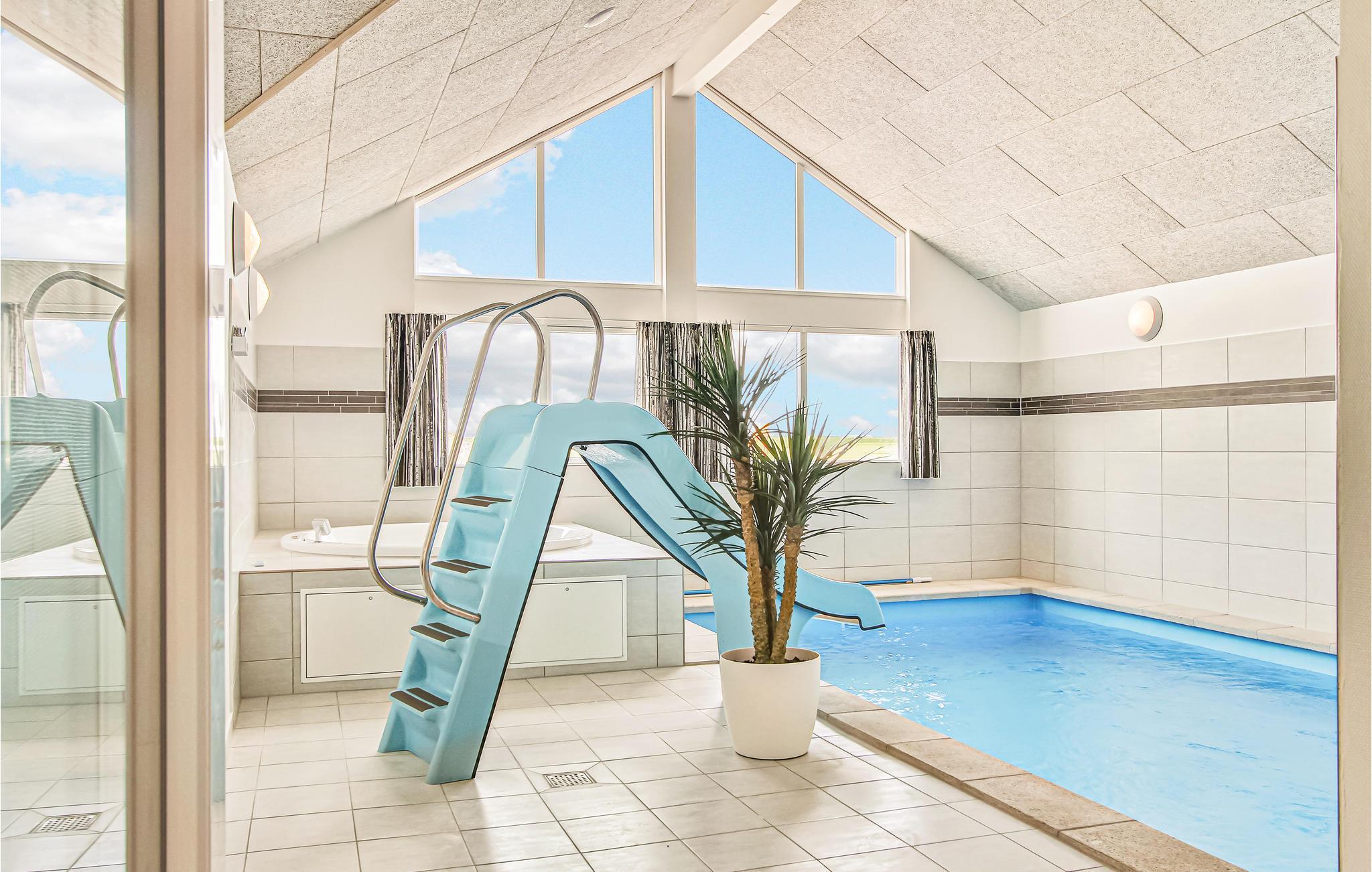 Flot feriehus med stor pool, aktivitetsrum og tæt på familievenlig sandstrand i naturskønne omgivelser.