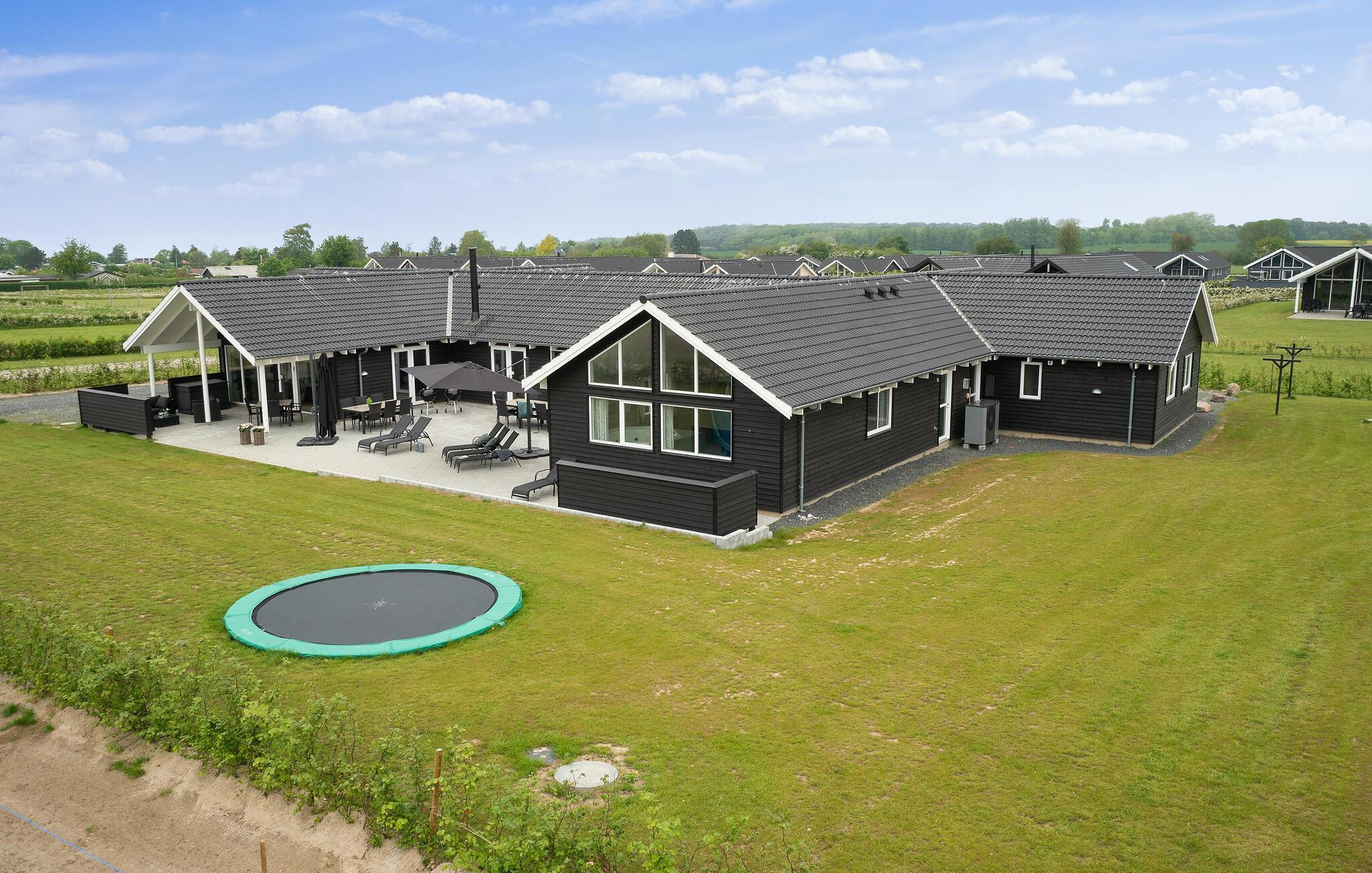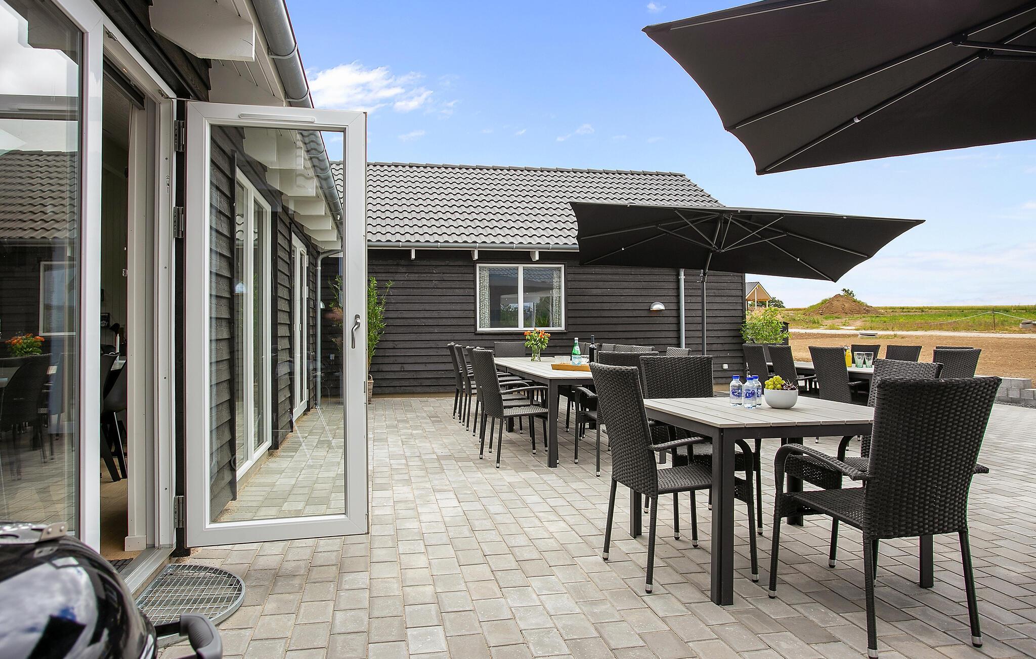Udearealet byder på en stor sydvestvendt terrasse med masser af siddepladser og grillfaciliteter. For børnene er udeområdet et rent slaraffenland med en stor udendørs legeplads med trampolin, legetårn, fodboldmål og egen basketballbane, så ingen kommer til at kede sig.