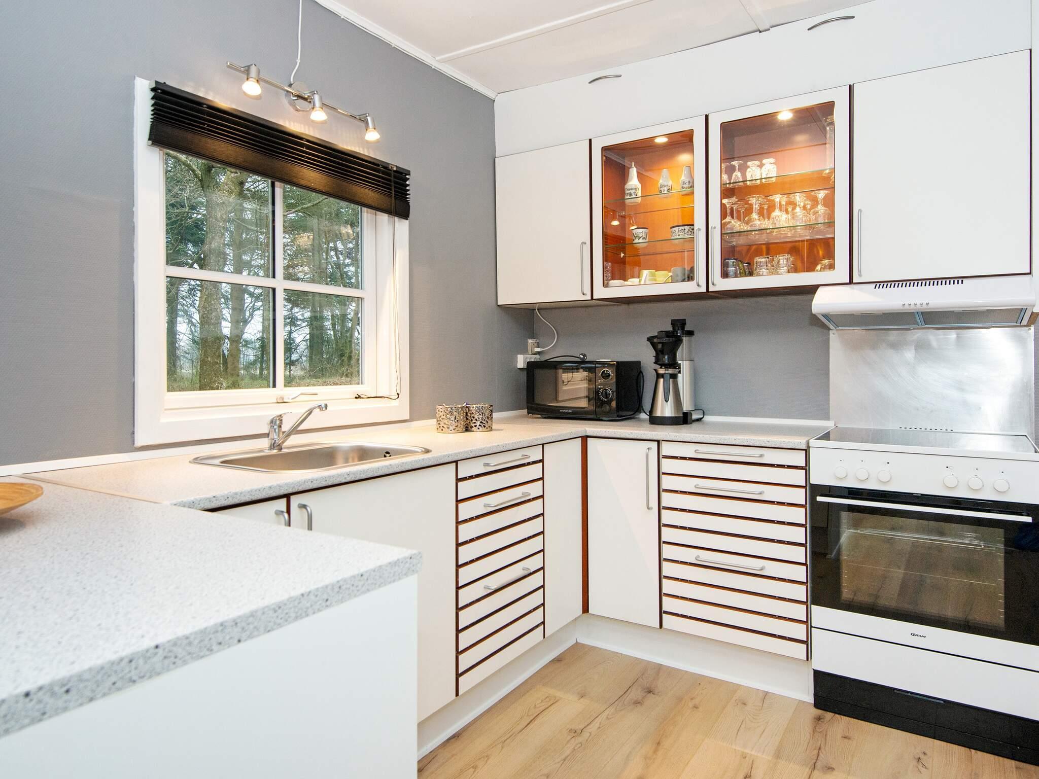 Sommerhuset er holdt enkelt med en åben planløsning. Der er åbent køkken/alrum med brændeovn, to soveværelser samt badeværelse med toilet og bruseniche også en udendørs bruser er installeret. Der er installeret en energibesparende varmepumpe i stuen, som også kan køle på varme sommerdage. Der er tv med parabol samt trådløst internet til rådighed. Til børnene er der både gynger, og rutchebane.