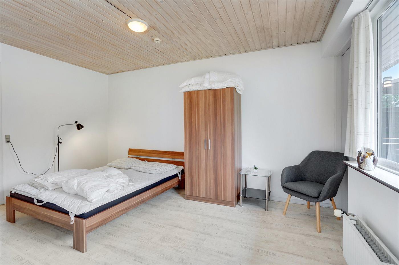 Der er i alt 1 soveværelse. Sovepladserne fordeler sig på: 2 sovepladser i dobbeltseng. 2 sovepladser i sovesofa (dobbelt). 2 af disse sovepladser befinder sig i stuen. Derudover er der 1 stk. barneseng.
