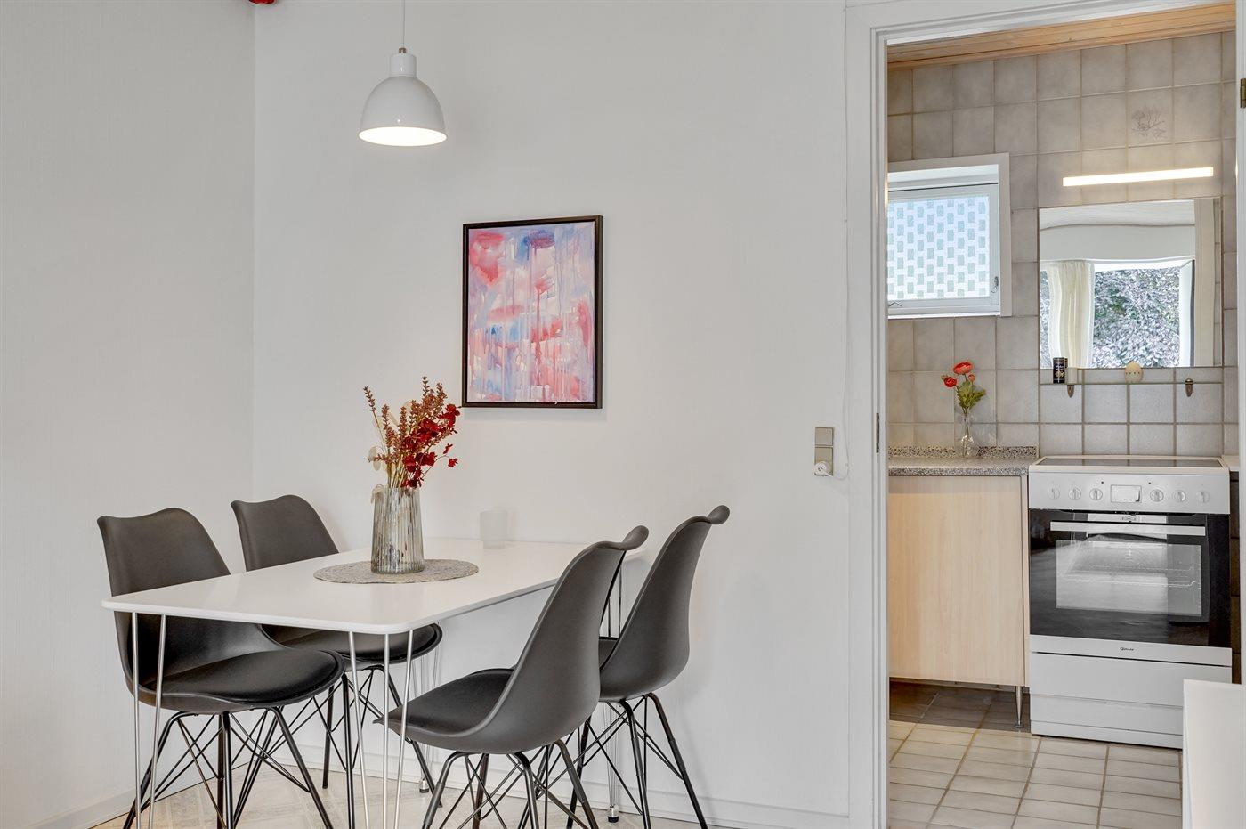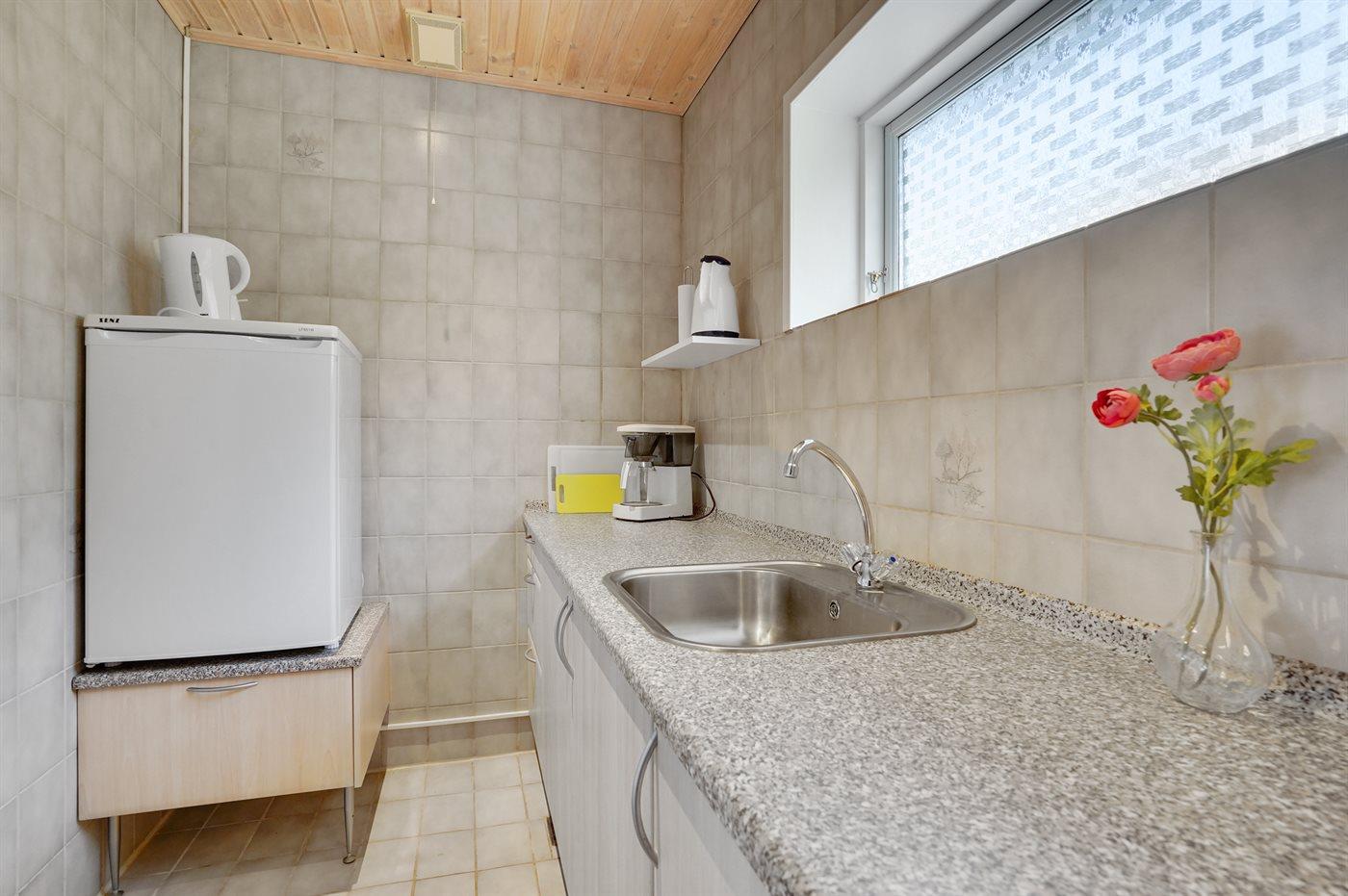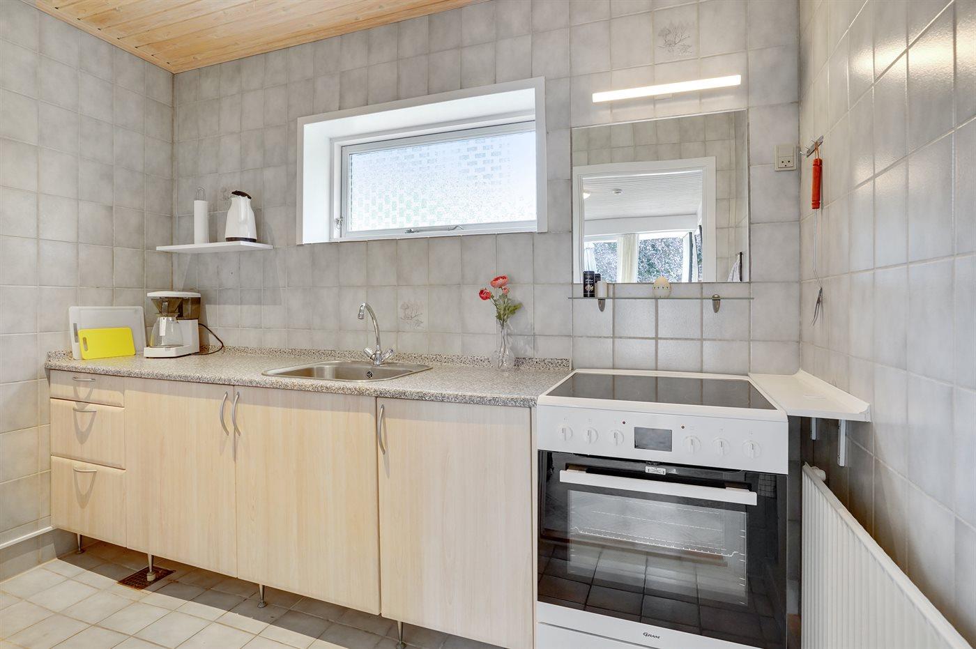 Køkkenet er udstyret med 1 køleskab. Der er 4 elkogeplader, bageovn.