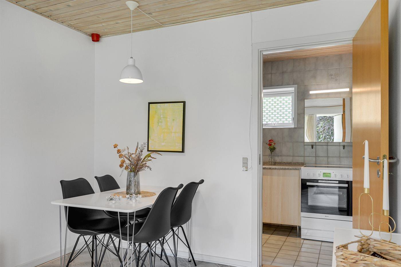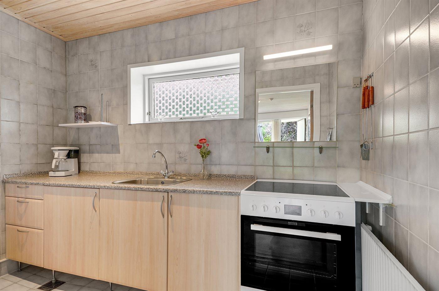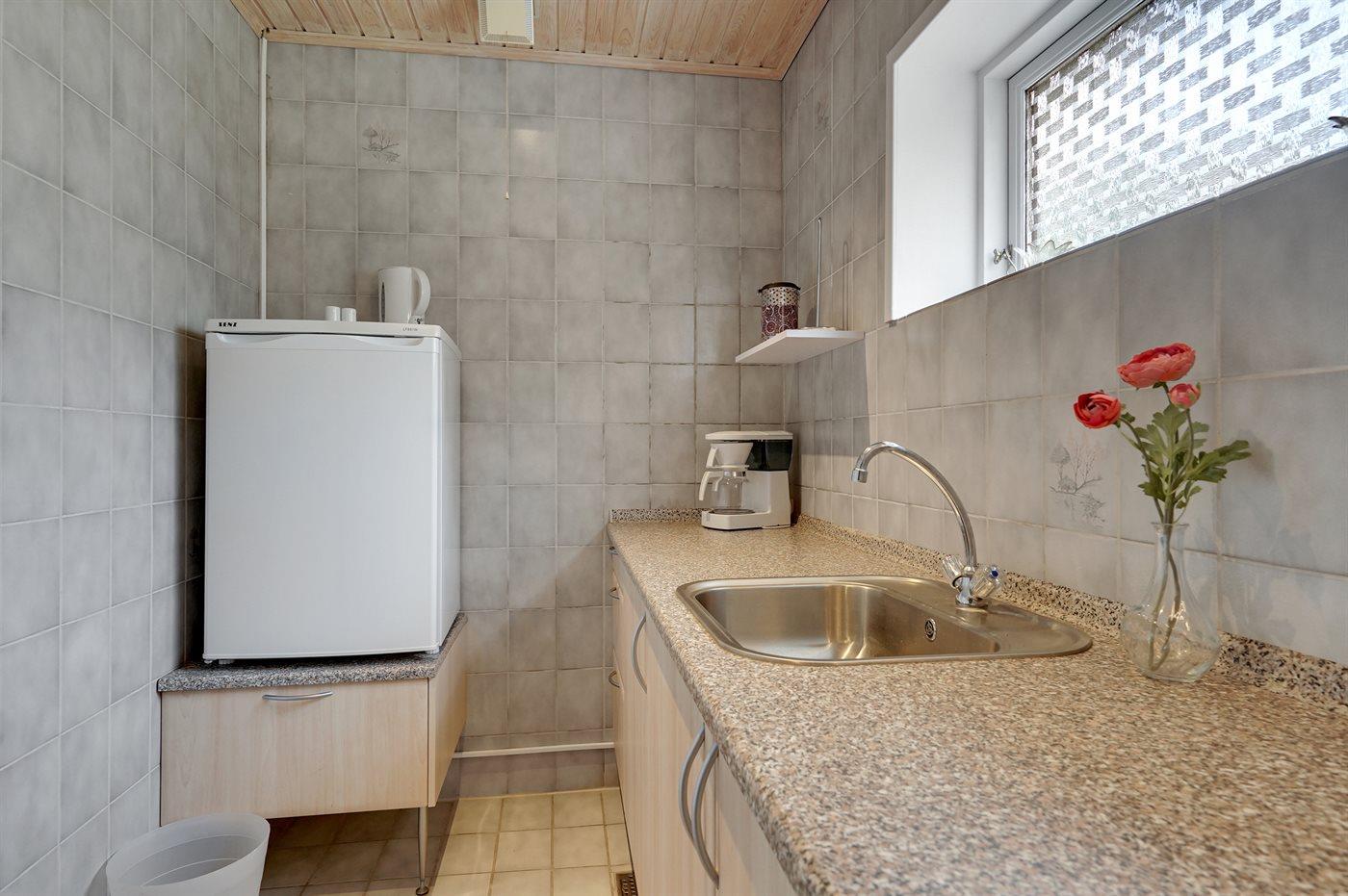 Køkkenet er udstyret med 1 køleskab. Der er 4 elkogeplader, bageovn.