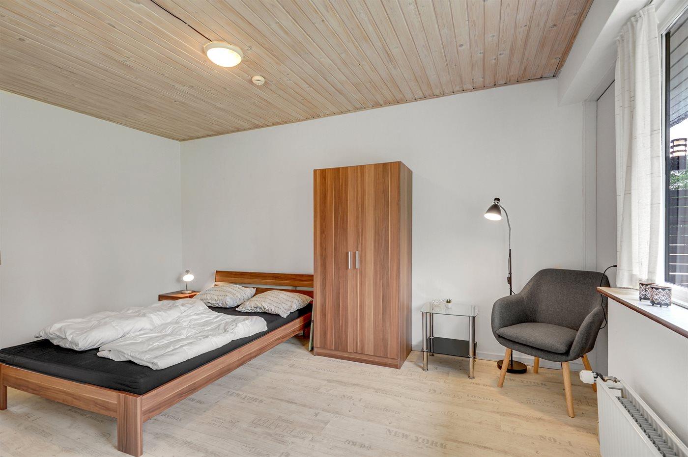 Der er i alt 1 soveværelse. Sovepladserne fordeler sig på: 2 sovepladser i dobbeltseng. 2 sovepladser i sovesofa (dobbelt). 2 af disse sovepladser befinder sig i stuen. Derudover er der 1 stk. barneseng.