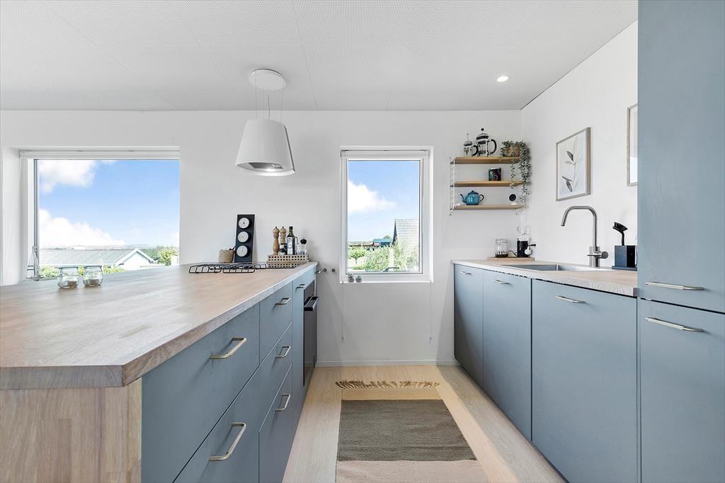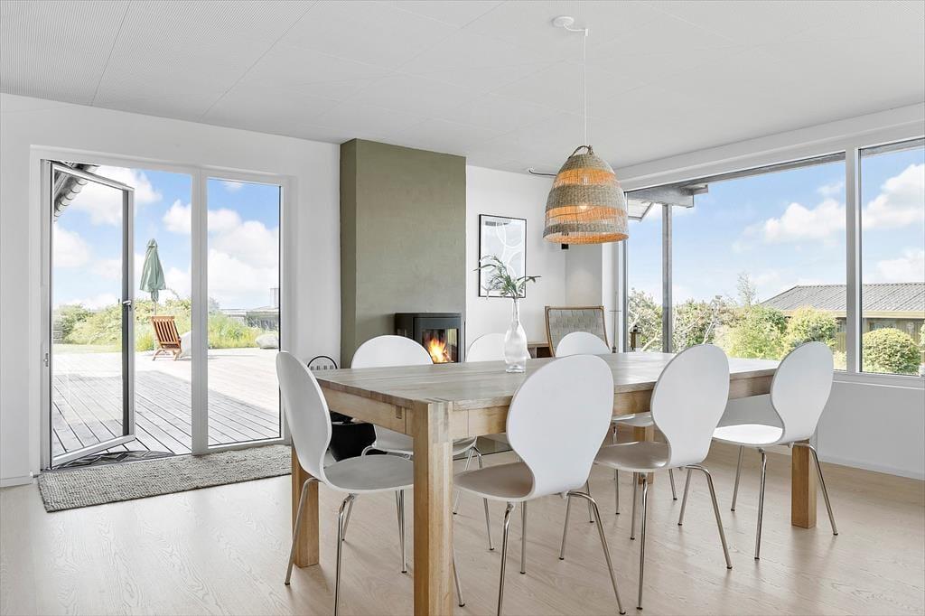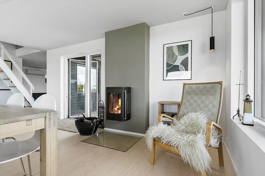 I dette hyggelige og moderne feriehus på Zion 18 bliver I budt varmt velkommen i lyse og indbydende rammer, hvor der er tænkt på både komfort og feriestemning. Det åbne opholdsrum med køkken, spiseplads og stue er hjertet i huset – her kan I samles til brætspil, madlavning og lange samtaler i stearinlysets skær. Store vinduespartier inviterer lyset og naturen indenfor, og den skønne brændeovn spreder både varme og hygge på kølige dage.