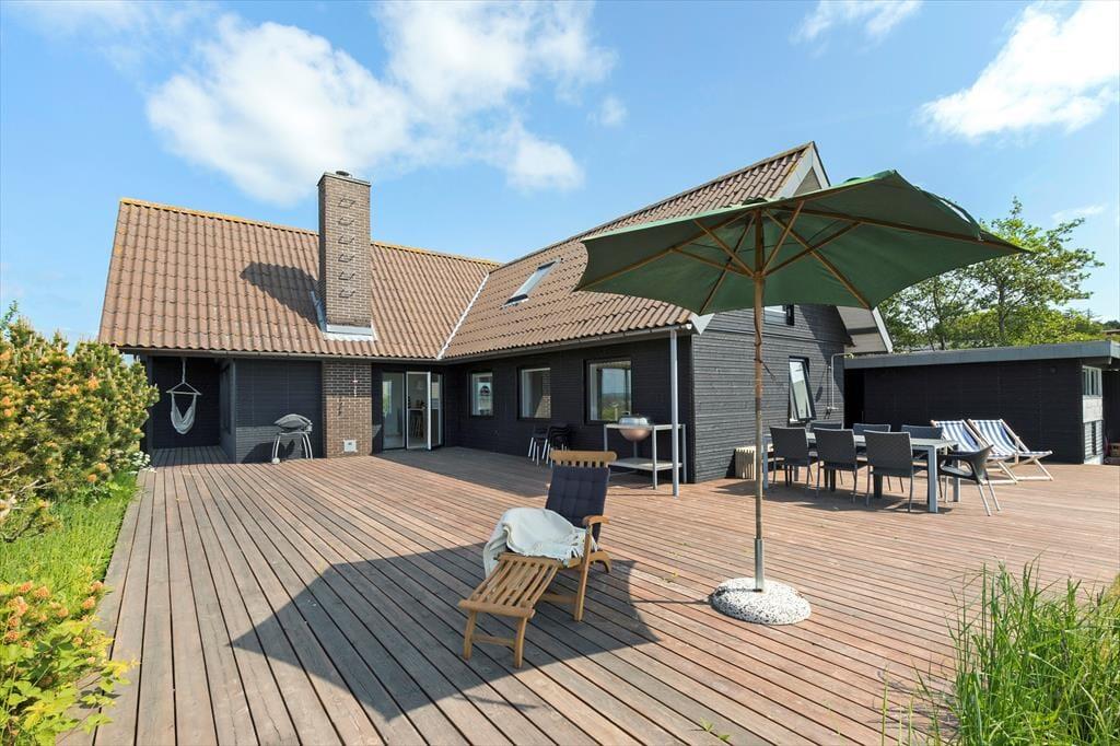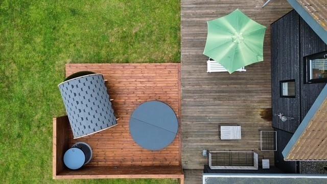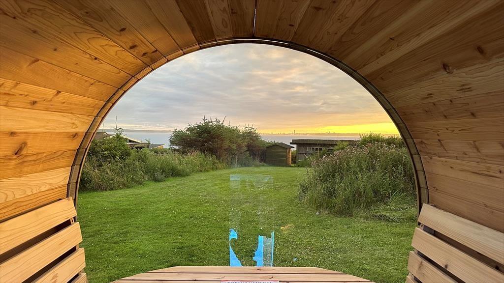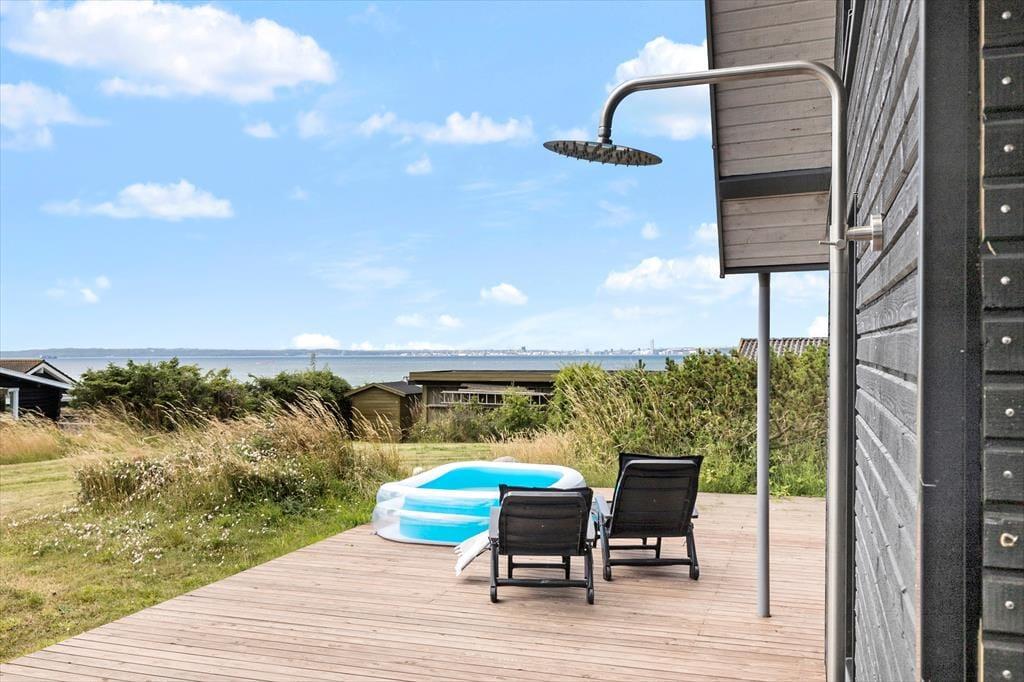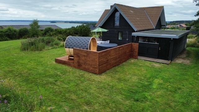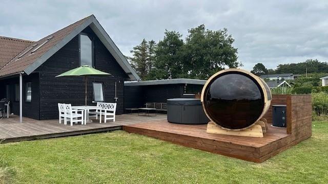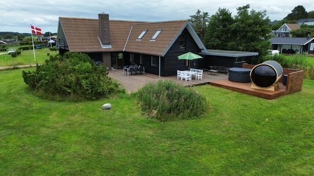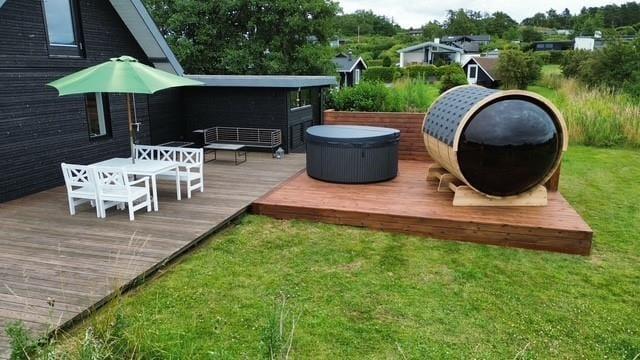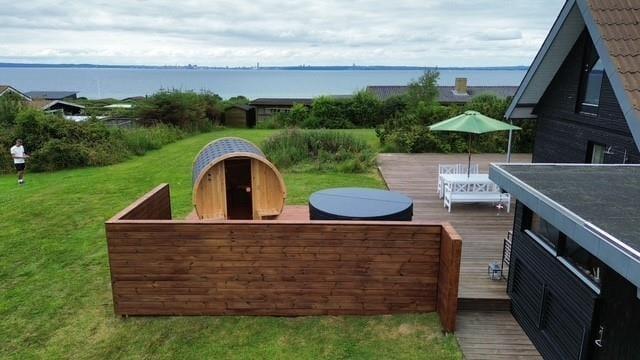Udenfor venter en dejlig, overdækket træterrasse, hvor morgenkaffen smager lidt bedre i solen, og grillmaden dufter ekstra godt, når den nydes i det fri. Terrassen er delvist afskærmet og giver god læ – perfekt til både solbadning, afslapning med en god bog eller et glas vin i aftensolen. Her kan du også tænde op for udespaen og efterfølgende gå i koldvandskaret. Så kan du aflsutte i den meget flotte udesauna med vinduet ud mod vandet. Grunden er grøn og indbydende med god plads til leg og spil for både børn og barnlige sjæle, og I er omgivet af rolig natur og fuglefløjt. Her er det let at finde ferieglæden og trække vejret helt ned i maven.