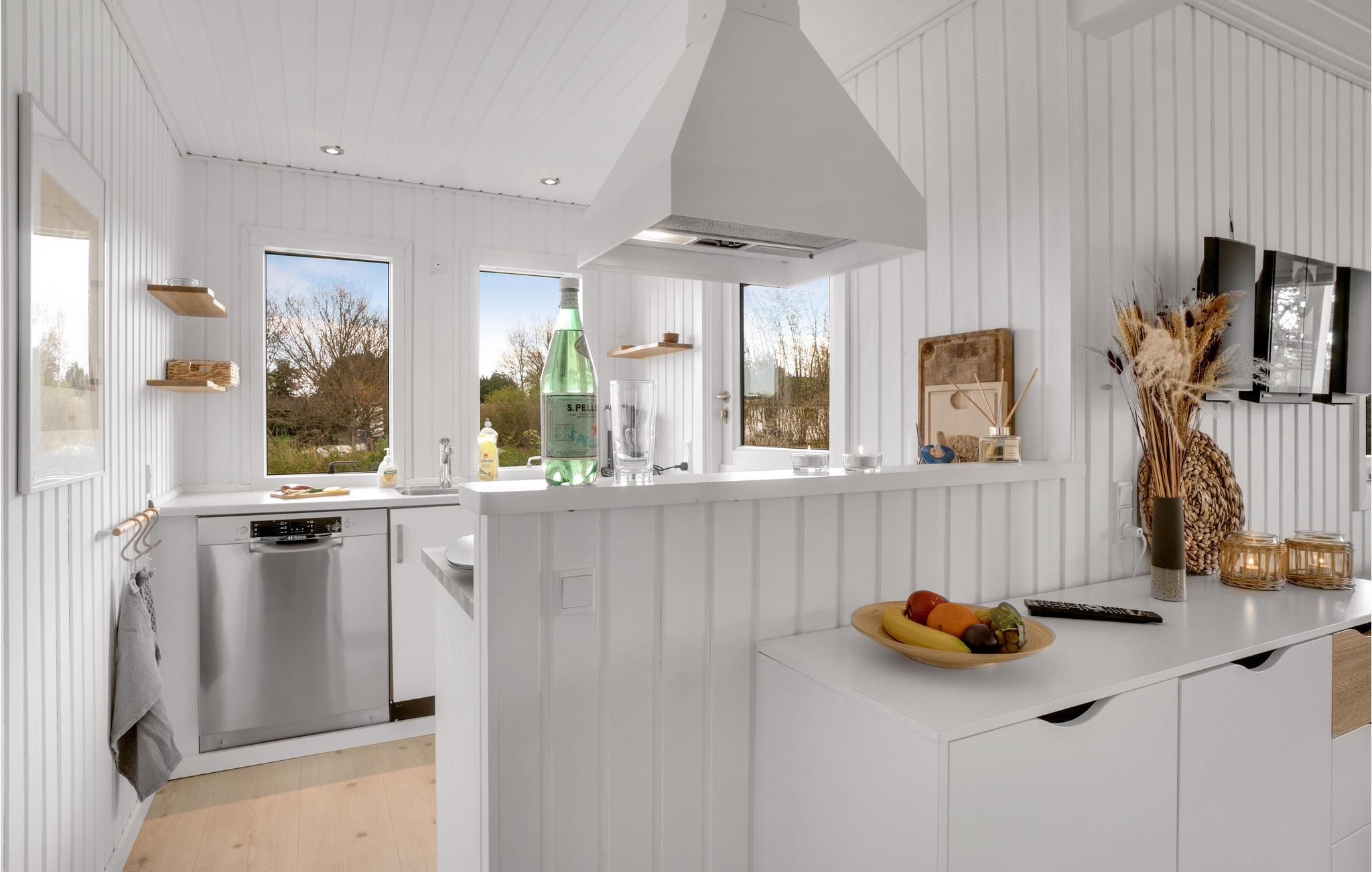 Dette sommerhus inviterer til en oplevelsesrig ferie i dejlige naturomgivelser tæt på stranden. De hvide trævægge, det hvide træloft og det lyse gulv kombineret med interieur i jordfarver giver sommerhuset sin hyggelige varme charme. Her kan I nyde en smuk udsigt over haven, mens I laver mad og hygger på den store hjørnesofa. Om aftenen kan I tænde op i brændeovnen og spille matador til flammernes stille knitren.