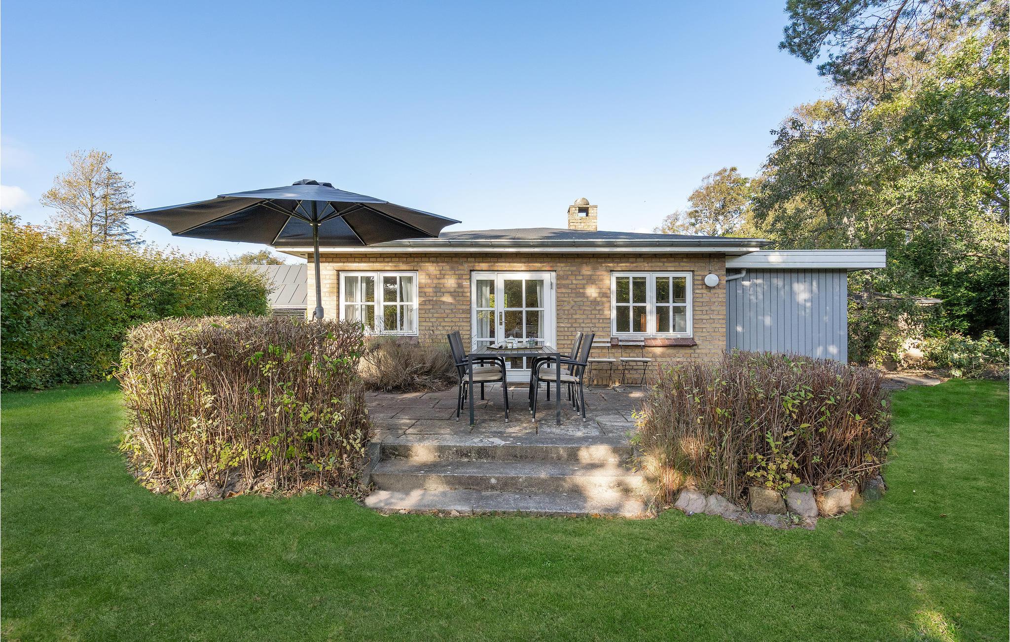 Hyggeligt gult murstenshus ved Skødshoved Strand med terrasse og natur lige udenfor døren.