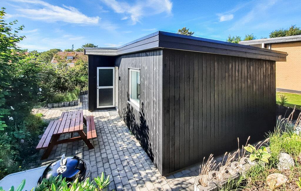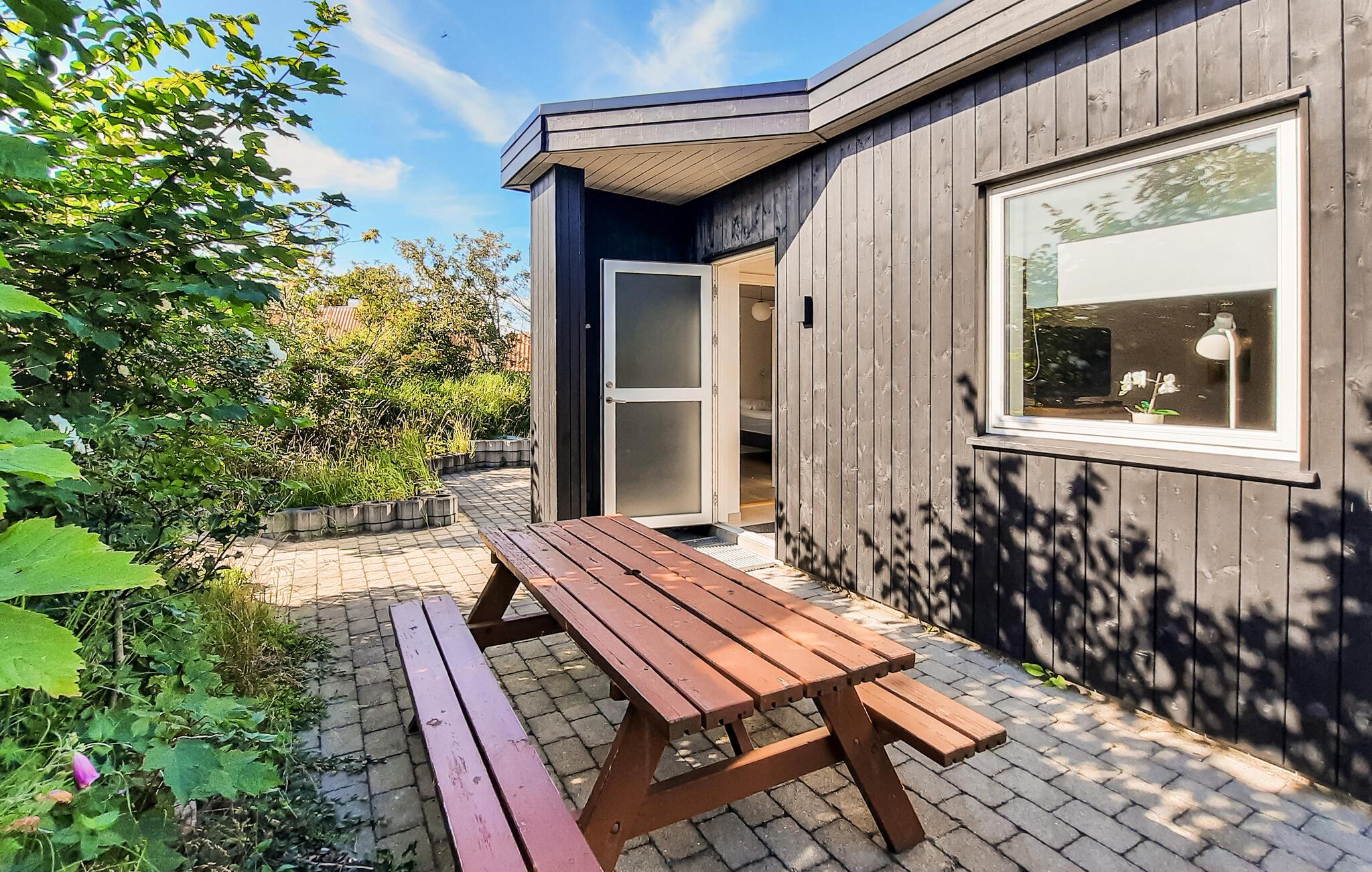 Hyggeligt træsommerhus nær Skagen Strand med terrasse og have, perfekt til en afslappende ferie tæt på vand og by.