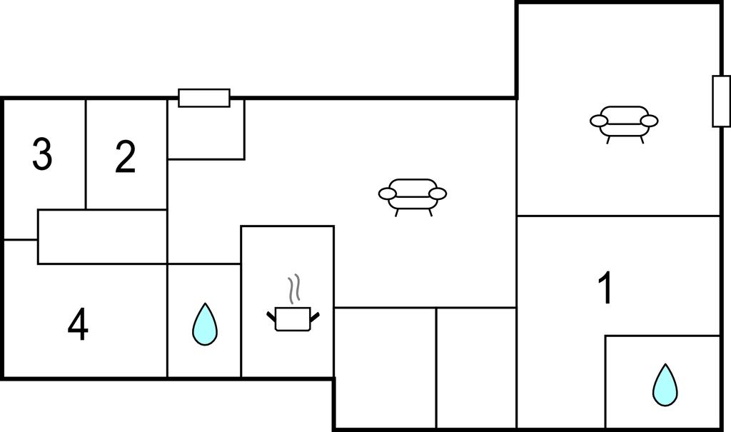 Huset har fire gode soveværelser og to badeværelser. I den åbne stue med store vinduer kan I slappe af foran pejsen. Herfra er der også udgang til terrassen bag huset. Nyd solen, mens I spiser dagens måltider. Det ene badeværelse har kun en håndbruser i badekarret.