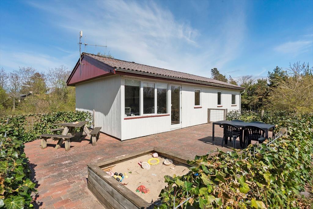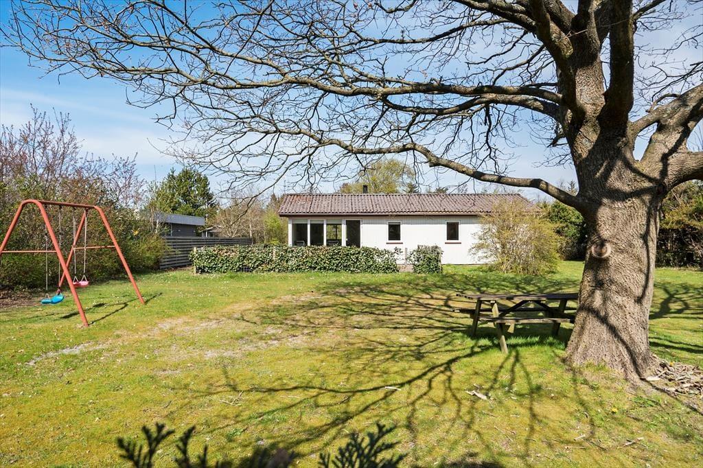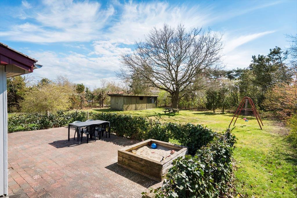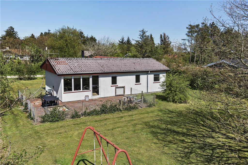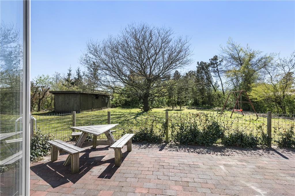 Fra stuen har I direkte adgang til en sydvendt og dermed dejligt solrig terrasse. Der er hegn rundt om terrassen, hvilket er rart, hvis I har hund med på ferie, og til de små børn er der sandkasse og gynger på grunden. Græsplænen er også god at lege og spille havespil på– med mindre I hellere bare vil slappe af ved bord-bænke-sættet midt i det grønne.