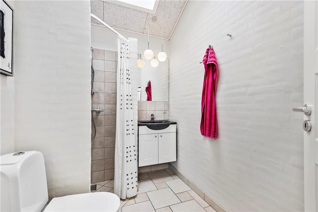 Takket være ovenlysvinduer er der et skønt lysindfald i huset, som med sine 105 m2 byder på god plads. Der er loft til kip i køkken-alrummet, hvorfra der er fint kig til alt det grønne udenfor. Køkkenet er i åben forbindelse med opholdsafdelingen kun adskilt af en ”bardisk”. Fra alrummet er der direkte udgang til terrassen og haven, som på de lune sommerdage bliver en naturlig udvidelse af opholdsarealet. Huset indeholder fire soverum, og hertil kommer to badeværelser, hvoraf det ene er udstyret med sauna.