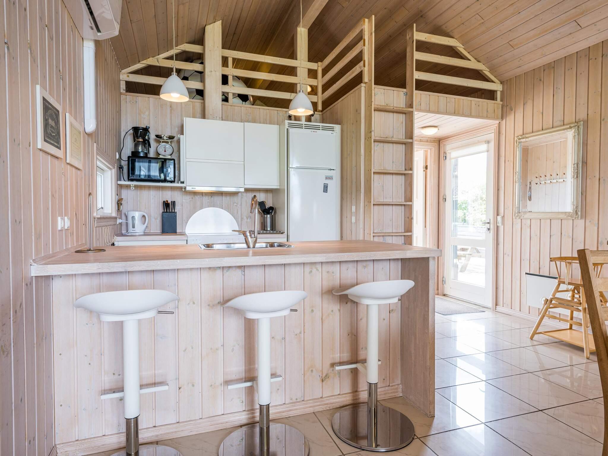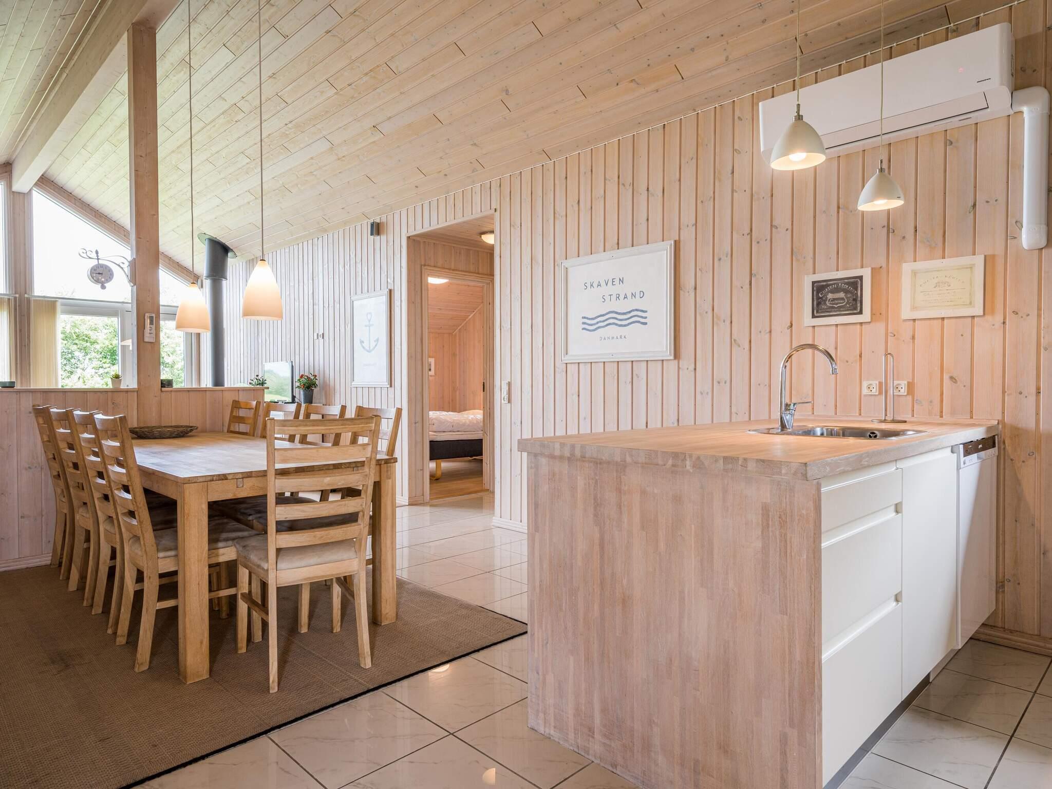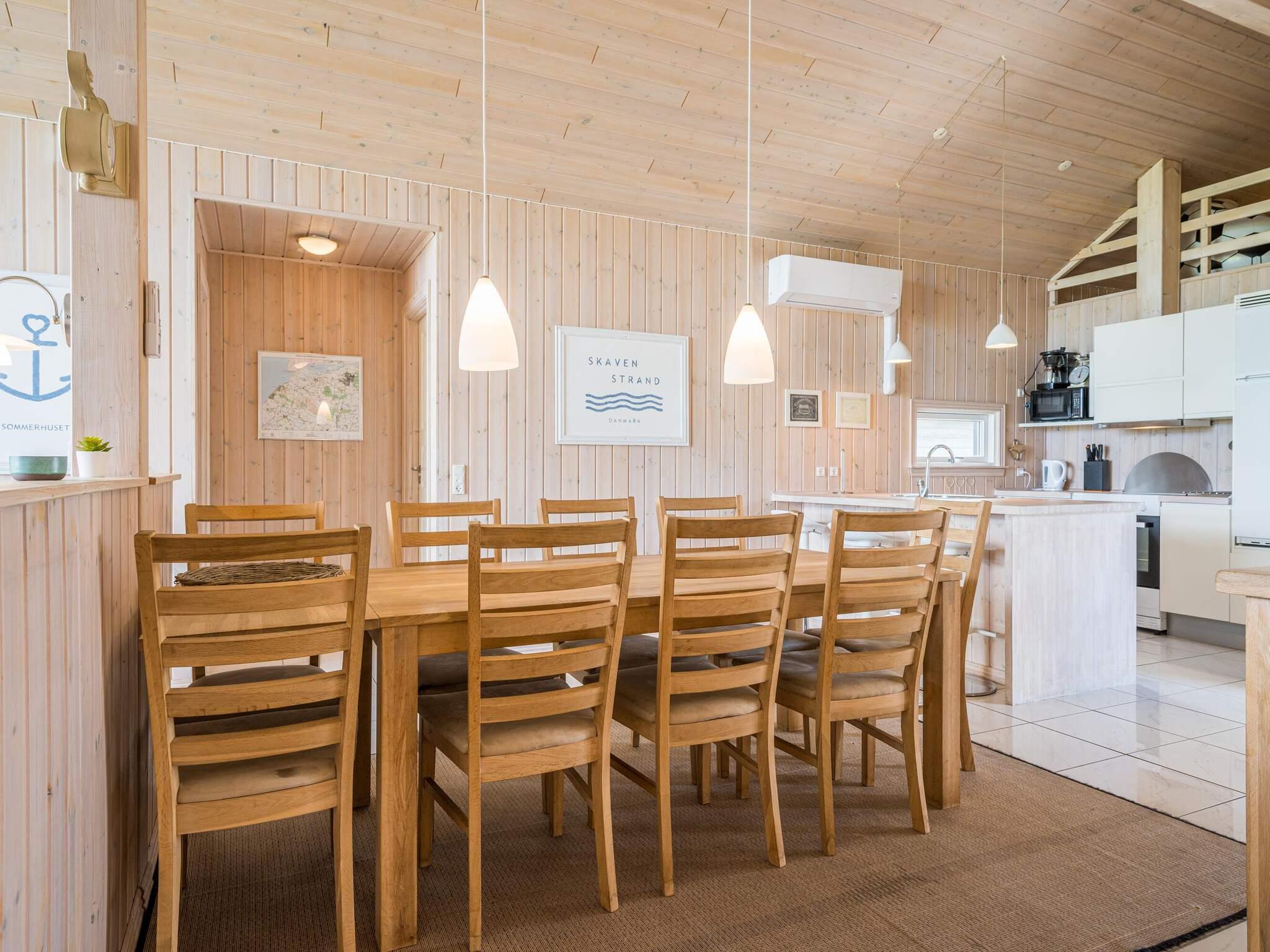 Super hyggeligt sommerhus til 8 personer i Skaven Strand! I dette sommerhus ligger køkkenet i forlængelse med den hyggelige stue med brændeovn. Fra stuen er der udgang til en dejlig stor træterrasse, hvor solen rigtig kan nydes. I sommerhuset finder du to badeværelser - det ene er et lækkert badeværelse med både spa og sauna. Derudover er der 4 fine soveværelser - alle med dobbeltsenge. I sommerhuset er der også en hems, som børnene kan bruge til at hygge og lege på.