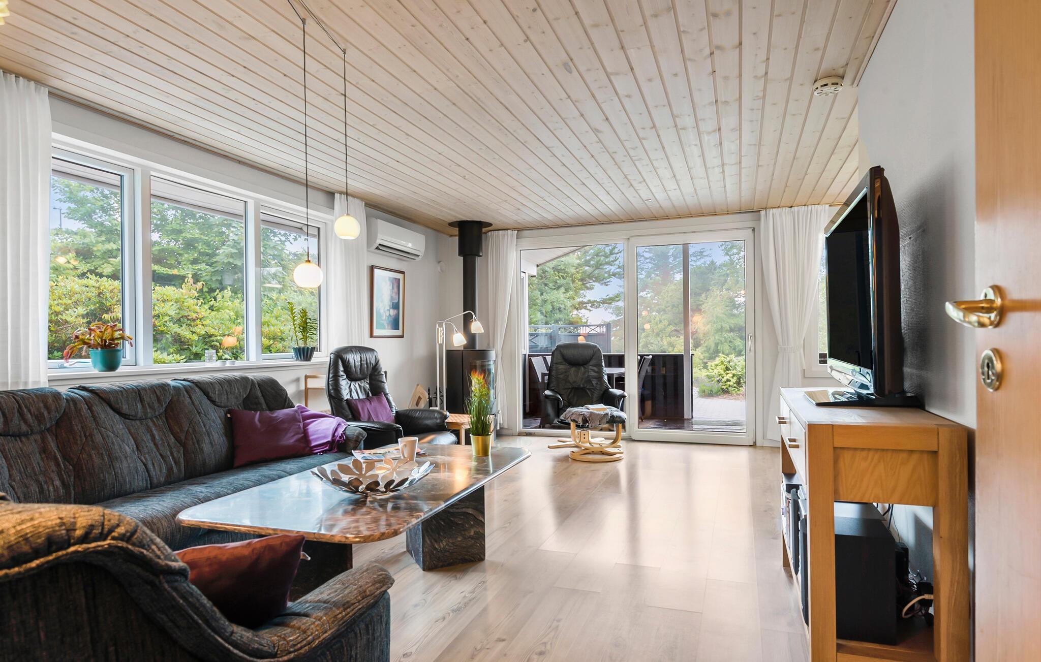 Hyggeligt feriehus med fjordudsigt, flere terrasser og direkte adgang til vandet ved Skaven Strand.