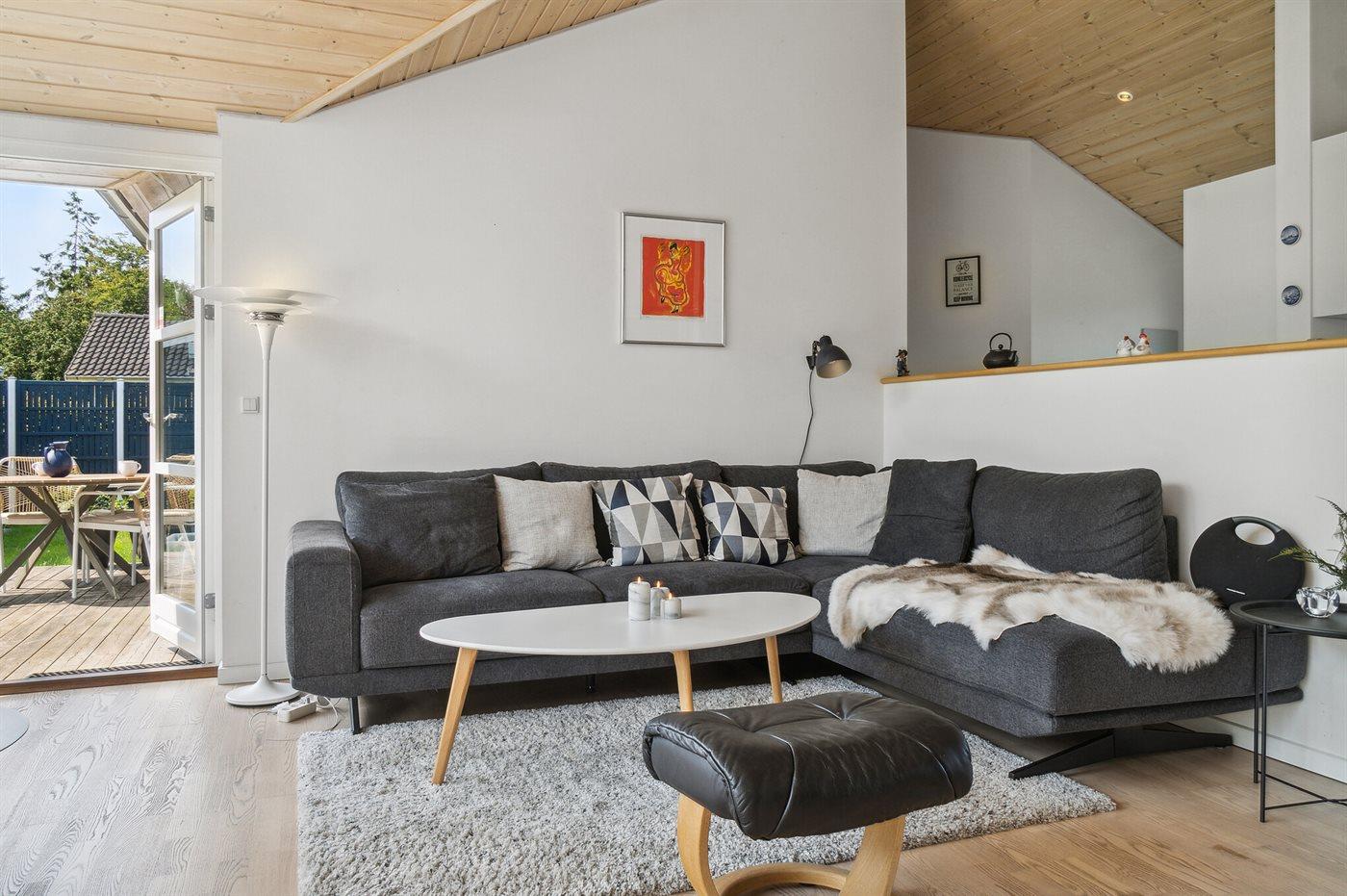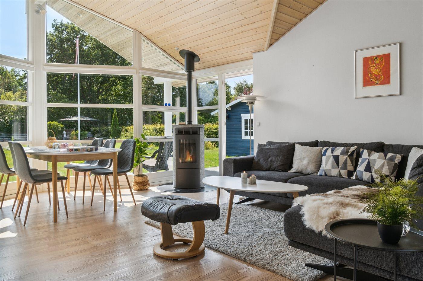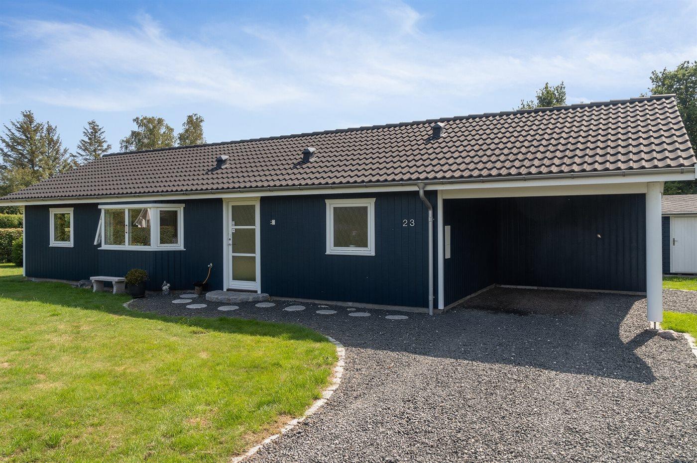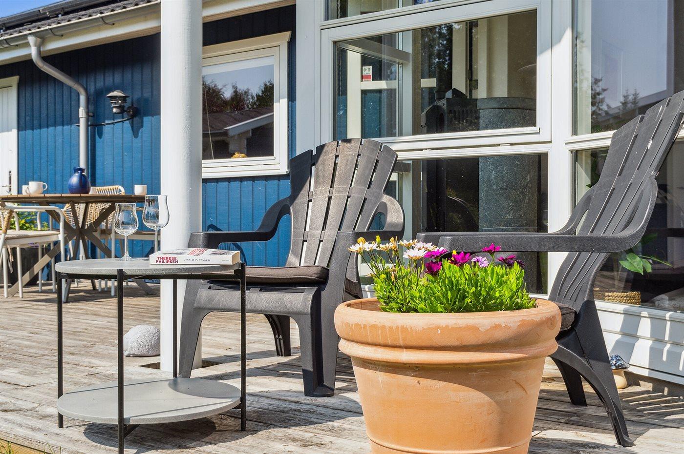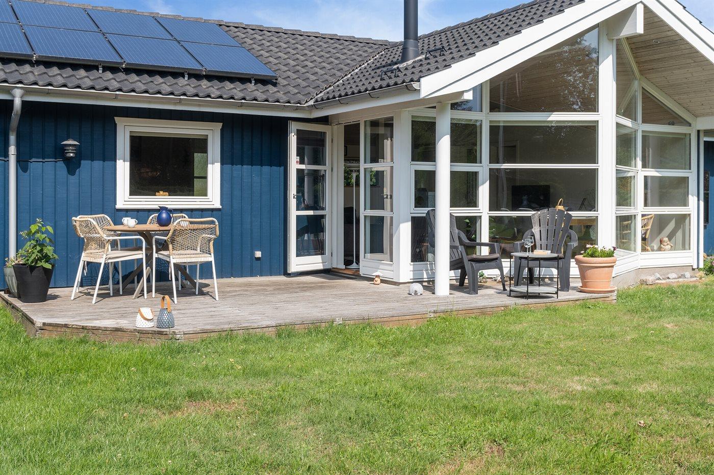 Ferieboligen er beliggende på en 1200 m² stor naturgrund. Der er 200 m til fjorden. Nærmeste forretning er beliggende i en afstand af 3000 m. Til ferieboligen hører åbent terrasseareal. Der er redskabsrum. Sandkasse. Trampolin. Bålsted. Grill til rådighed. Der er carport til rådighed. Parkering ved ferieboligen.