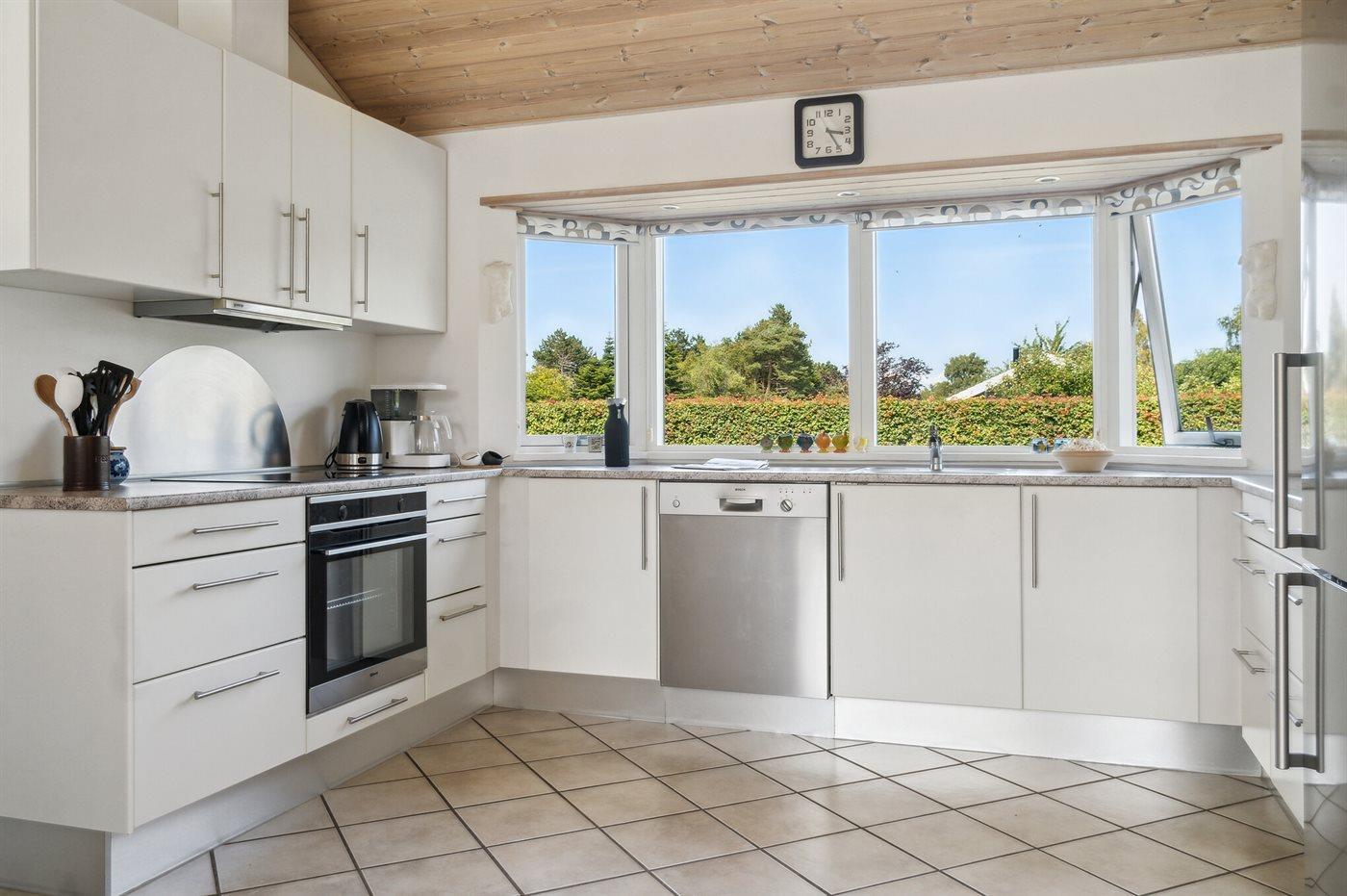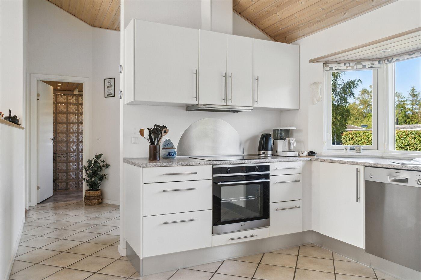 Køkkenet er udstyret med 1 køleskab. Der er 4 keramiske kogeplader, varmluftovn, mikrobølgeovn samt opvaskemaskine Der er gulvvarme i køkkenet.