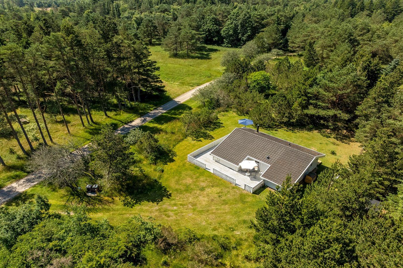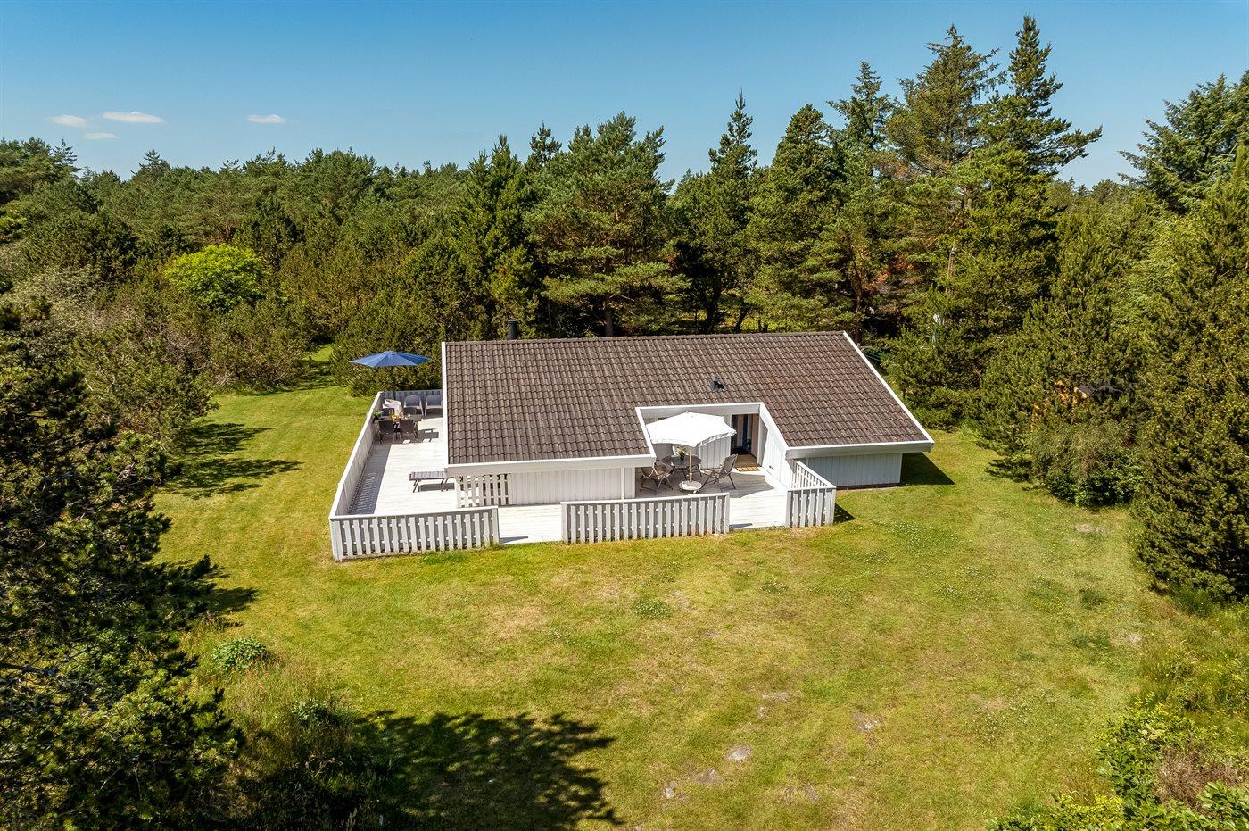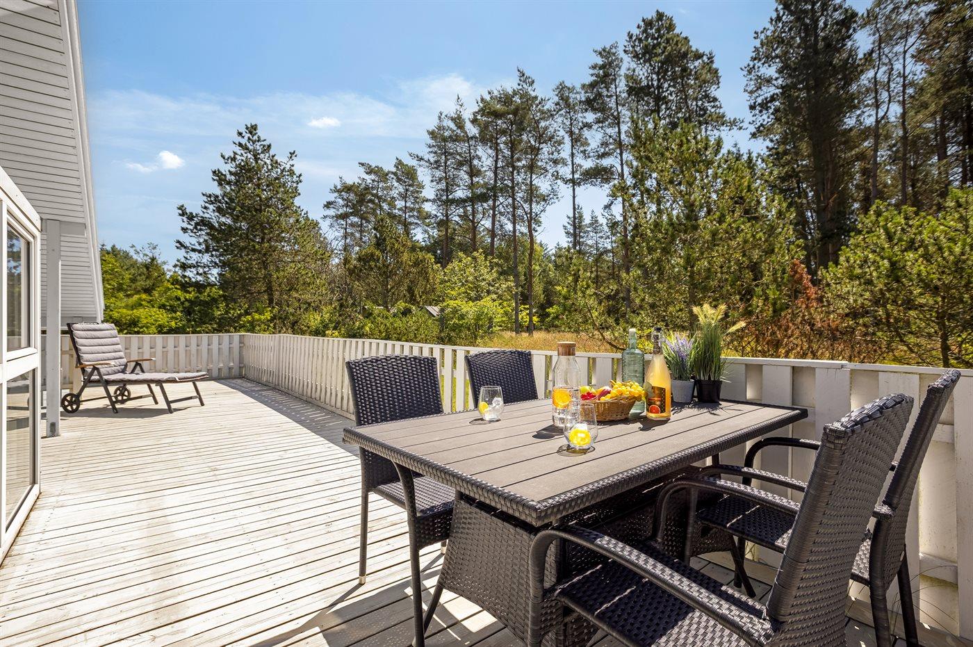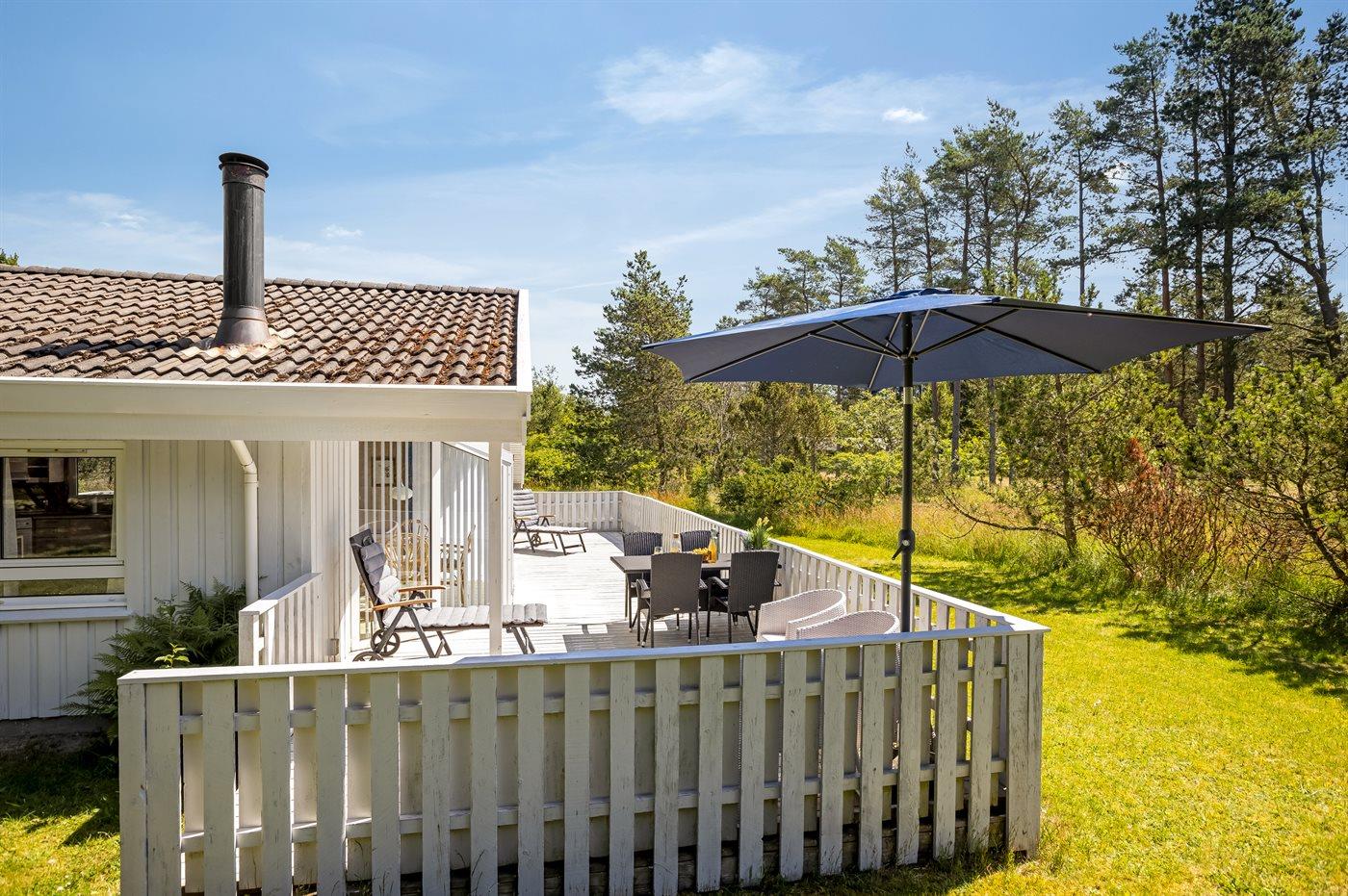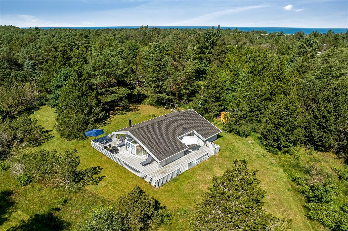 Tæt ved en af Vesterhavets bedste badestrande ligger dette pragtfulde sommerhus i træ. Huset er bygget i 1994 på en stor, børnevenlig naturgrund med høje træer. Til huset hører en stor, åben samt en overdækket terrasse med havemøbler og gasgrill. Vægge og lofter er beklædt med fyrrustik.