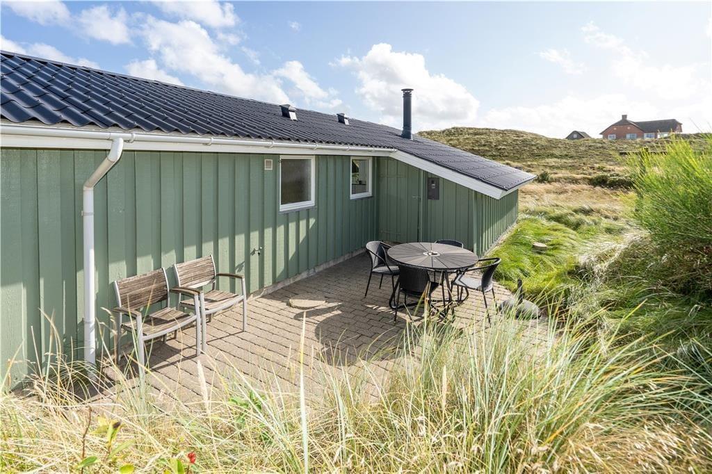Omkring huset smyger sig hyggelige terrasser mod øst, syd og vest, og i løbet af dagen kan I flytte med solen rundt om huset og få det maksimale udbytte af sommerdagene. Her er god plads til at slappe af i solsengene og til at forkæle familien med lækkerier fra grillen. Huset ligger i læ fra en klit, og heroppe har I en skøn udsigt over Skodbjerges lyngklædte klitlandskab og fjordens vand. Naturgrunden byder også på et gyngestativ og en sandkasse til de yngste, og her er parkeringsplads til flere biler.