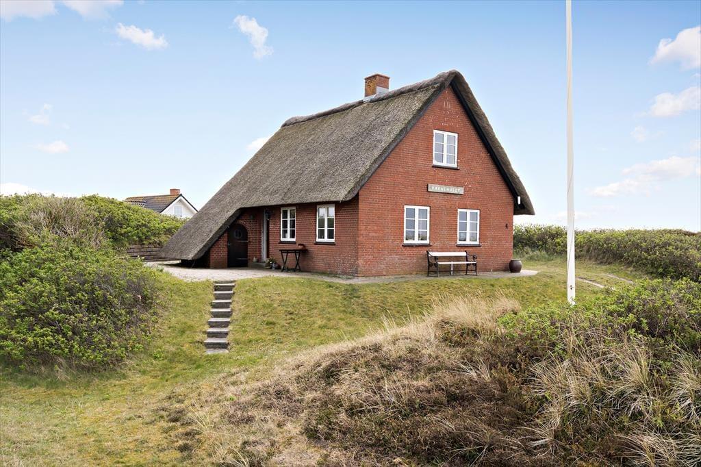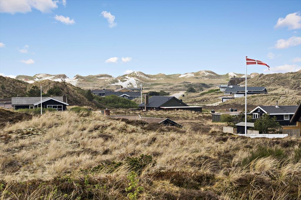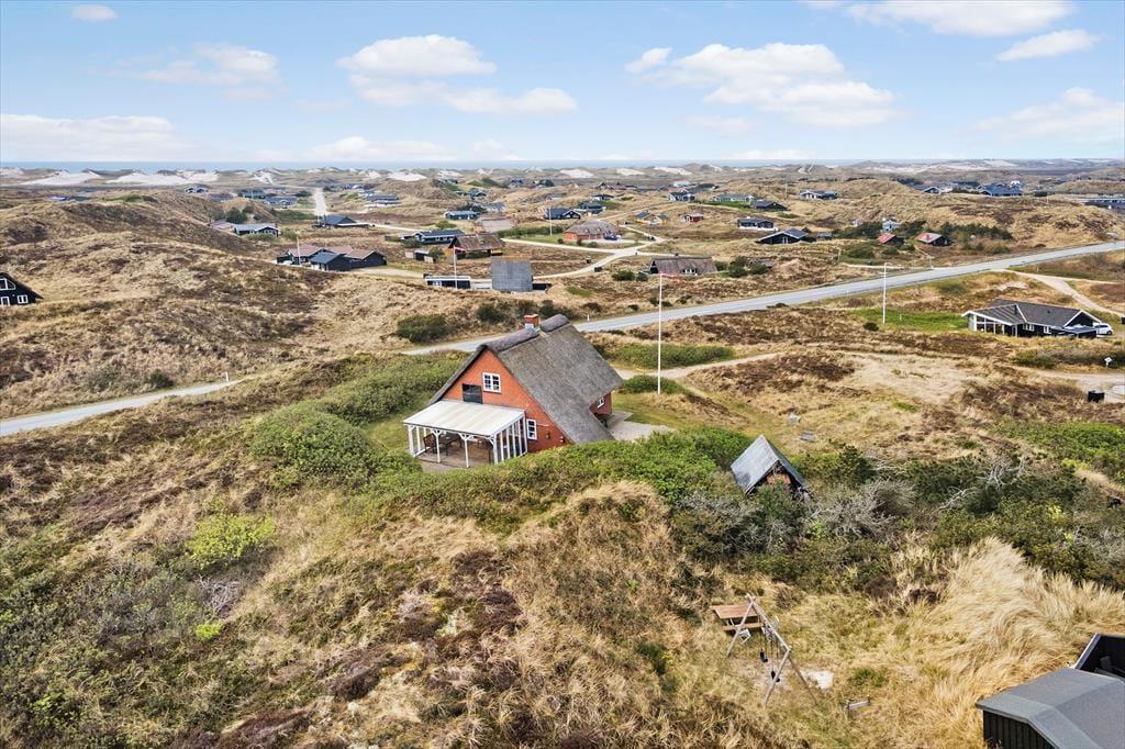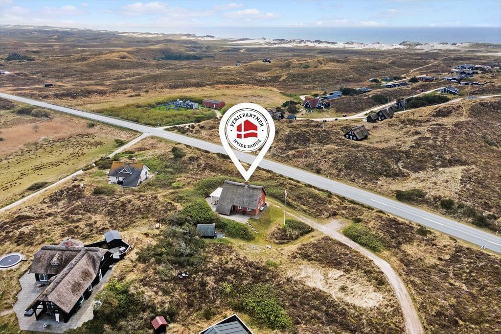 Feriehuset ligger på Hareklits højeste top, og derfor kan I glæde jer over en enestående og langstrakt udsigt. Mod øst strækker fjordens vandspejl sig over til de skovklædte bakker på modsatte bred, hvor Lønborg Kirkes hvide spir danner fikspunkt. Mod vest strækker Skodbjerges klithede sig ud mod “havbjergene”, hvorefter stranden og Vesterhavet tager over. Området inviterer til lange gåture, og cykelstien gennem klitlandskabet indbyder til hyggelige udflugter på den tohjulede. Købmanden i Bjerregård byder på dagligvarer og morgenbrød, og køreturen hertil tager kun fem minutter. Turen til Hvide Sande klares på ti minutter, og her finder I butikker, supermarkeder, gode fiskerøgerier og en bred vifte af spisesteder.