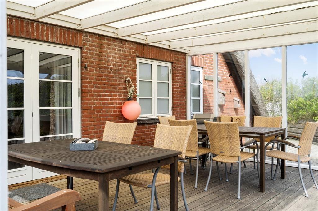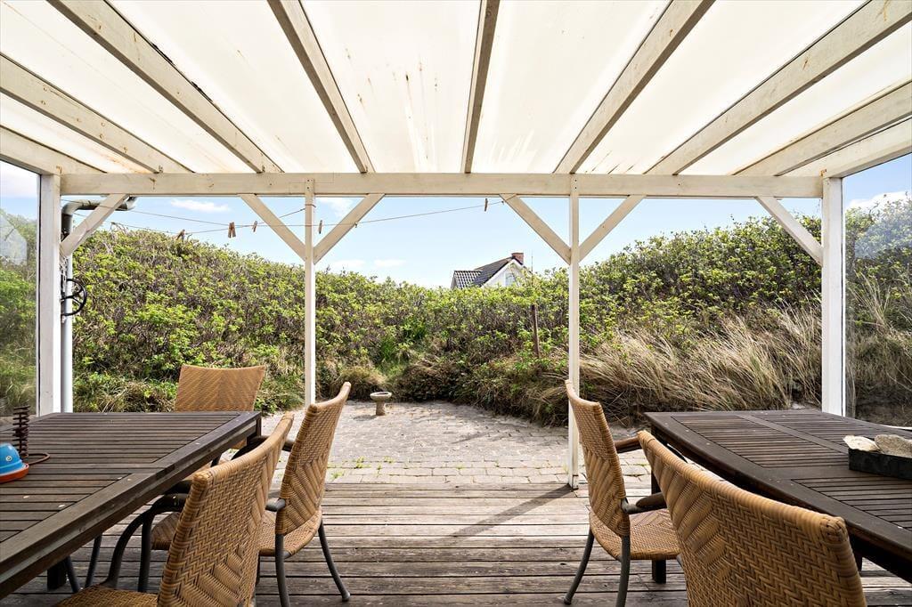 En åben terrasse mod øst og en overdækket mod syd giver gode muligheder for at servere måltider og kølige forfriskninger i det fri. Grunden er anlagt som en frodig, uforstyrret naturgrund, og her er god plads til parkering af flere biler.