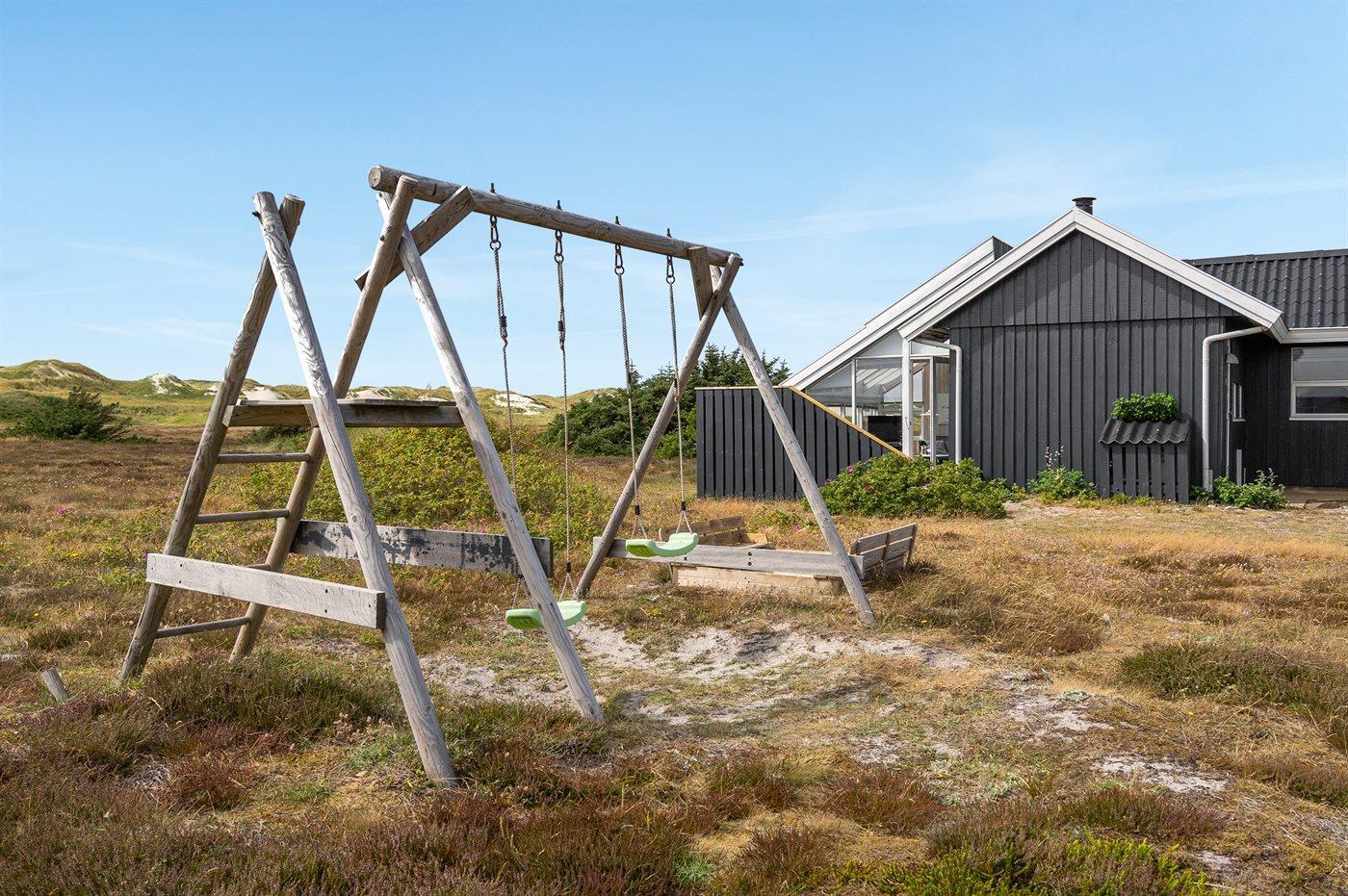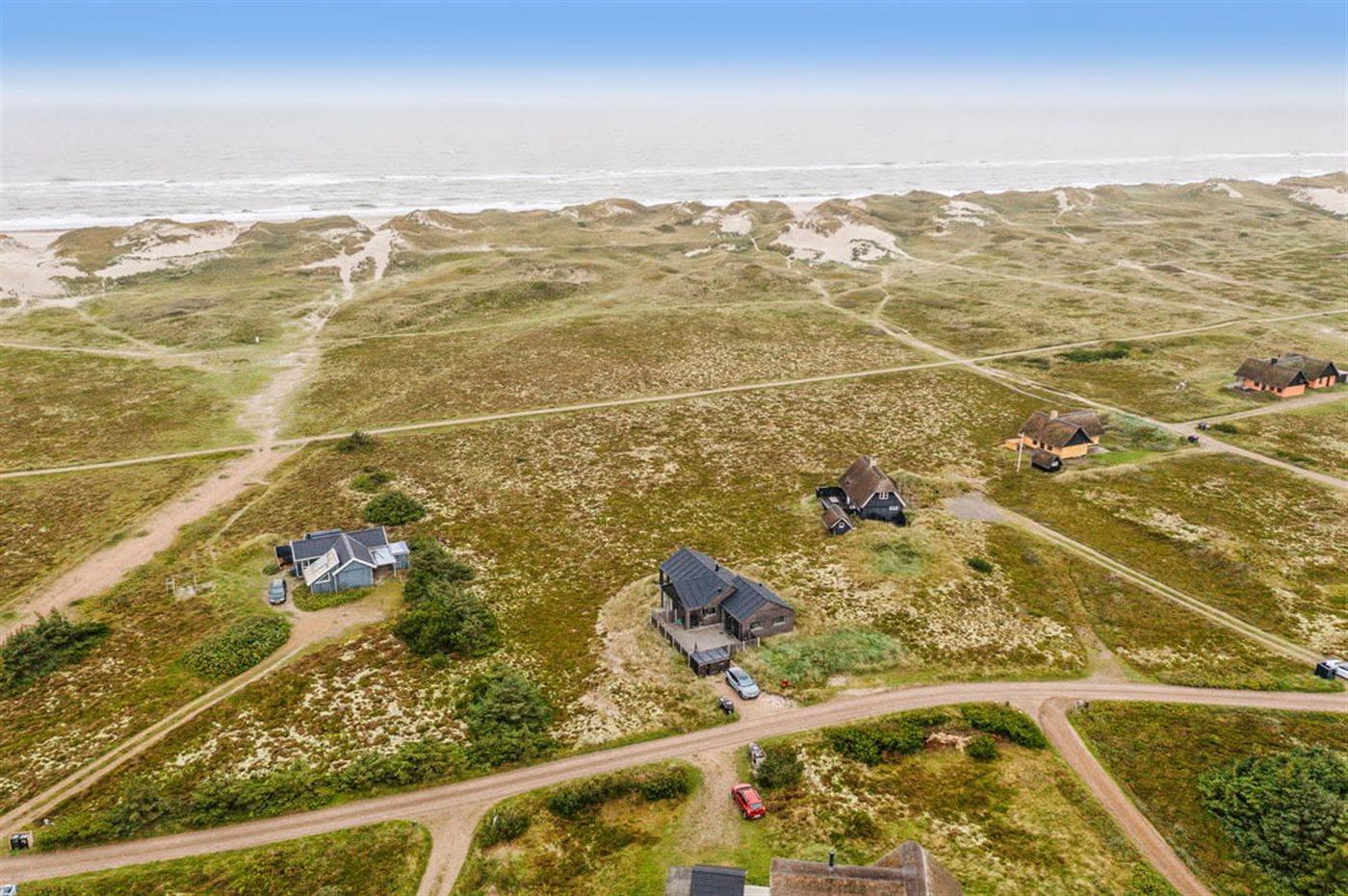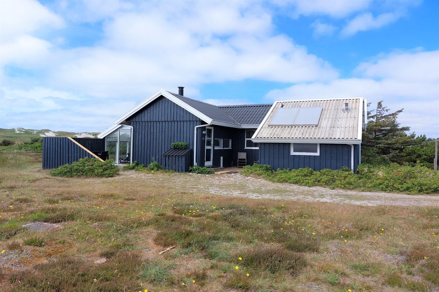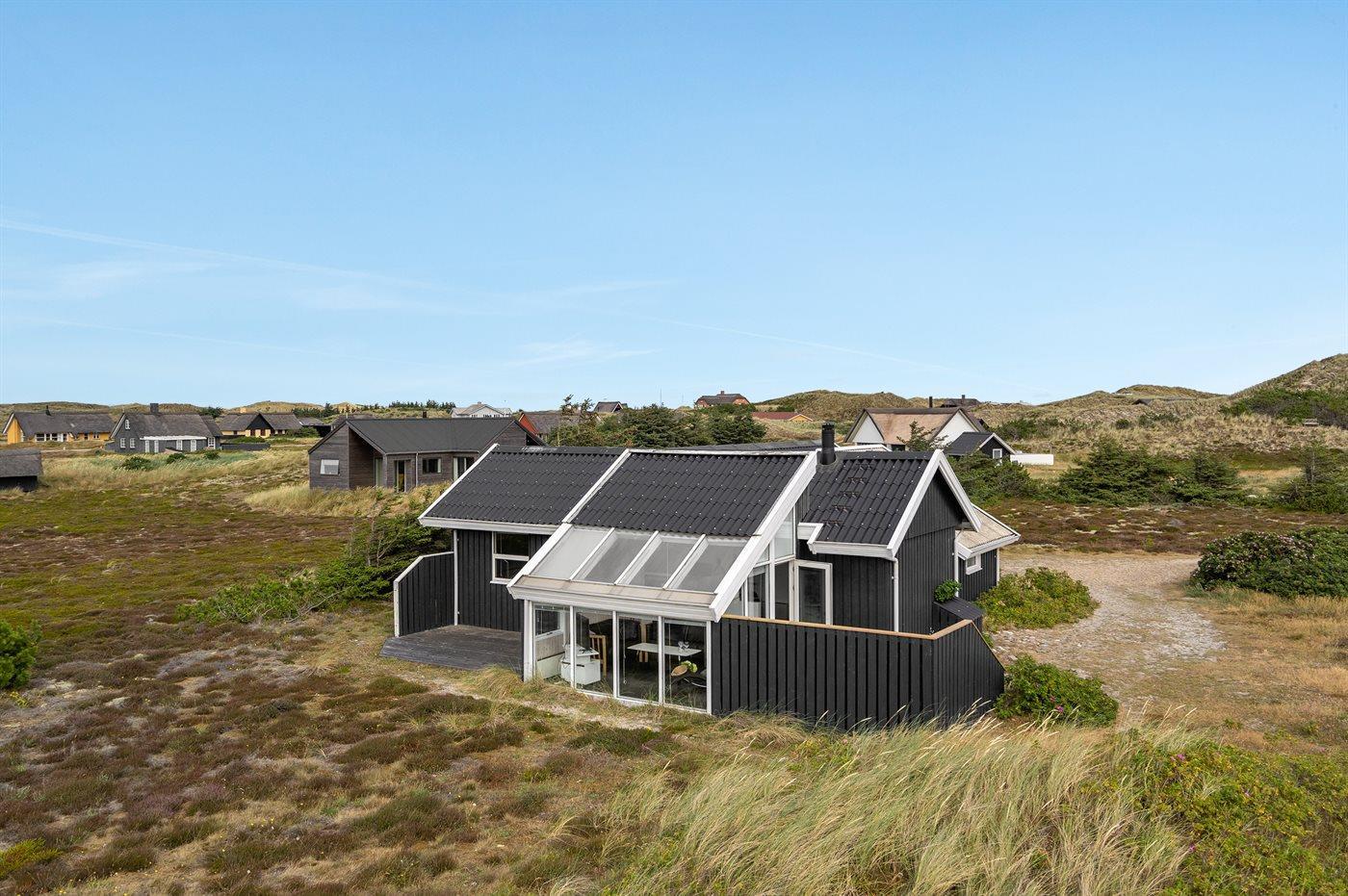 Dette dejlige sommerhus i træ ligger i første klitrække på en stor naturgrund med en fantastisk udsigt over det flotte klitområde. Huset bliver løbende vedligeholdt og 2012 blev huset udstyret med et nyt køkken. Til opvarmningen af huset er der installeret en energibesparende varmepumpe, der også fungerer som aircondition. Huset ligger på en stor naturgrund med en fantastisk udsigt over fredet område. 3 terrasser samt carport, sandkasse og gynge på grunden. Trælofter, -gulve og -vægge. Gulvtæpper i værelserne. Den hyggeligt indrettede stue i forskudt plan indeholder brændeovn, CD-afspiller og TV med parabol (TDC Home Trio med et udvalg af danske og internationale programmer) samt integreret DVD-afspiller. Husets sovepladser fordeler sig på 1 værelse med dobbeltseng, 1 værelse med 2 enkeltsenge og 1 værelse med køjeseng. Desuden alkove med 2 sovepladser i opholdsstuen. Gratis, trådløs internetforbindelse (computer medbringes). Køkkenet er udstyret med fryser, mikrobølgeovn og opvaskemaskine. Godt badeværelse med gulvvarme, vaskemaskine og tørretumbler. Sauna. Spa-afdeling med bruseniche, gulvvarme og 2-pers. spa. Endvidere barneseng og høj barnestol til rådighed. Et dejligt sommerhus i rolige omgivelser.