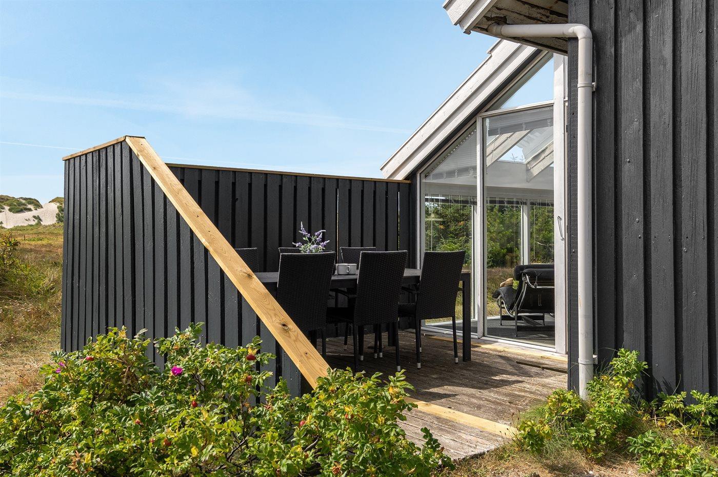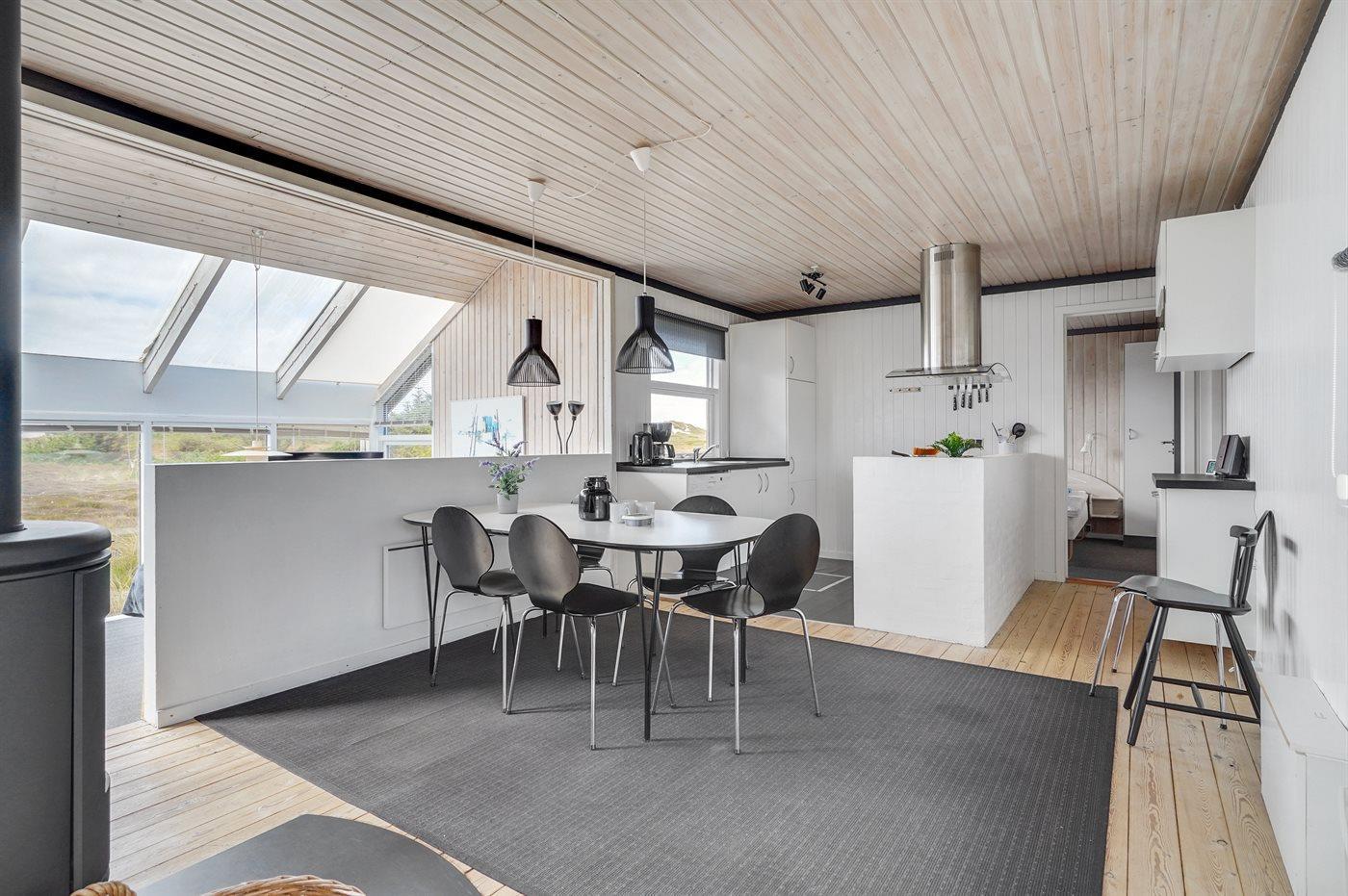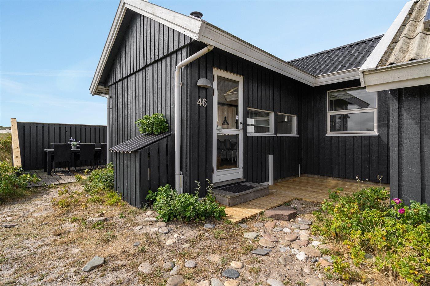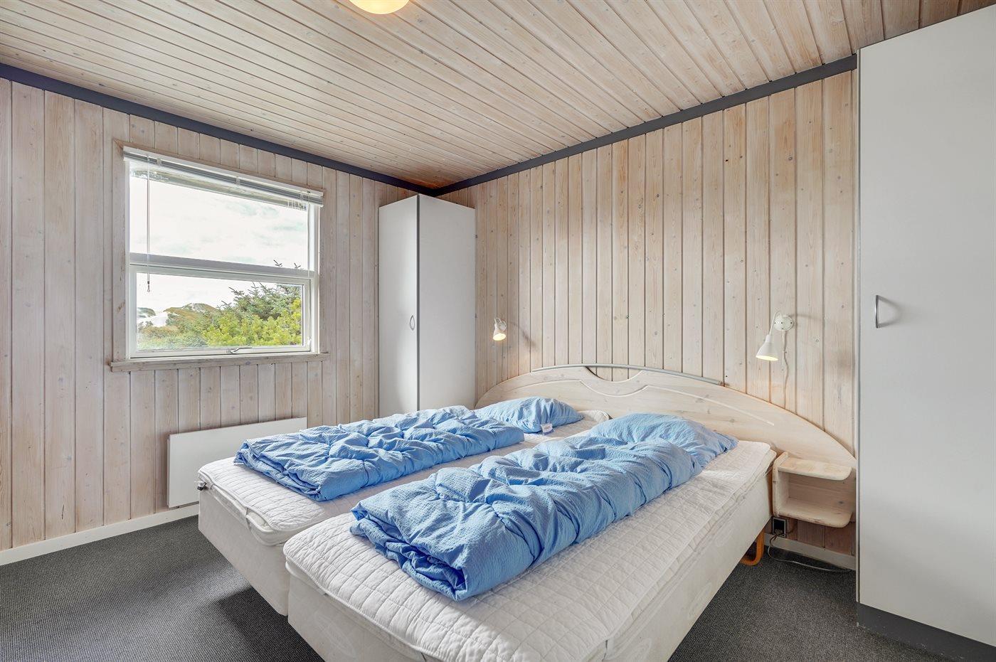Dette dejlige sommerhus i træ ligger i første klitrække på en stor naturgrund med en fantastisk udsigt over det flotte klitområde. Huset bliver løbende vedligeholdt og 2012 blev huset udstyret med et nyt køkken. Til opvarmningen af huset er der installeret en energibesparende varmepumpe, der også fungerer som aircondition. Huset ligger på en stor naturgrund med en fantastisk udsigt over fredet område. 3 terrasser samt carport, sandkasse og gynge på grunden. Trælofter, -gulve og -vægge. Gulvtæpper i værelserne. Den hyggeligt indrettede stue i forskudt plan indeholder brændeovn, CD-afspiller og TV med parabol (TDC Home Trio med et udvalg af danske og internationale programmer) samt integreret DVD-afspiller. Husets sovepladser fordeler sig på 1 værelse med dobbeltseng, 1 værelse med 2 enkeltsenge og 1 værelse med køjeseng. Desuden alkove med 2 sovepladser i opholdsstuen. Gratis, trådløs internetforbindelse (computer medbringes). Køkkenet er udstyret med fryser, mikrobølgeovn og opvaskemaskine. Godt badeværelse med gulvvarme, vaskemaskine og tørretumbler. Sauna. Spa-afdeling med bruseniche, gulvvarme og 2-pers. spa. Endvidere barneseng og høj barnestol til rådighed. Et dejligt sommerhus i rolige omgivelser.