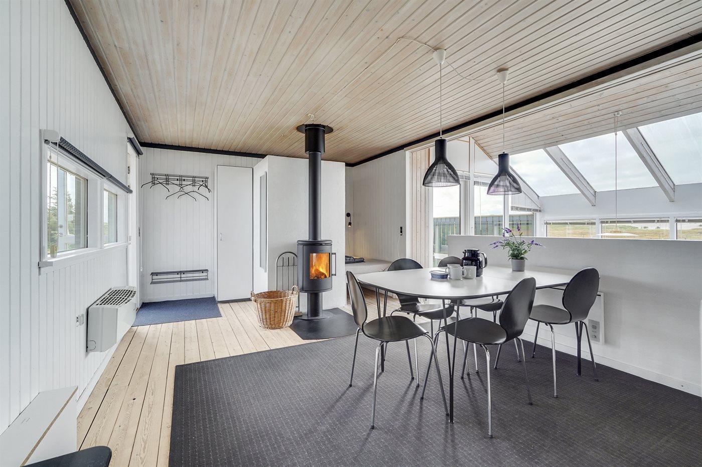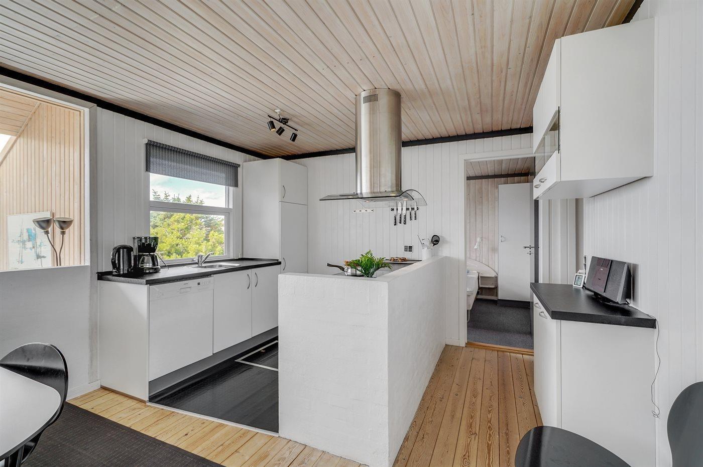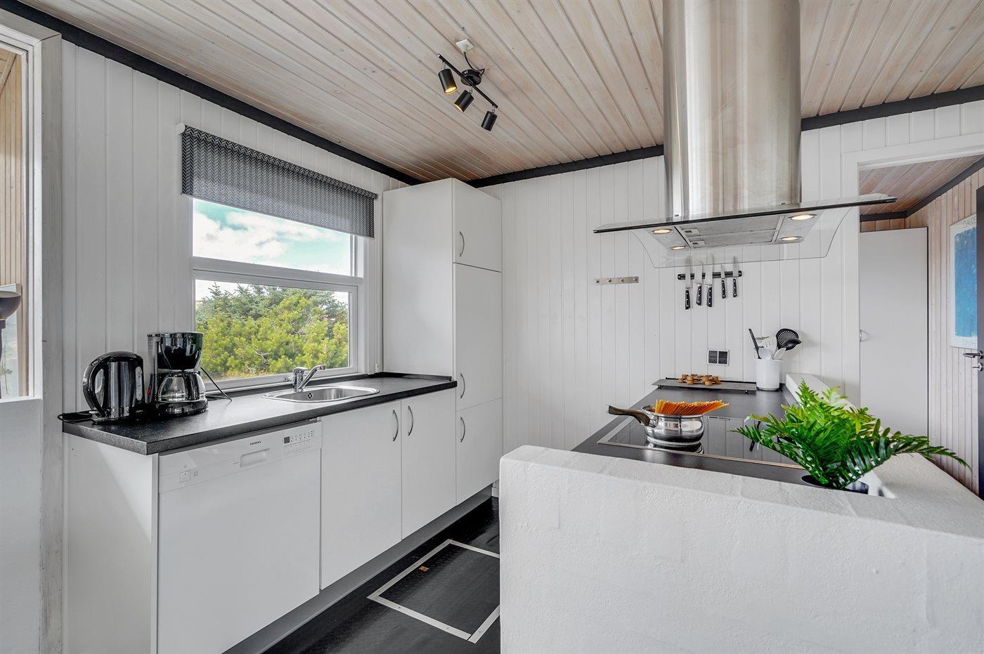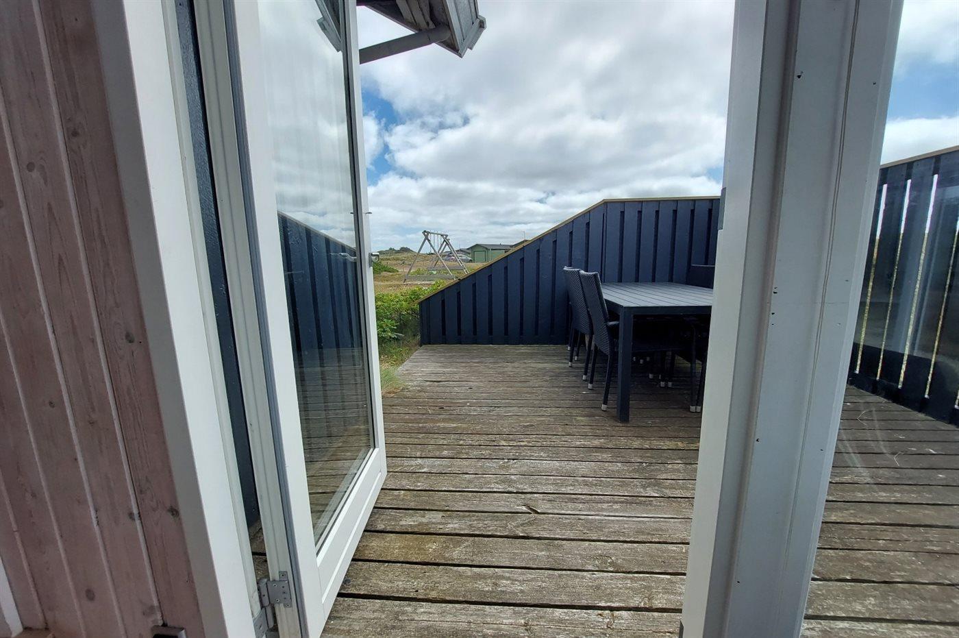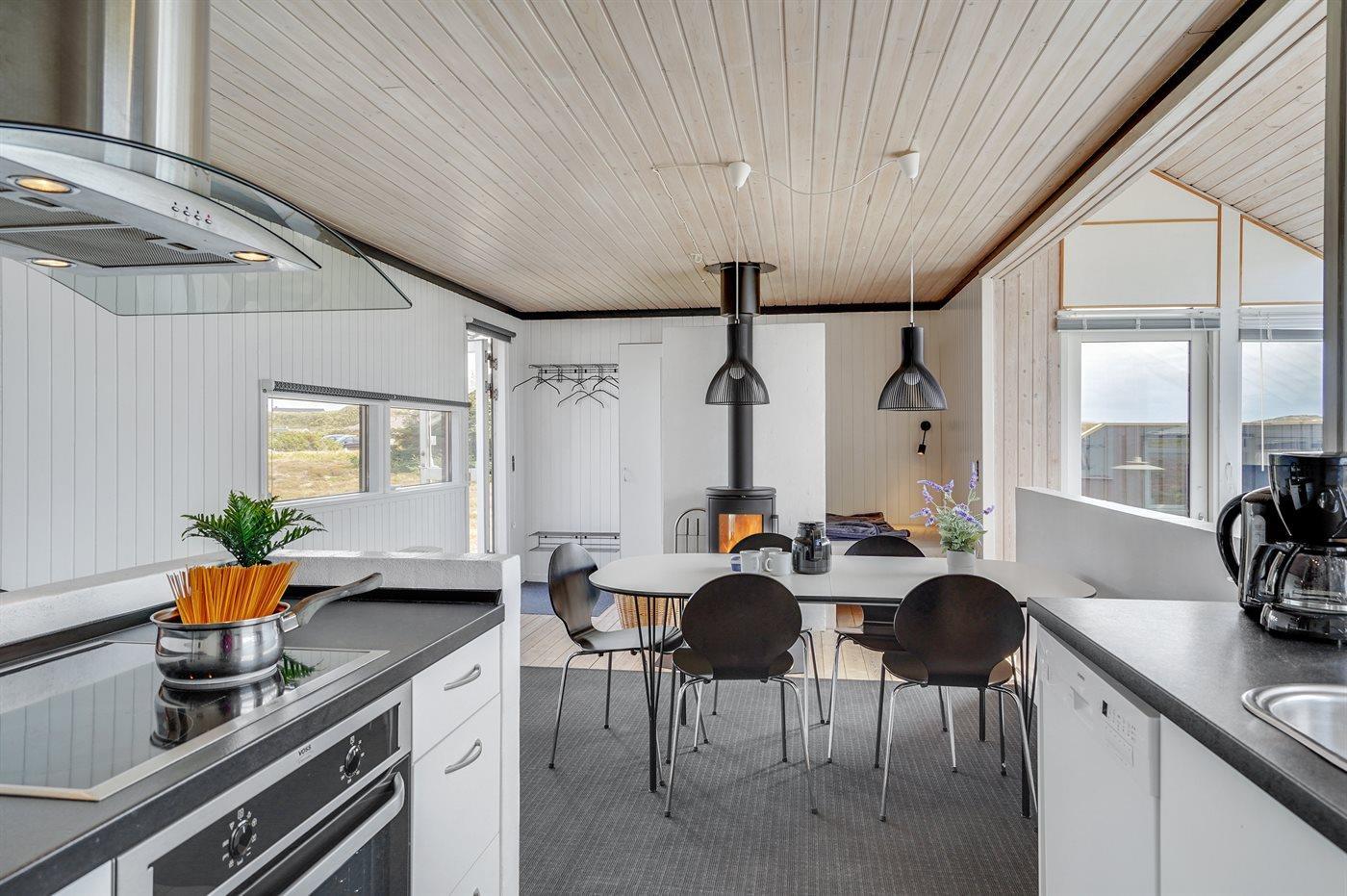 Dette dejlige sommerhus i træ ligger i første klitrække på en stor naturgrund med en fantastisk udsigt over det flotte klitområde. Huset bliver løbende vedligeholdt og 2012 blev huset udstyret med et nyt køkken. Til opvarmningen af huset er der installeret en energibesparende varmepumpe, der også fungerer som aircondition. Huset ligger på en stor naturgrund med en fantastisk udsigt over fredet område. 3 terrasser samt carport, sandkasse og gynge på grunden. Trælofter, -gulve og -vægge. Gulvtæpper i værelserne. Den hyggeligt indrettede stue i forskudt plan indeholder brændeovn, CD-afspiller og TV med parabol (TDC Home Trio med et udvalg af danske og internationale programmer) samt integreret DVD-afspiller. Husets sovepladser fordeler sig på 1 værelse med dobbeltseng, 1 værelse med 2 enkeltsenge og 1 værelse med køjeseng. Desuden alkove med 2 sovepladser i opholdsstuen. Gratis, trådløs internetforbindelse (computer medbringes). Køkkenet er udstyret med fryser, mikrobølgeovn og opvaskemaskine. Godt badeværelse med gulvvarme, vaskemaskine og tørretumbler. Sauna. Spa-afdeling med bruseniche, gulvvarme og 2-pers. spa. Endvidere barneseng og høj barnestol til rådighed. Et dejligt sommerhus i rolige omgivelser.