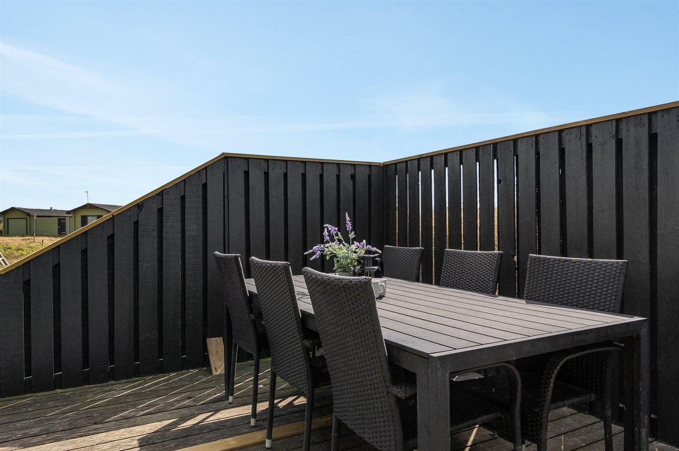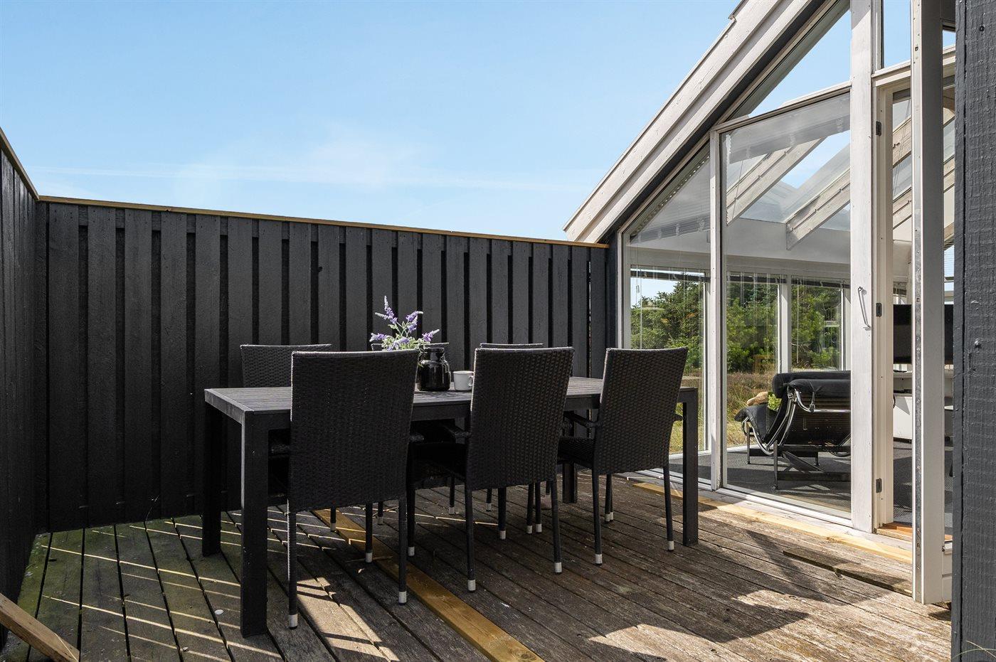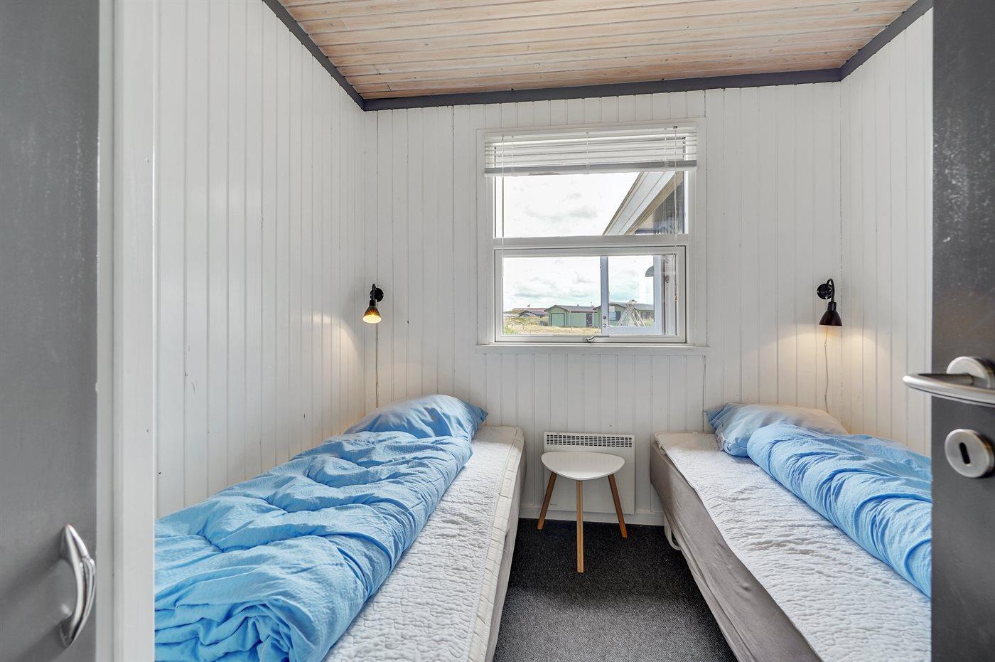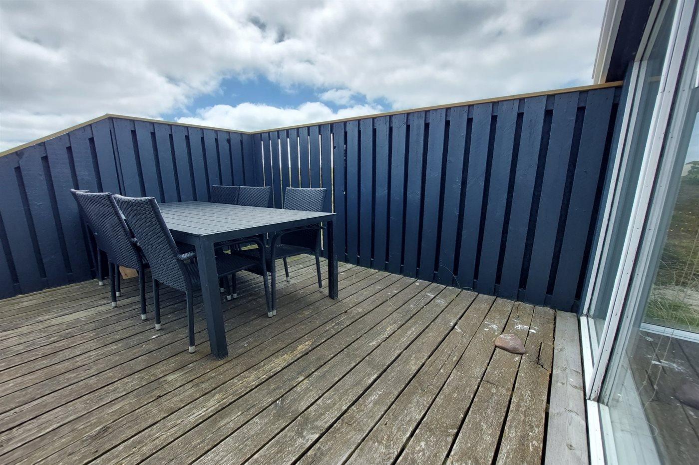 Dette dejlige sommerhus i træ ligger i første klitrække på en stor naturgrund med en fantastisk udsigt over det flotte klitområde. Huset bliver løbende vedligeholdt og 2012 blev huset udstyret med et nyt køkken. Til opvarmningen af huset er der installeret en energibesparende varmepumpe, der også fungerer som aircondition. Huset ligger på en stor naturgrund med en fantastisk udsigt over fredet område. 3 terrasser samt carport, sandkasse og gynge på grunden. Trælofter, -gulve og -vægge. Gulvtæpper i værelserne. Den hyggeligt indrettede stue i forskudt plan indeholder brændeovn, CD-afspiller og TV med parabol (TDC Home Trio med et udvalg af danske og internationale programmer) samt integreret DVD-afspiller. Husets sovepladser fordeler sig på 1 værelse med dobbeltseng, 1 værelse med 2 enkeltsenge og 1 værelse med køjeseng. Desuden alkove med 2 sovepladser i opholdsstuen. Gratis, trådløs internetforbindelse (computer medbringes). Køkkenet er udstyret med fryser, mikrobølgeovn og opvaskemaskine. Godt badeværelse med gulvvarme, vaskemaskine og tørretumbler. Sauna. Spa-afdeling med bruseniche, gulvvarme og 2-pers. spa. Endvidere barneseng og høj barnestol til rådighed. Et dejligt sommerhus i rolige omgivelser.