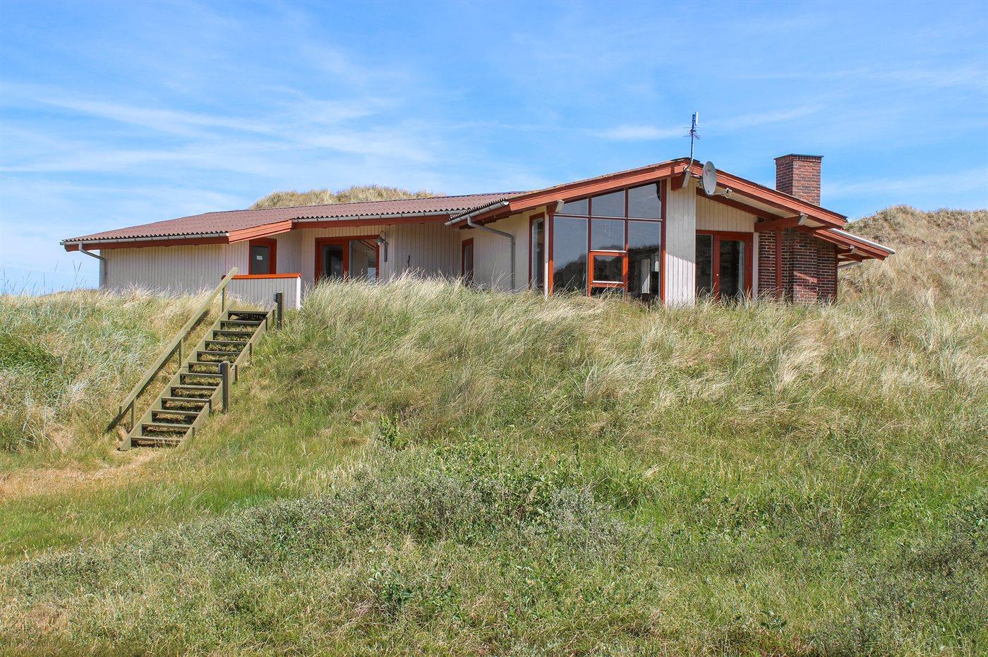 Dejligt sommerhus med en flot beliggende på en meget stor og kuperet grund med flot udsigt over klitområdet, havet og fjorden fra toppen af grunden. Få trappetrin op til huset.