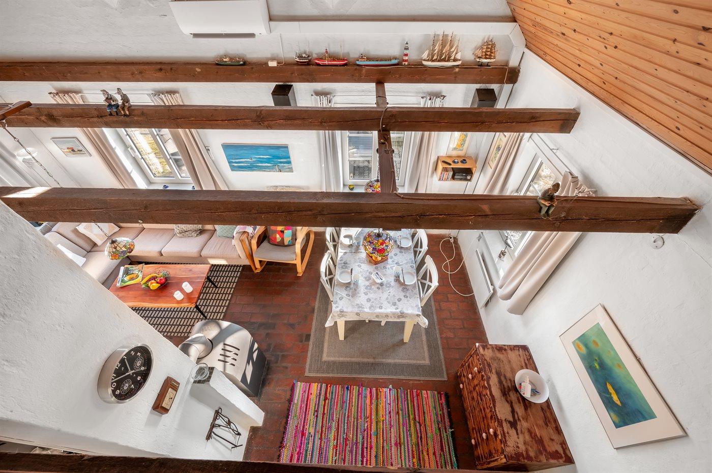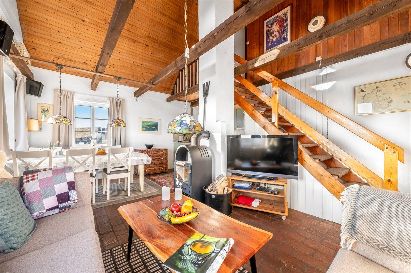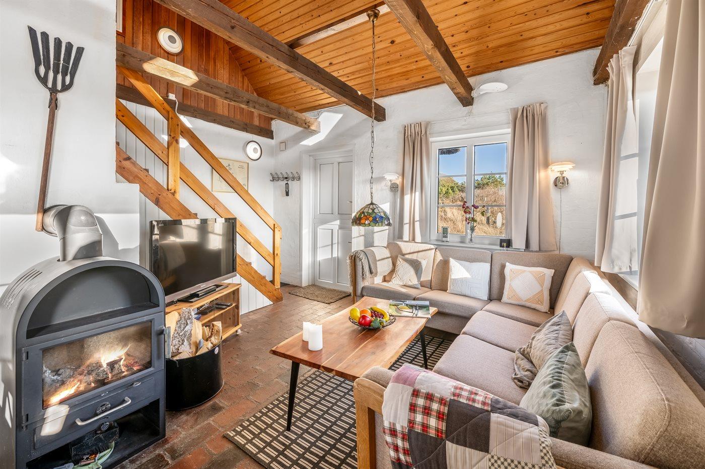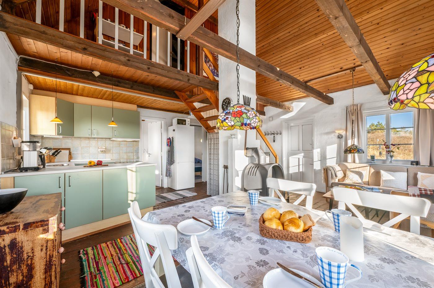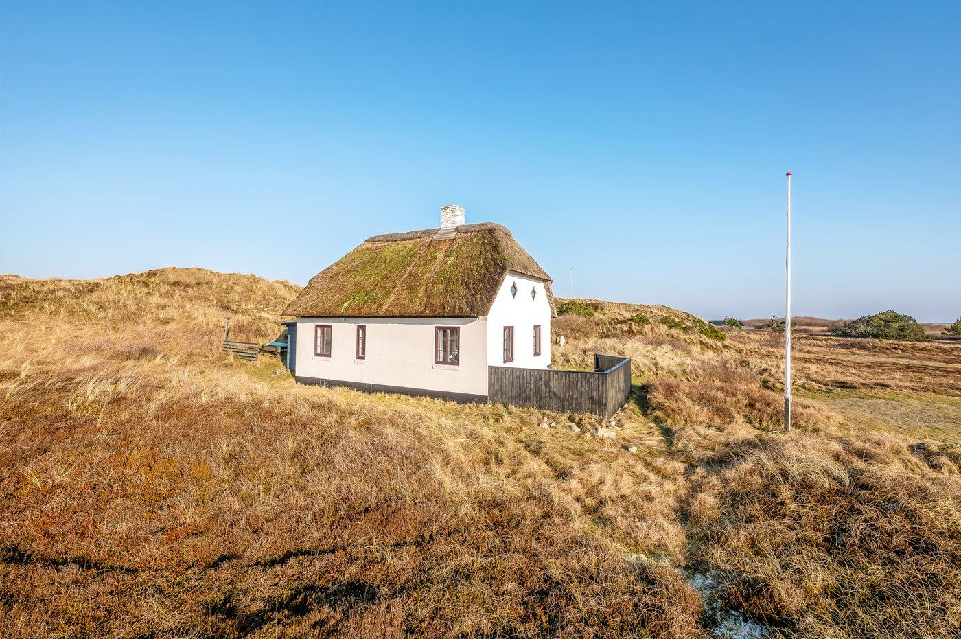 Charmerende sommerhus med stråtag beliggende på en meget stor og kombineret natur-/klitgrund med fjordudsigt fra hus og grund. Huset har smukke skrånende trælofter, malede stenvægge samt stengulve overalt - dog med trægulve på 1. sal.