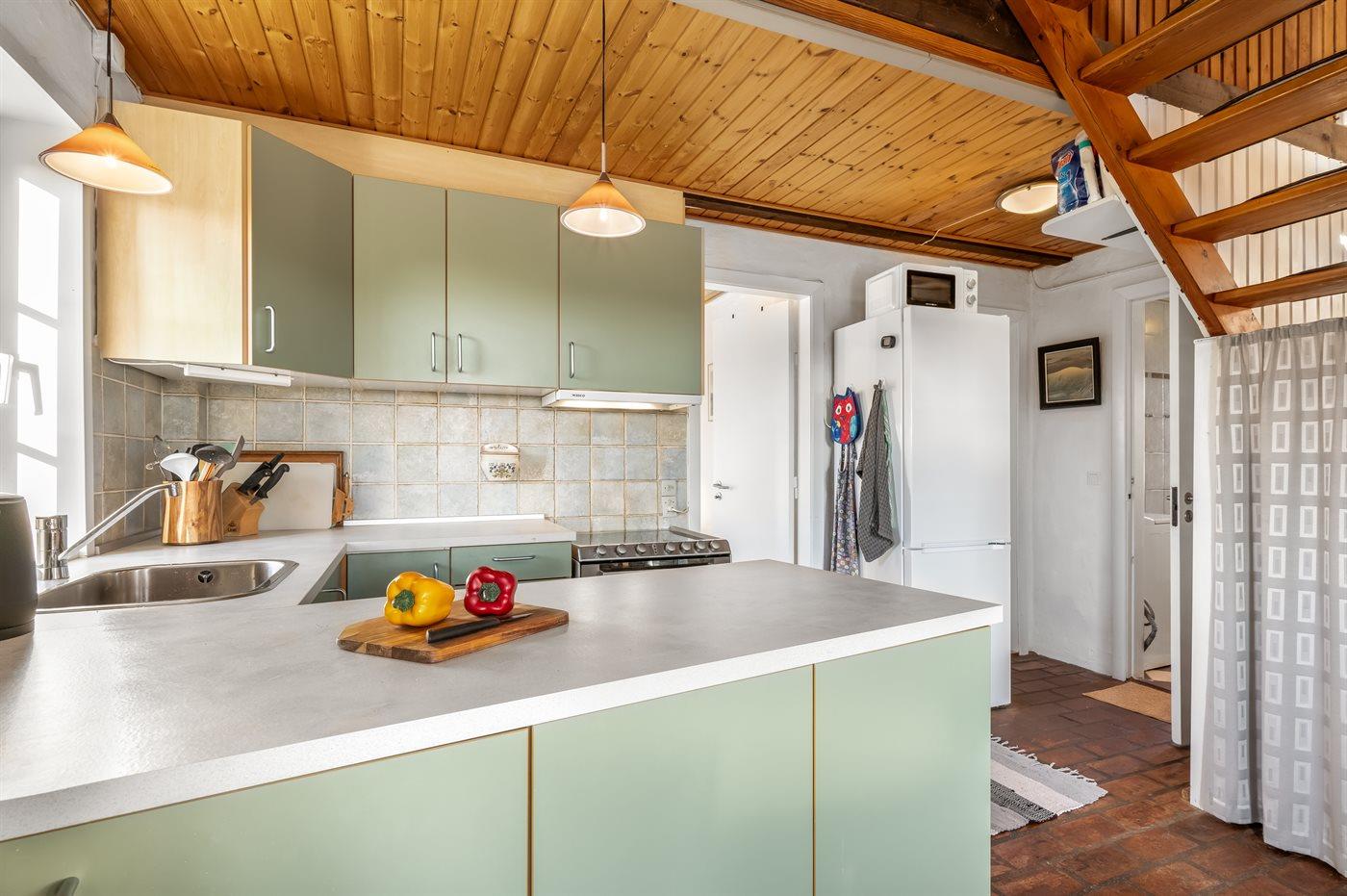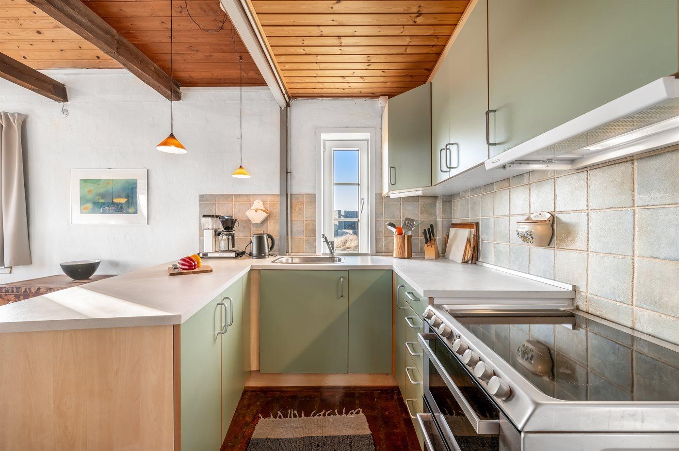 Køkkenet er udstyret med 1 køleskab. Der er 4 elkogeplader, bageovn, mikrobølgeovn samt opvaskemaskine.