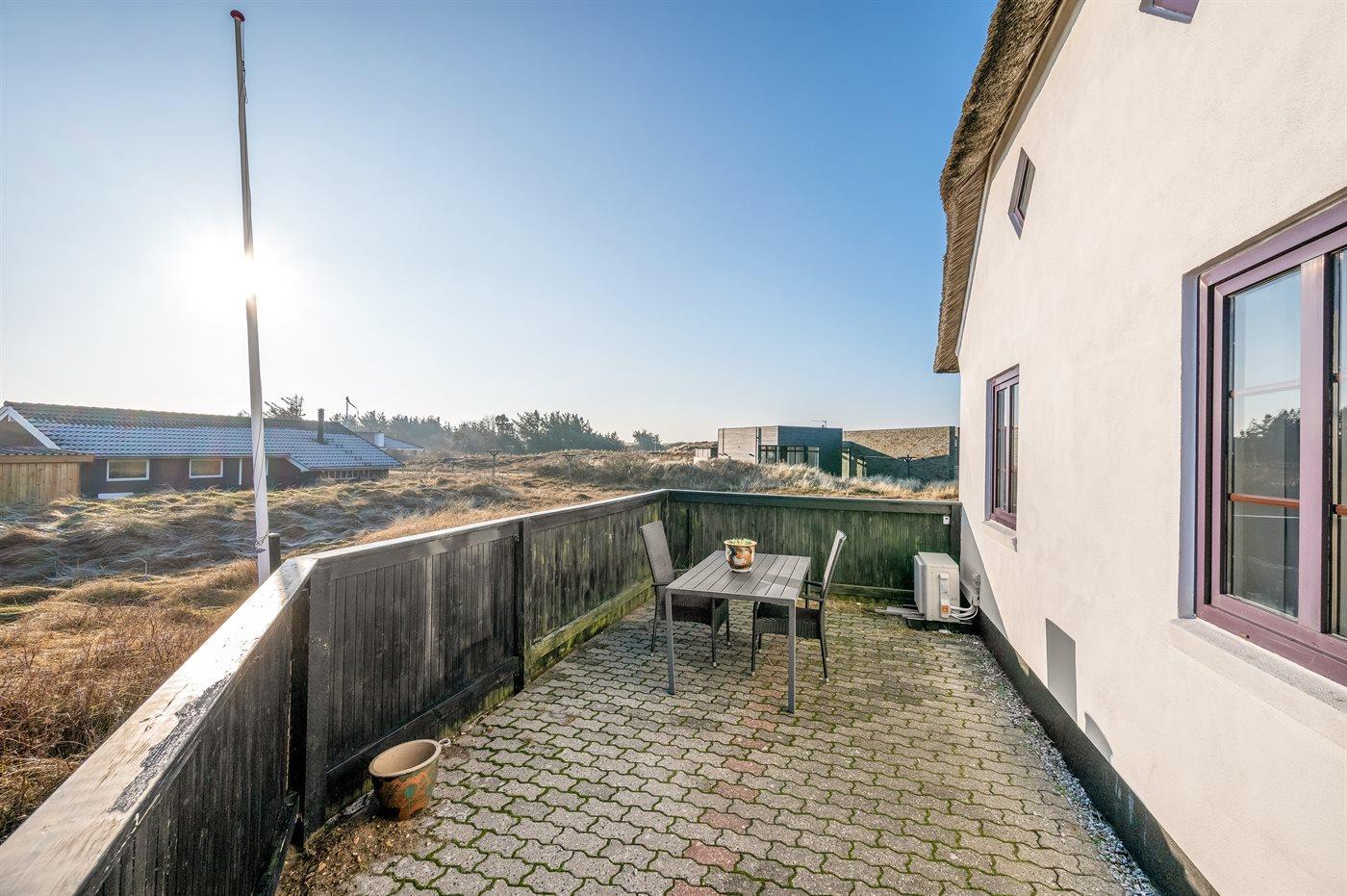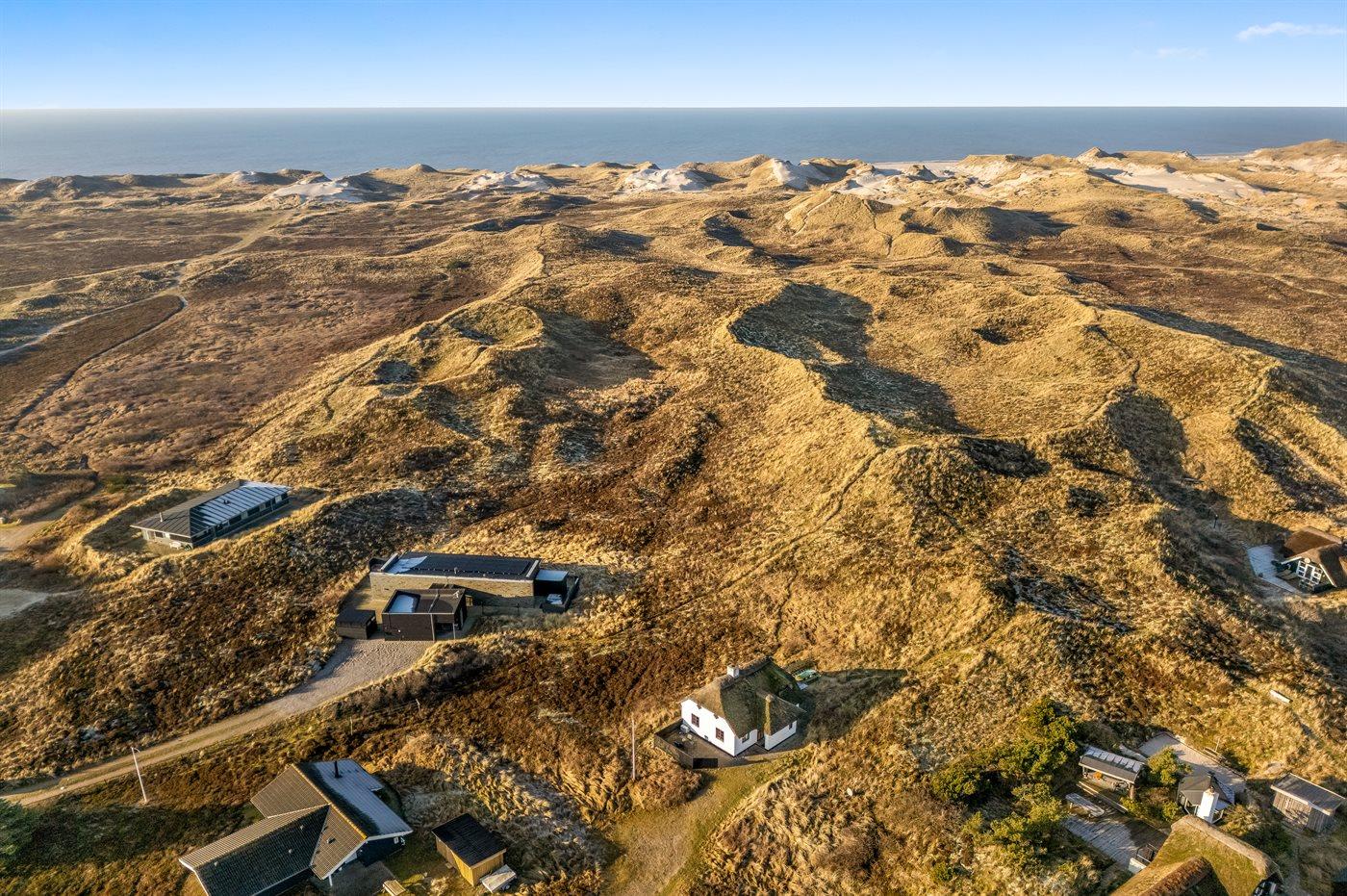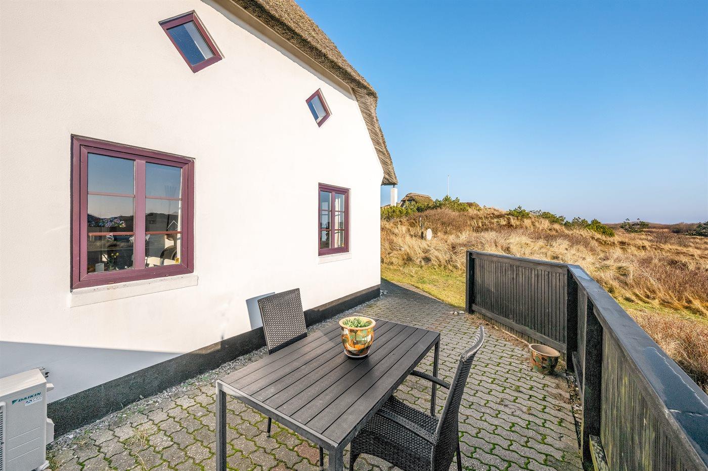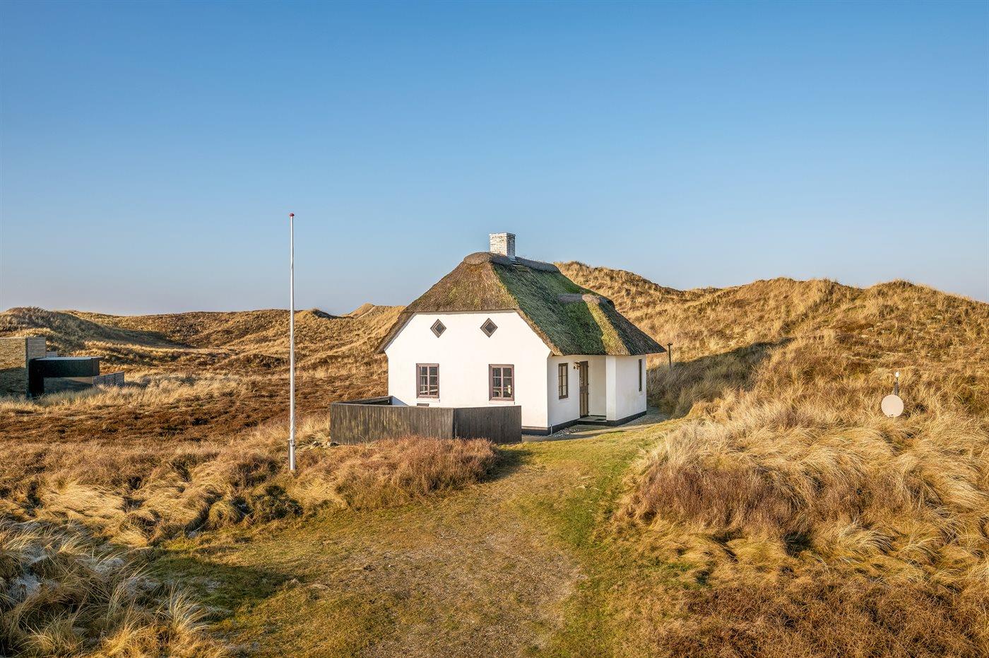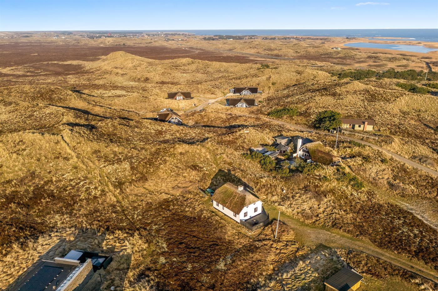 Charmerende sommerhus med stråtag og fjordudsigt på stor naturgrund nær havet i Hvide Sande.