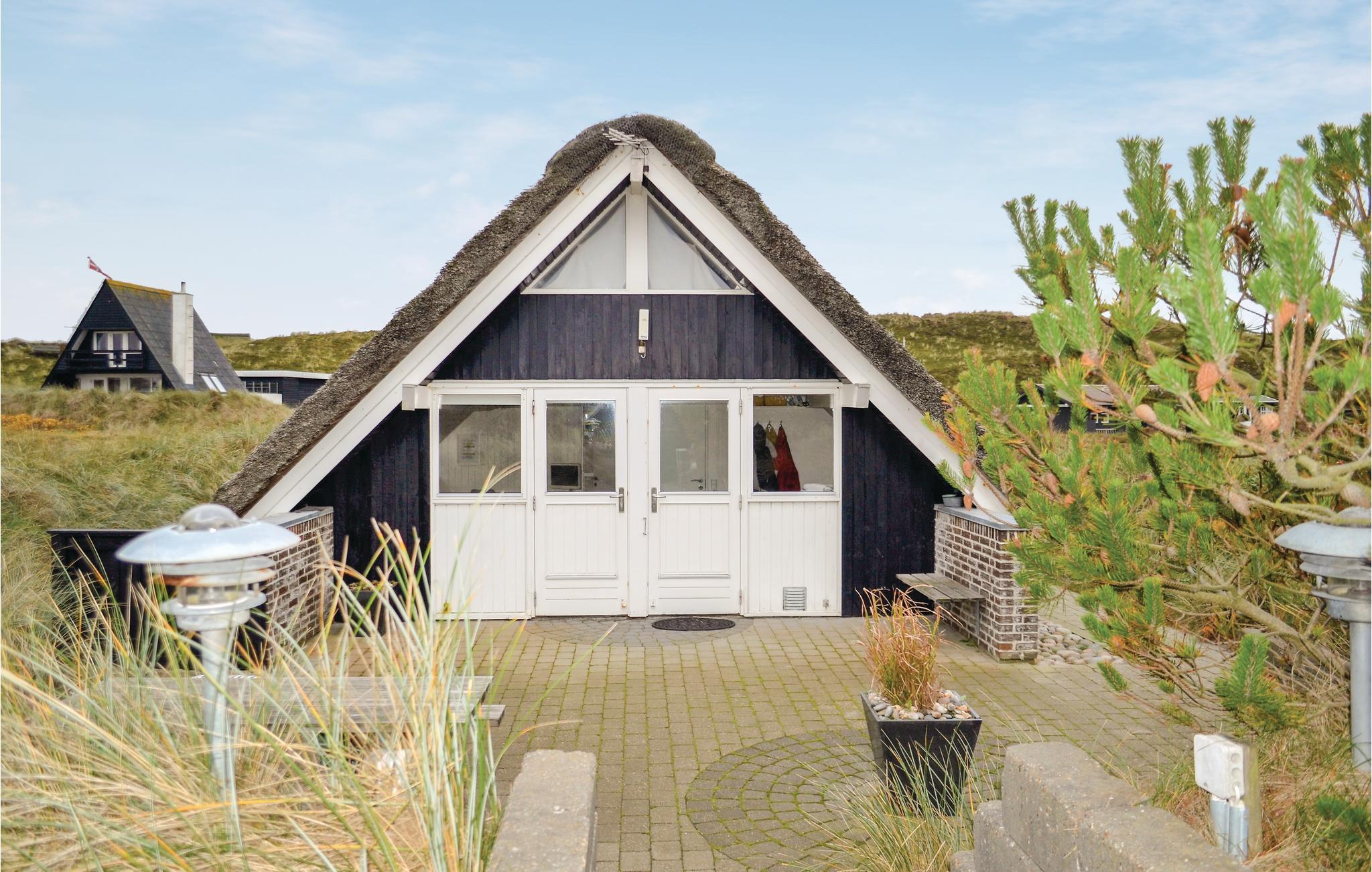 Hyggeligt stråtækt feriehus i Hvide Sande med udsigt til klitter og tæt på havet.