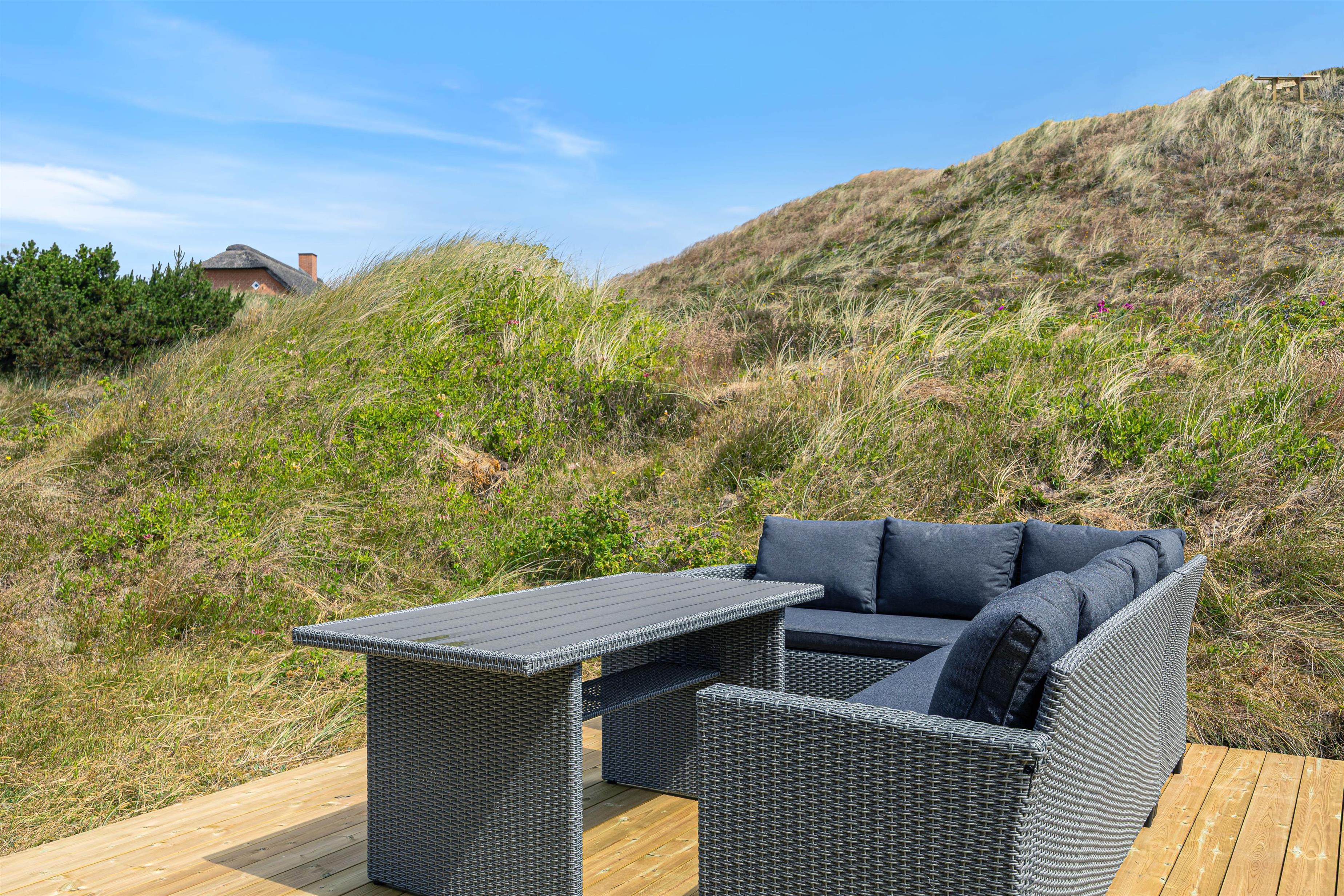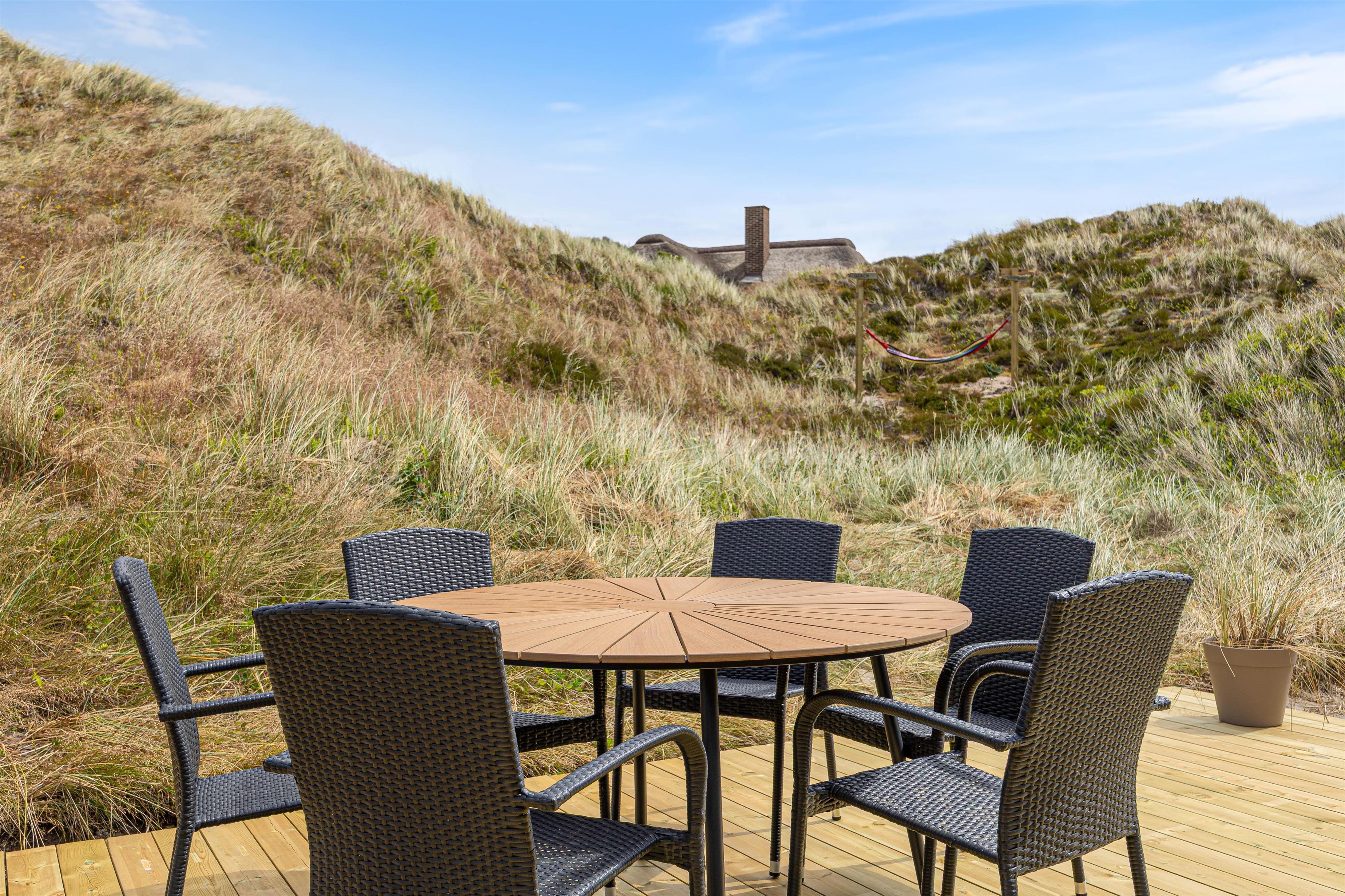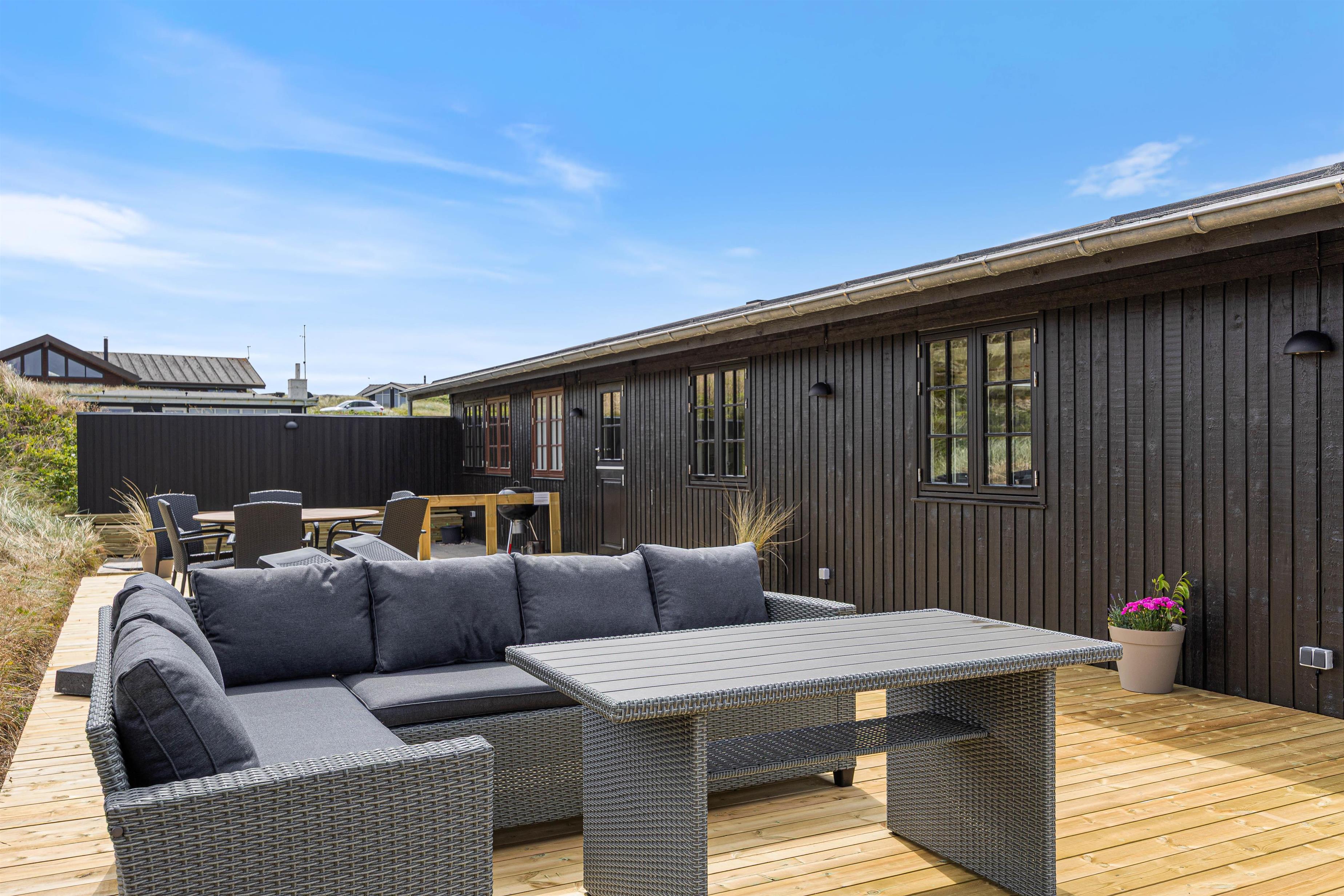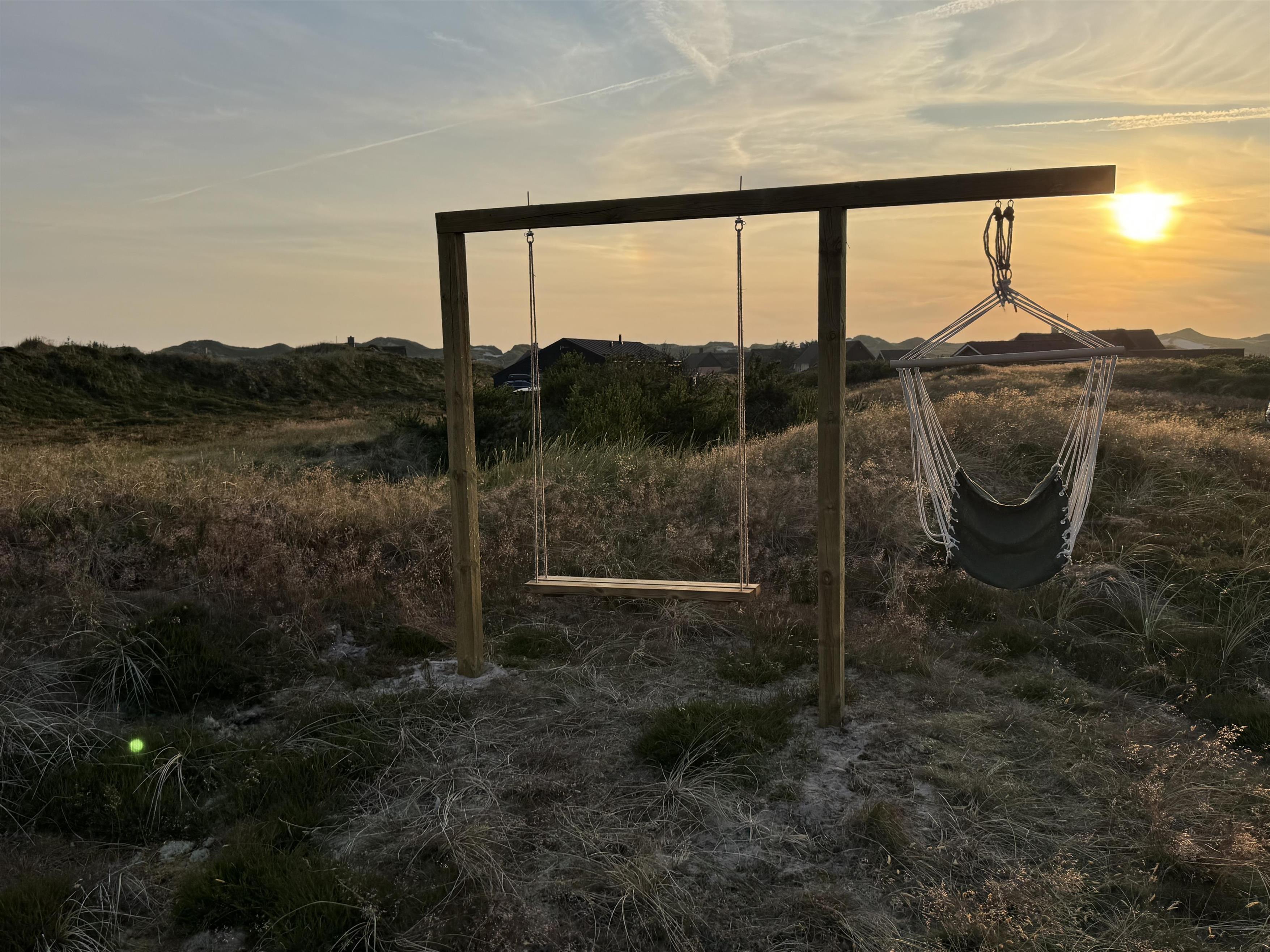 Når vejret tillader det, indbyder den lukkede og afskærmede terrasse til afslapning i rolige omgivelser. Her kan I nyde dagens første kop kaffe, læne jer tilbage i solen eller bare lade tankerne flyve i den friske vestjyske luft. Imens kan børnene lege trygt på gyngen, der er placeret på grunden.