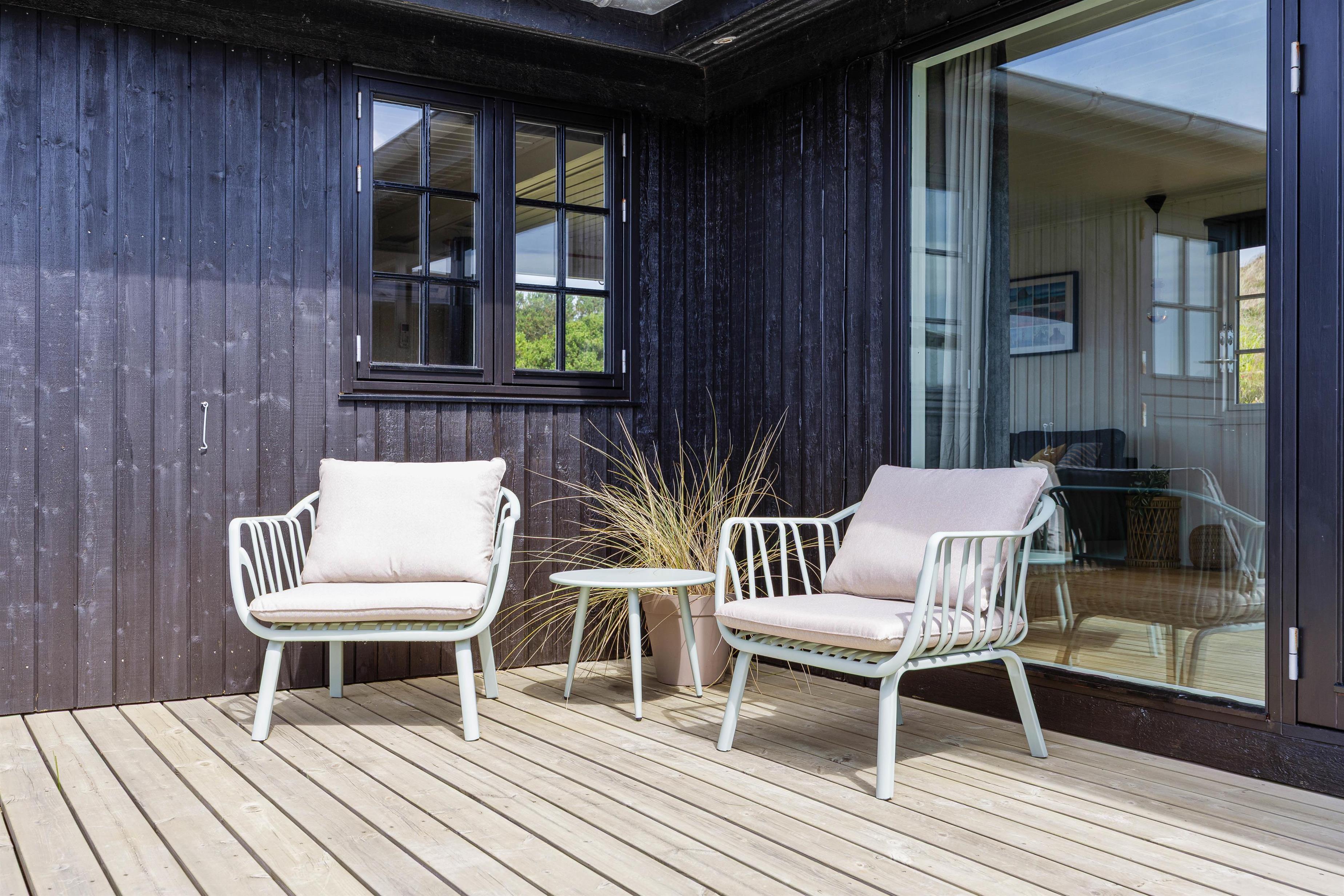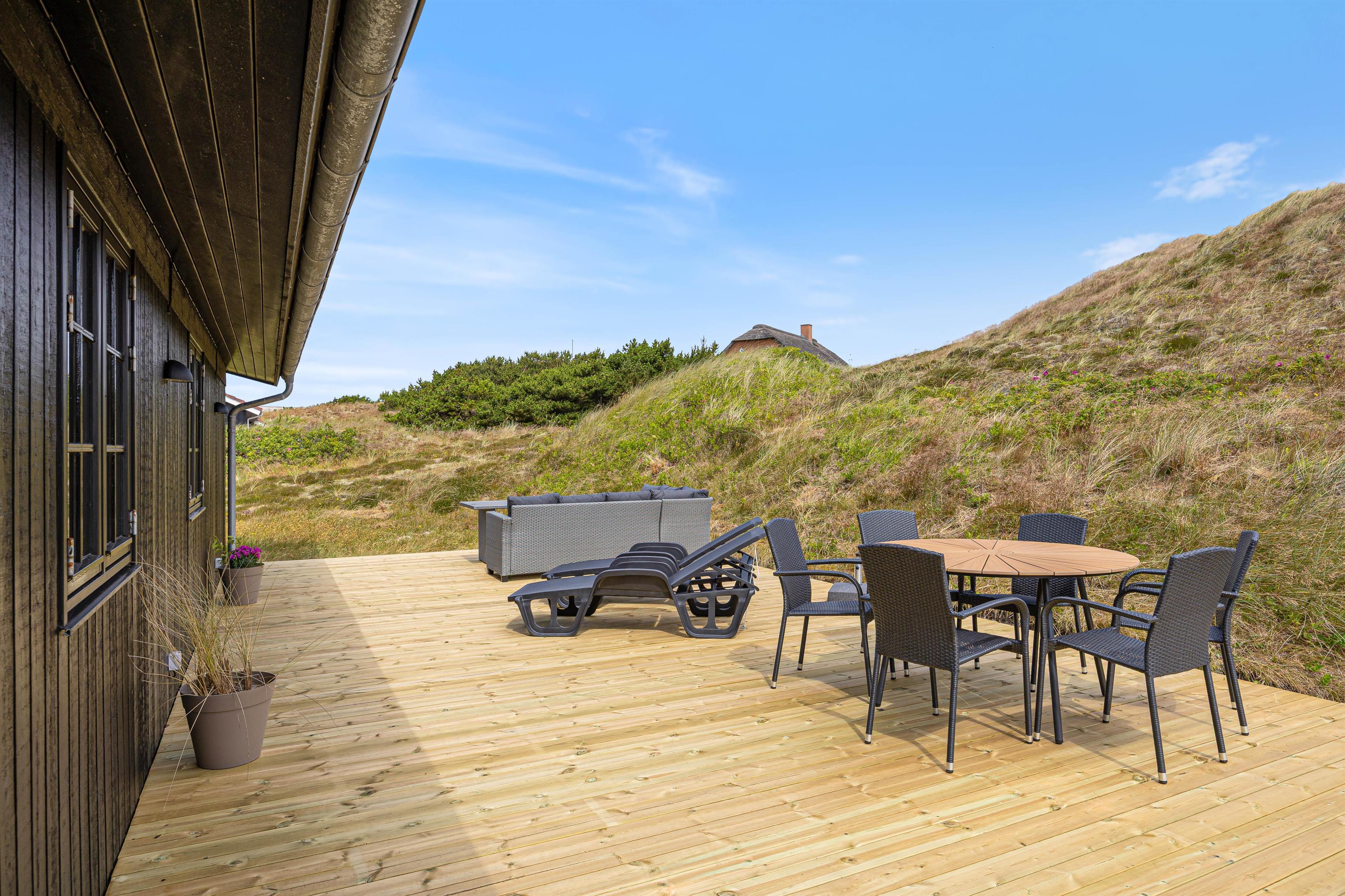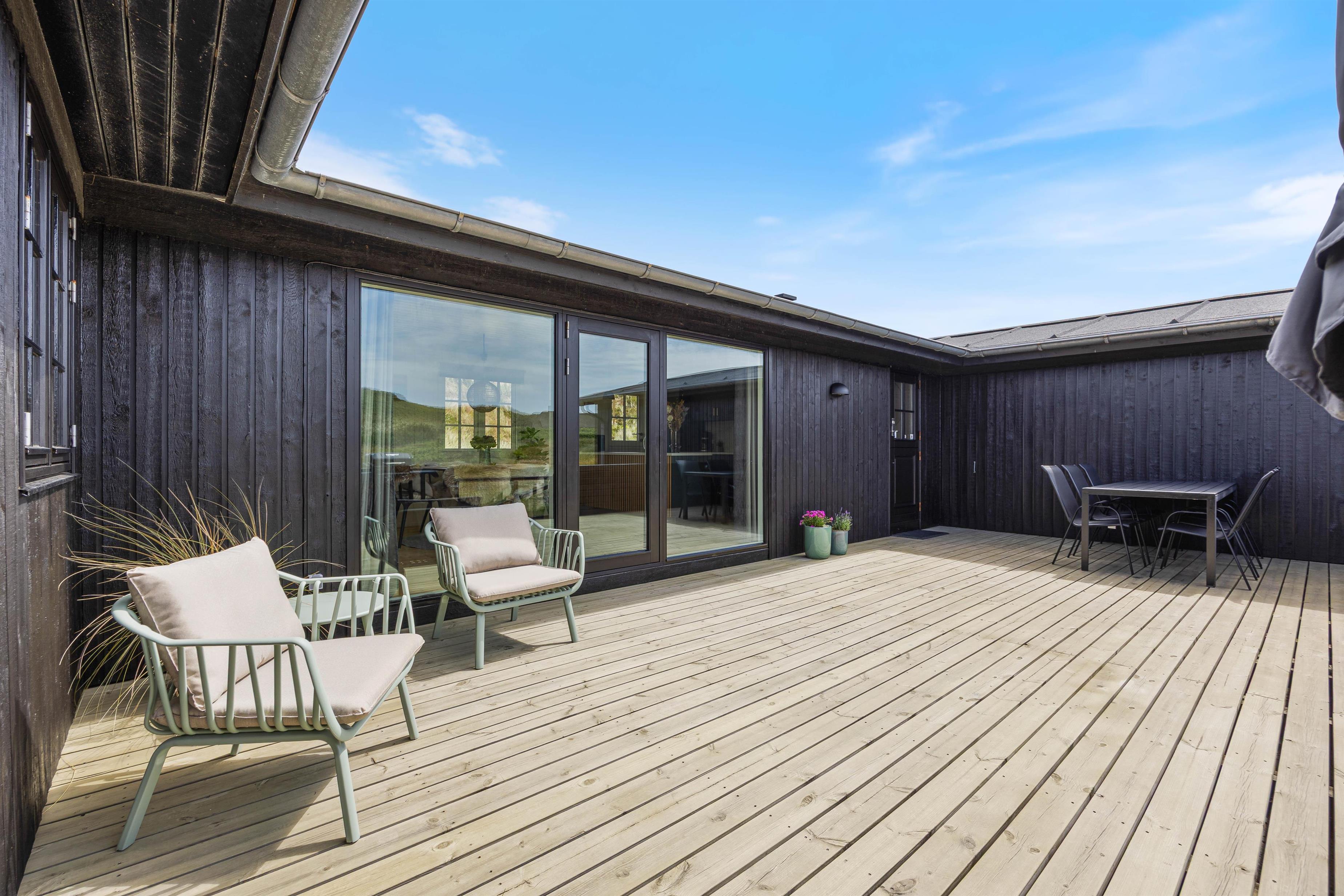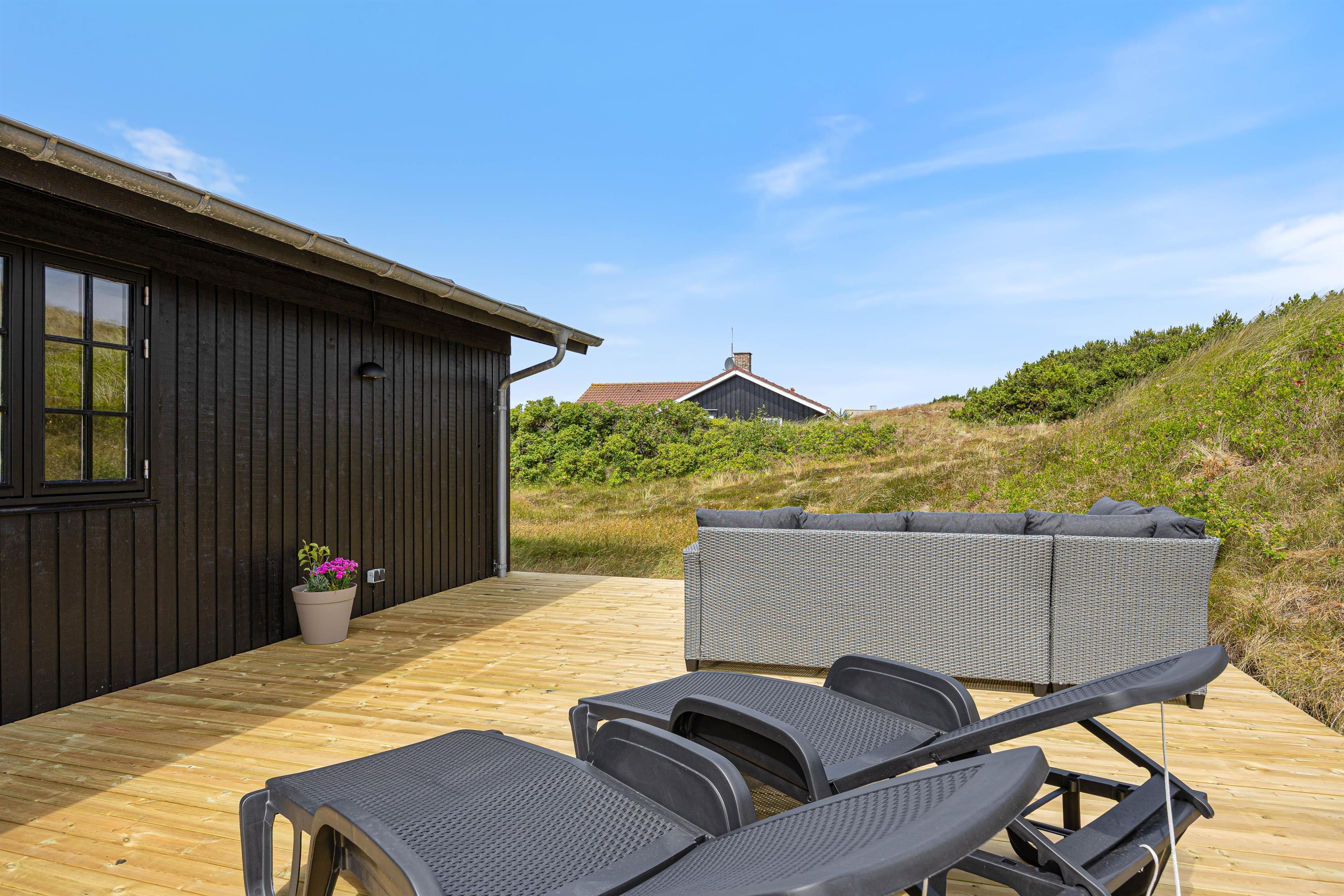Når vejret tillader det, indbyder den lukkede og afskærmede terrasse til afslapning i rolige omgivelser. Her kan I nyde dagens første kop kaffe, læne jer tilbage i solen eller bare lade tankerne flyve i den friske vestjyske luft. Imens kan børnene lege trygt på gyngen, der er placeret på grunden.