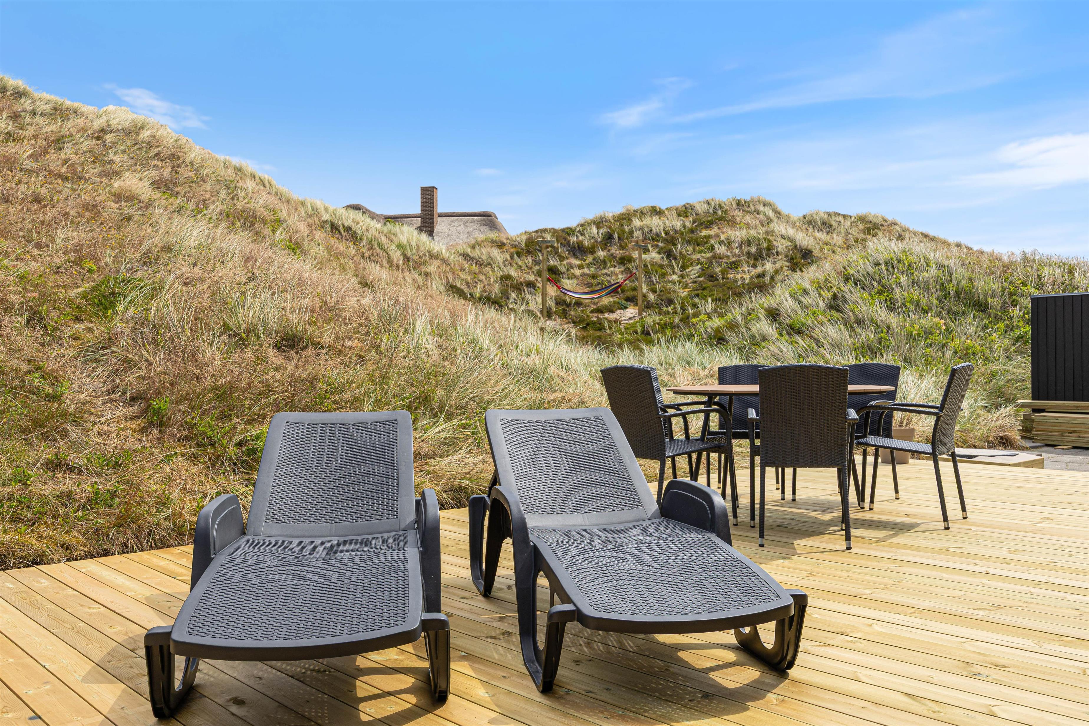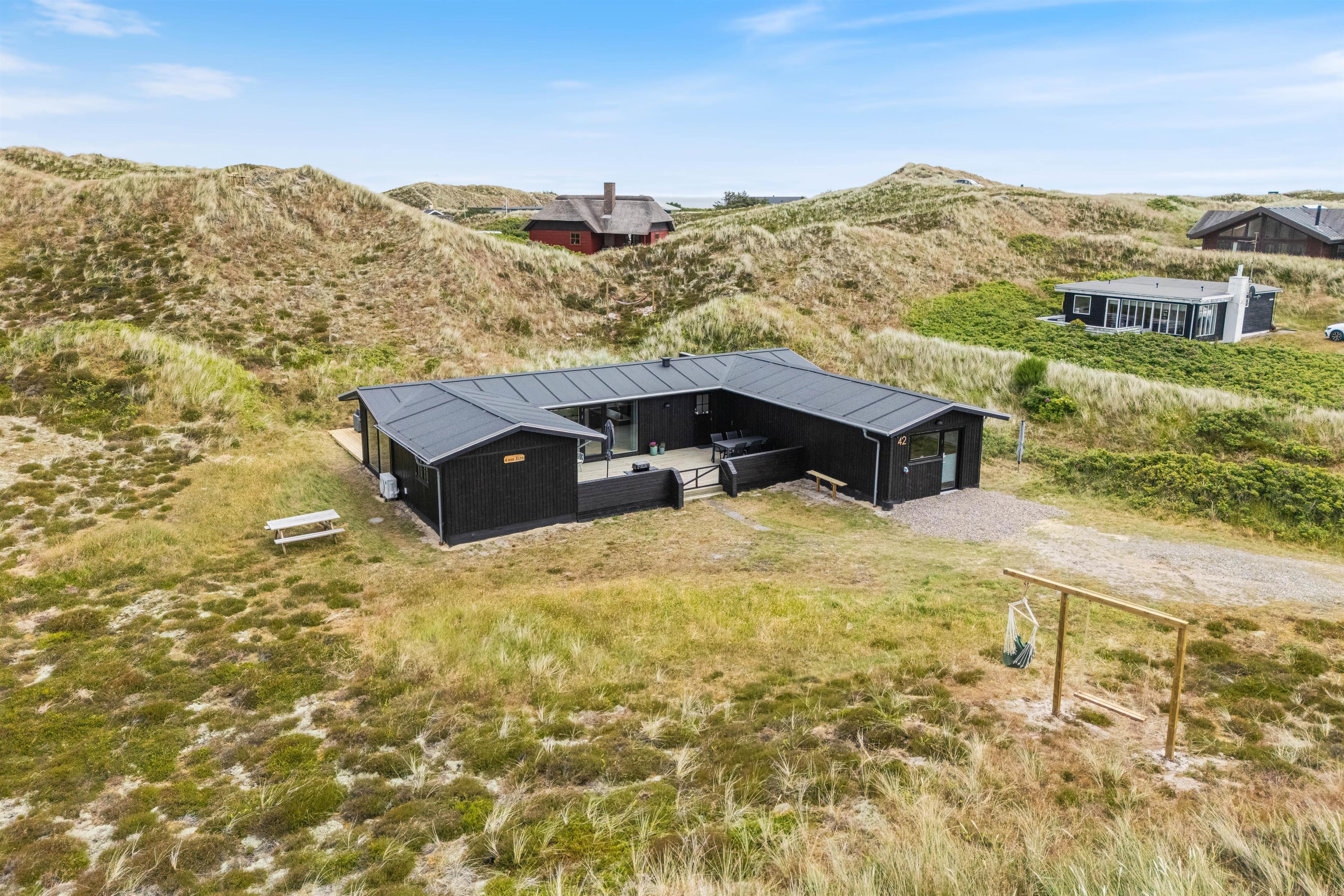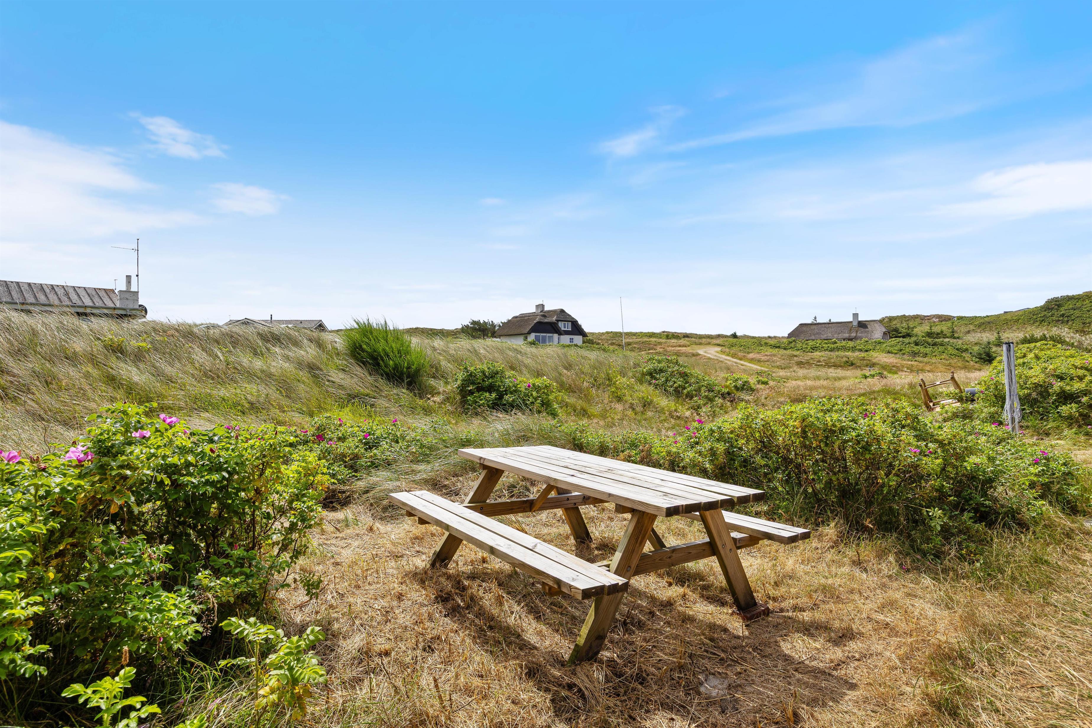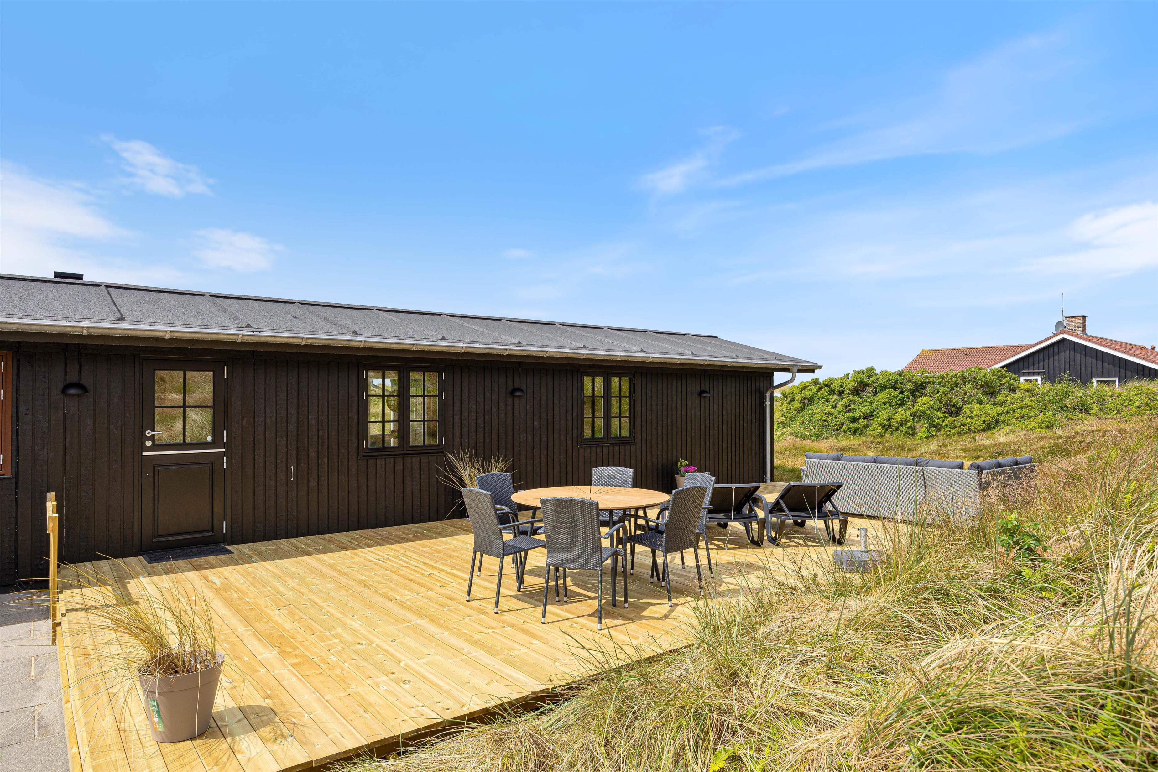 Når vejret tillader det, indbyder den lukkede og afskærmede terrasse til afslapning i rolige omgivelser. Her kan I nyde dagens første kop kaffe, læne jer tilbage i solen eller bare lade tankerne flyve i den friske vestjyske luft. Imens kan børnene lege trygt på gyngen, der er placeret på grunden.