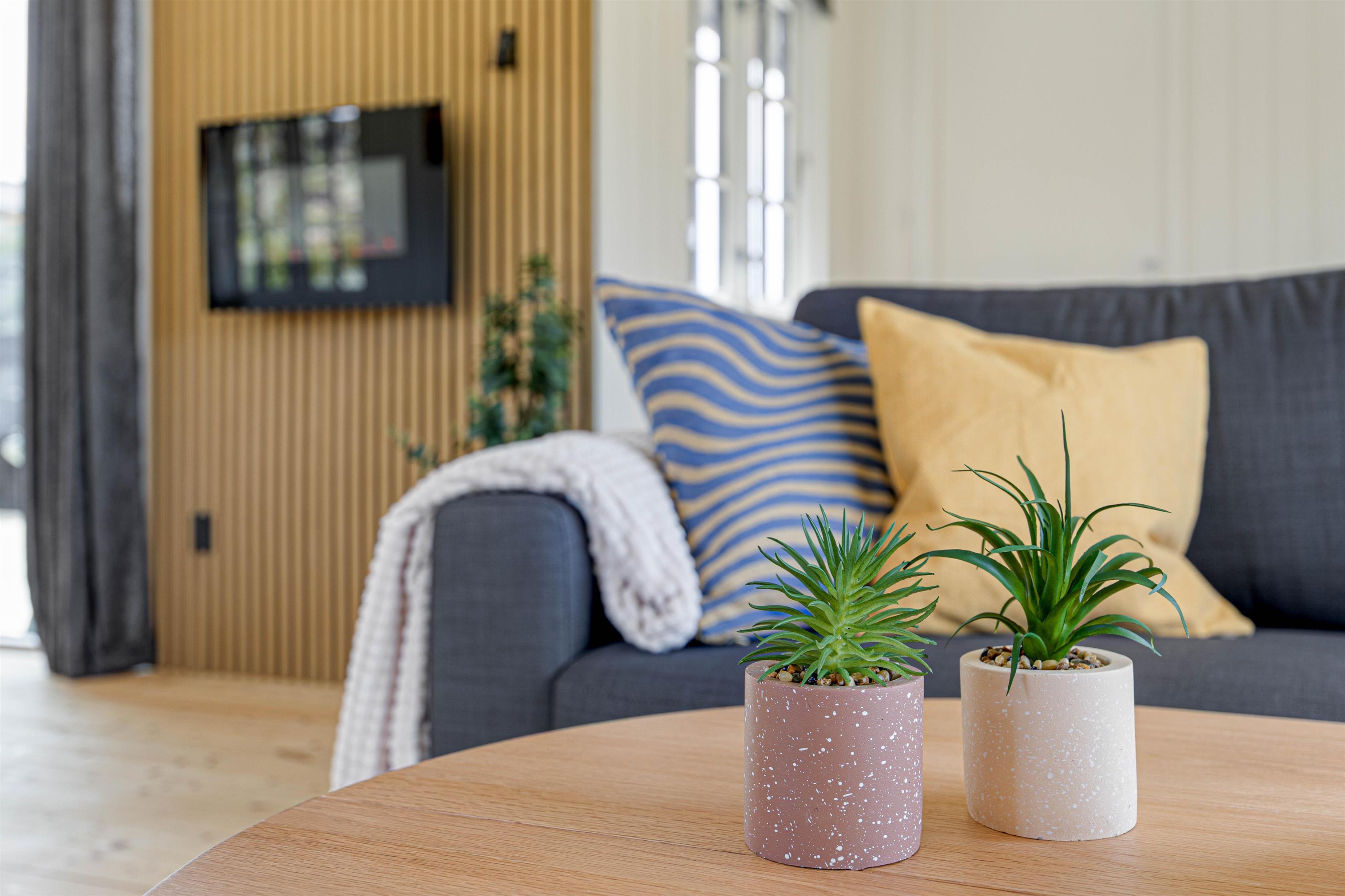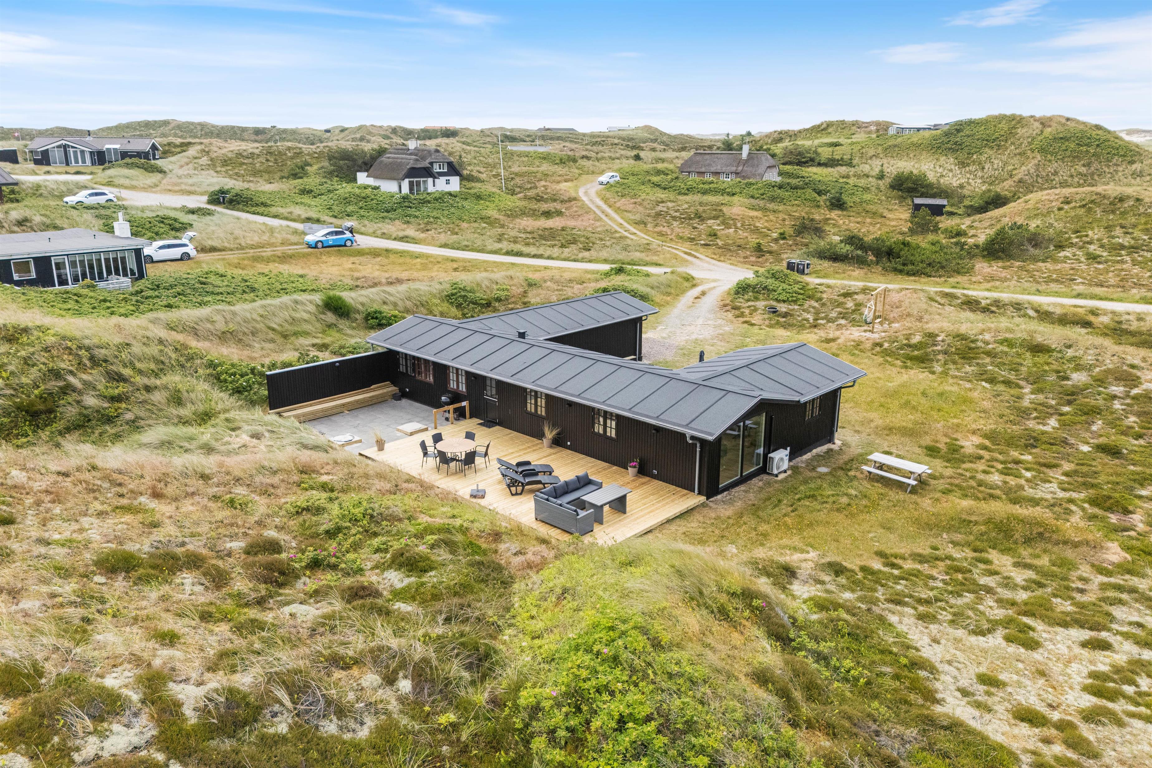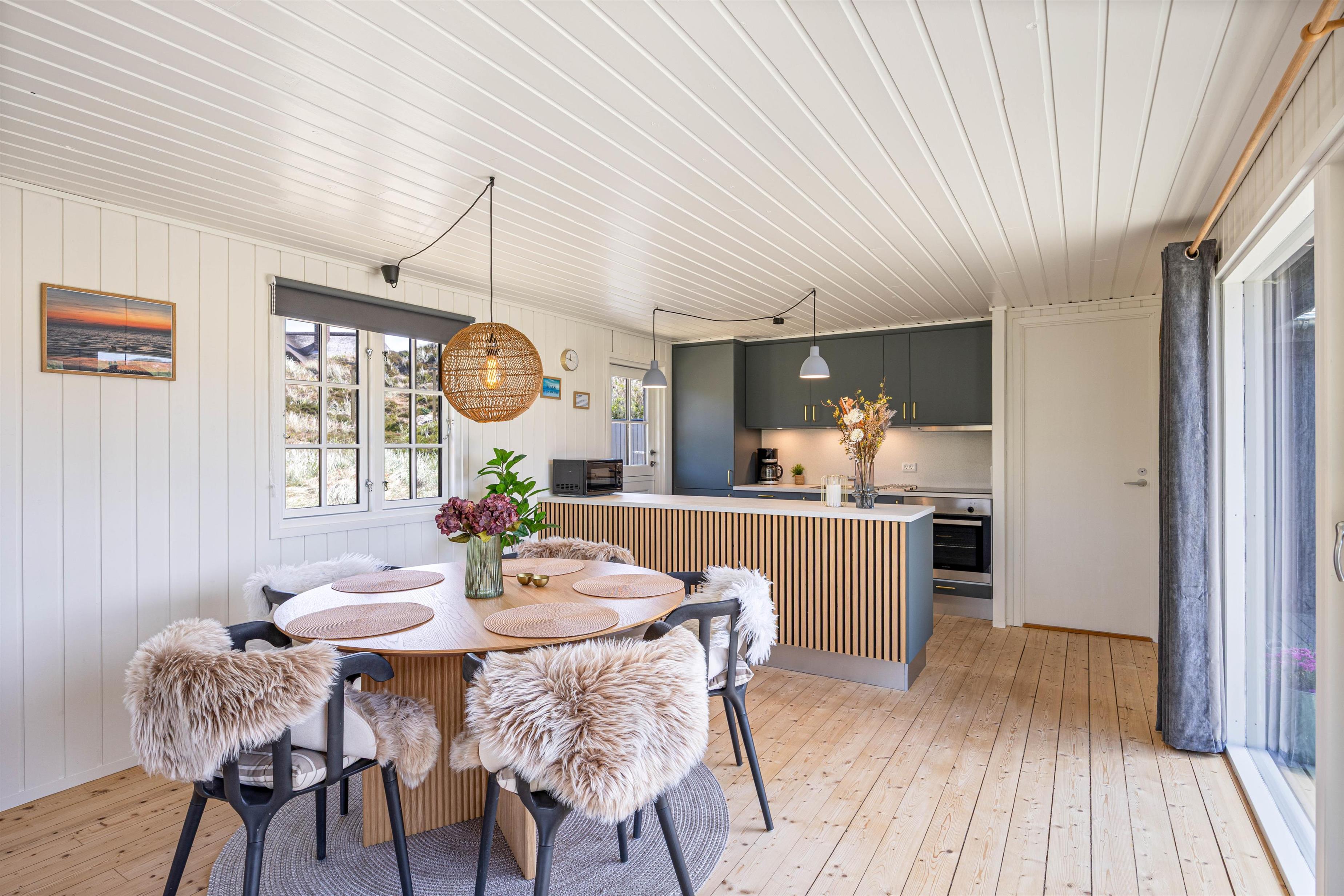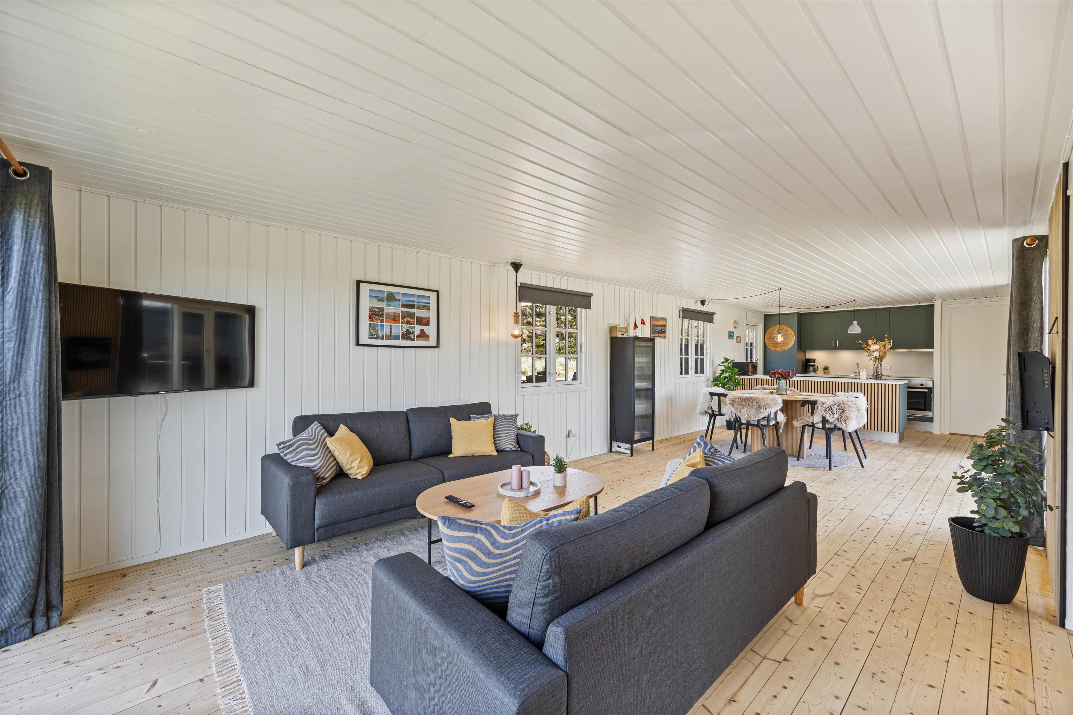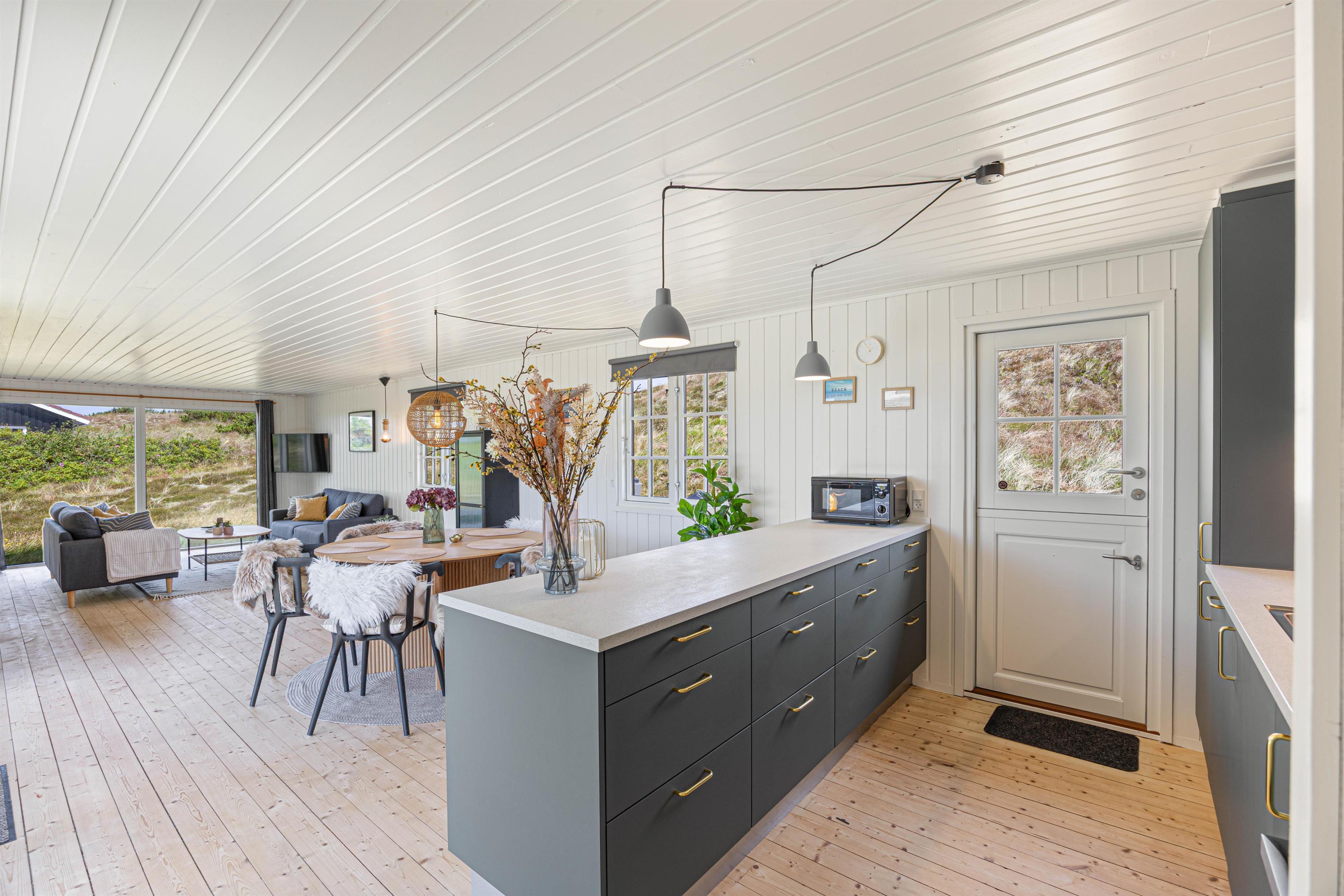 Indvendigt møder I en gennemtænkt indretning med alt, hvad I behøver for et komfortabelt ophold: Her er et fint køkken med opvaskemaskine, en dejlig stue til hyggelige feriestunder med familien, en elpejs, der skaber ekstra stemning på kølige dage, samt en energivenlig varmepumpe, som sikrer behagelige temperaturer året rundt.