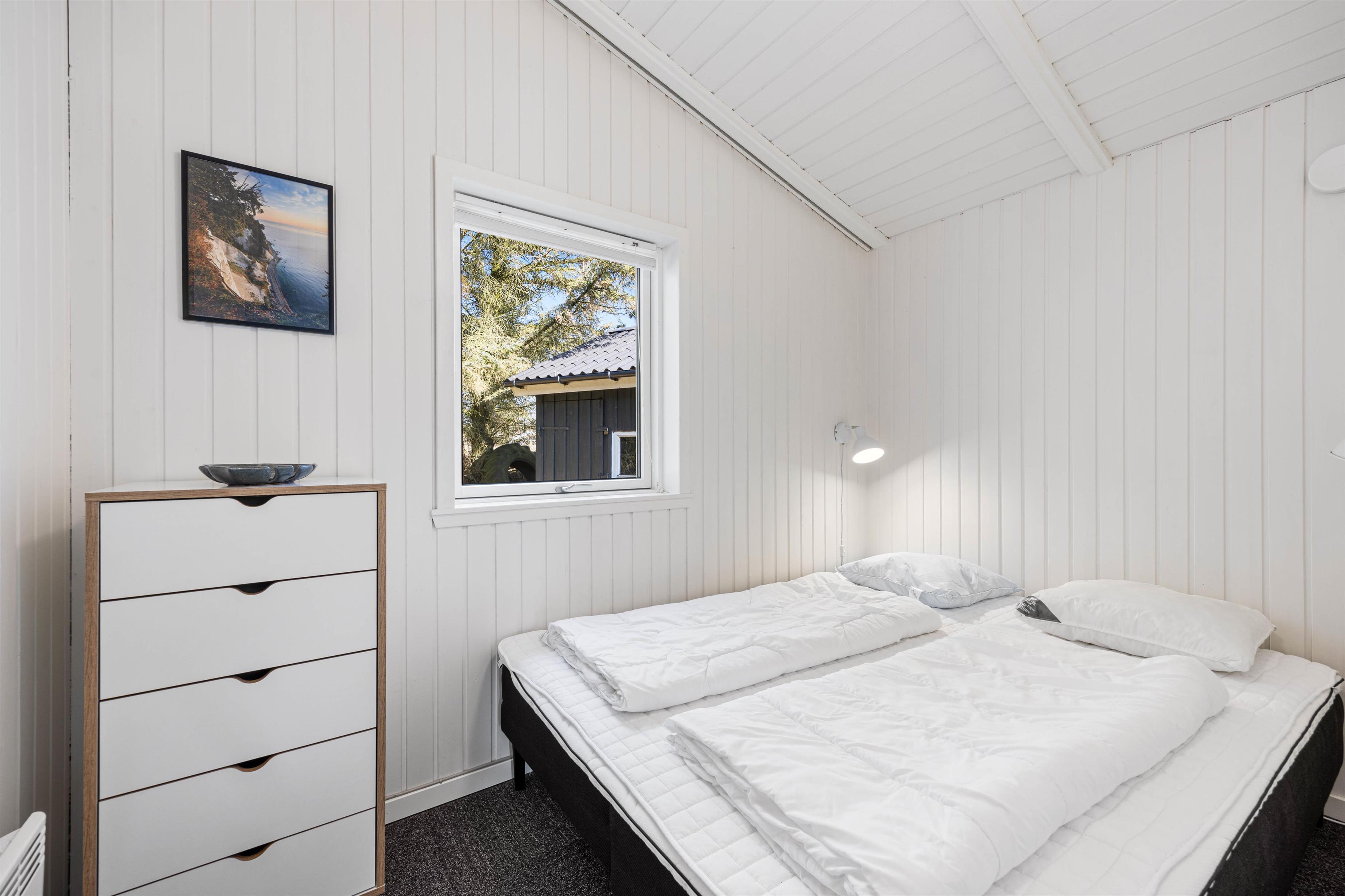 Sommerhuset er til 4 personer – og de kan fordele sig i de 3 fine soverum, her 2 rum med hver en dobbeltseng og et værelse med en køjeseng, som børnene helt sikkert vil elske.