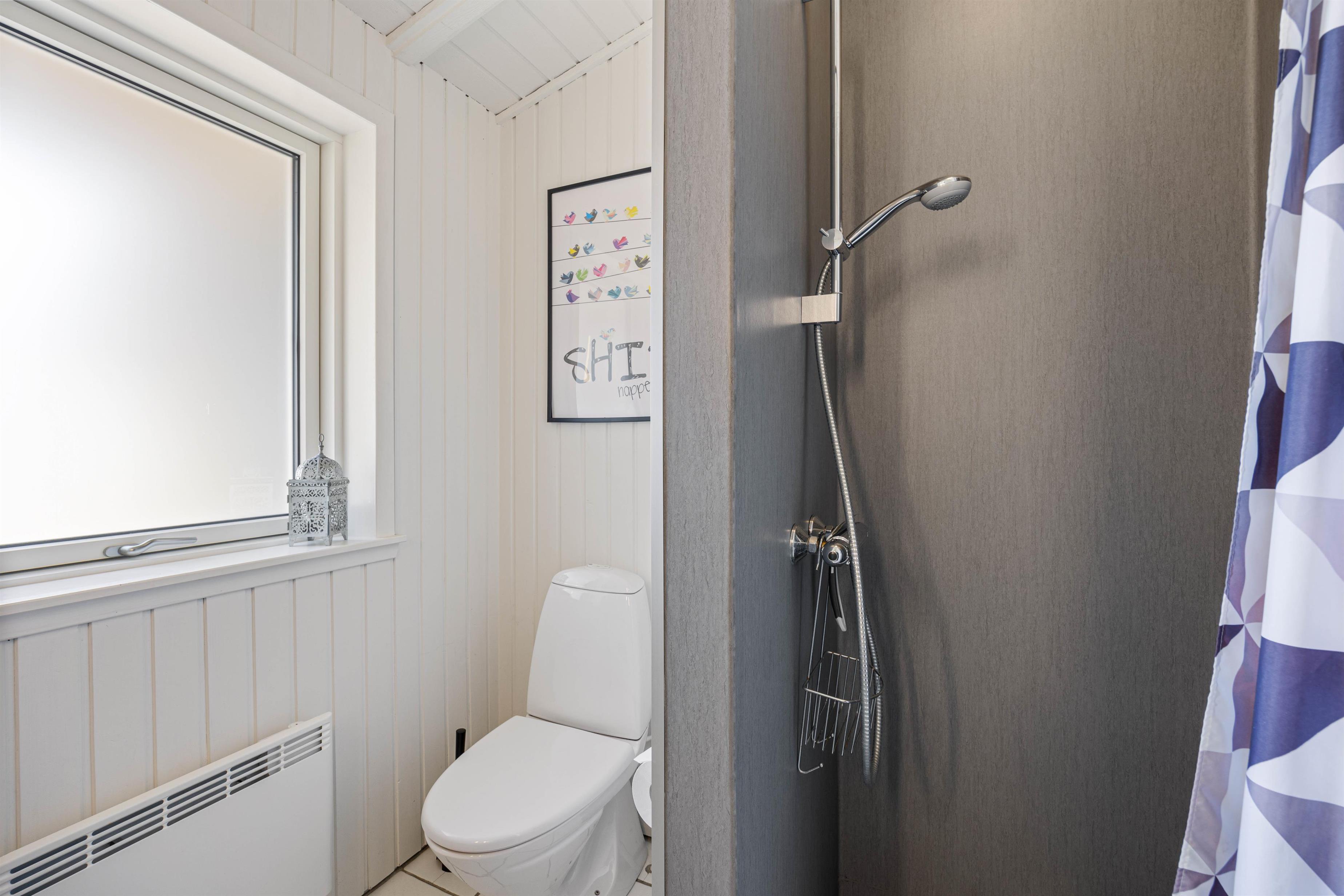 Badeværelset har alt, hvad I har brug for – inklusiv en vaskemaskine, som måske især småbørnsfamilier vil sætte pris på efter en lang dag med leg i naturen og ved vandet.