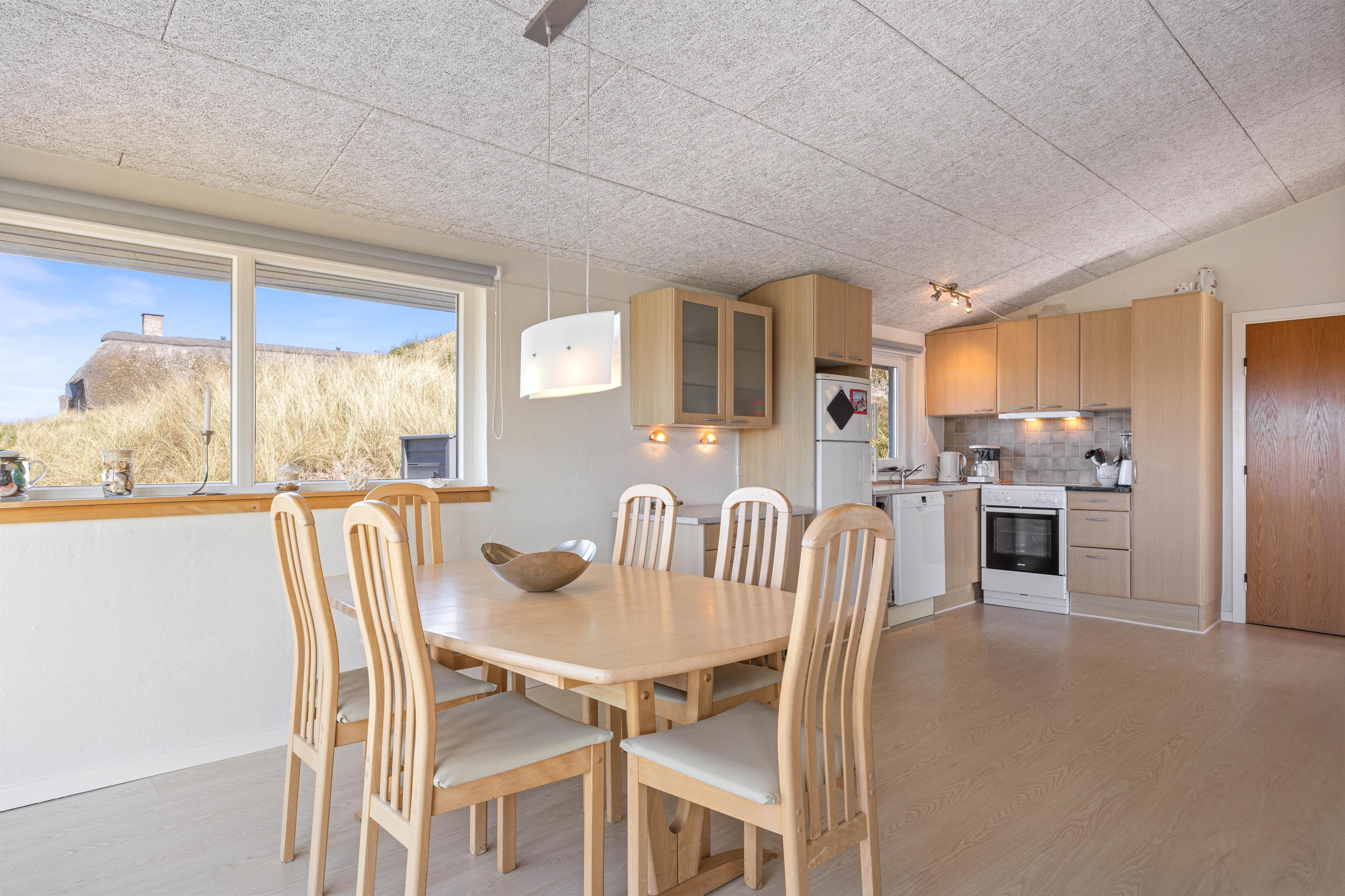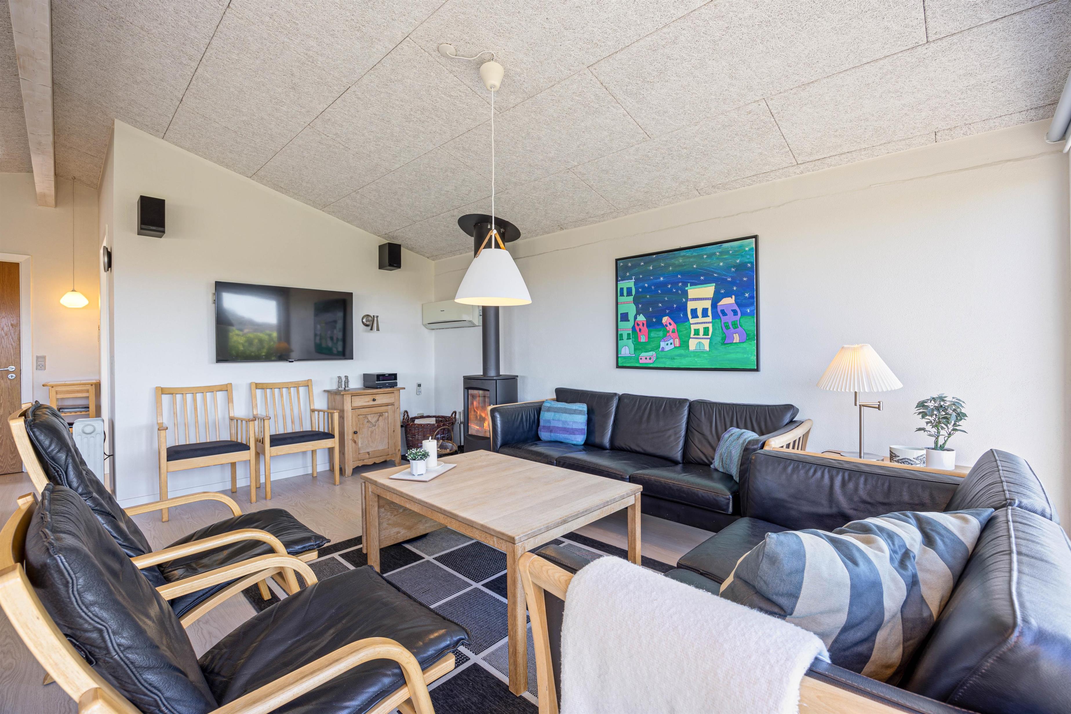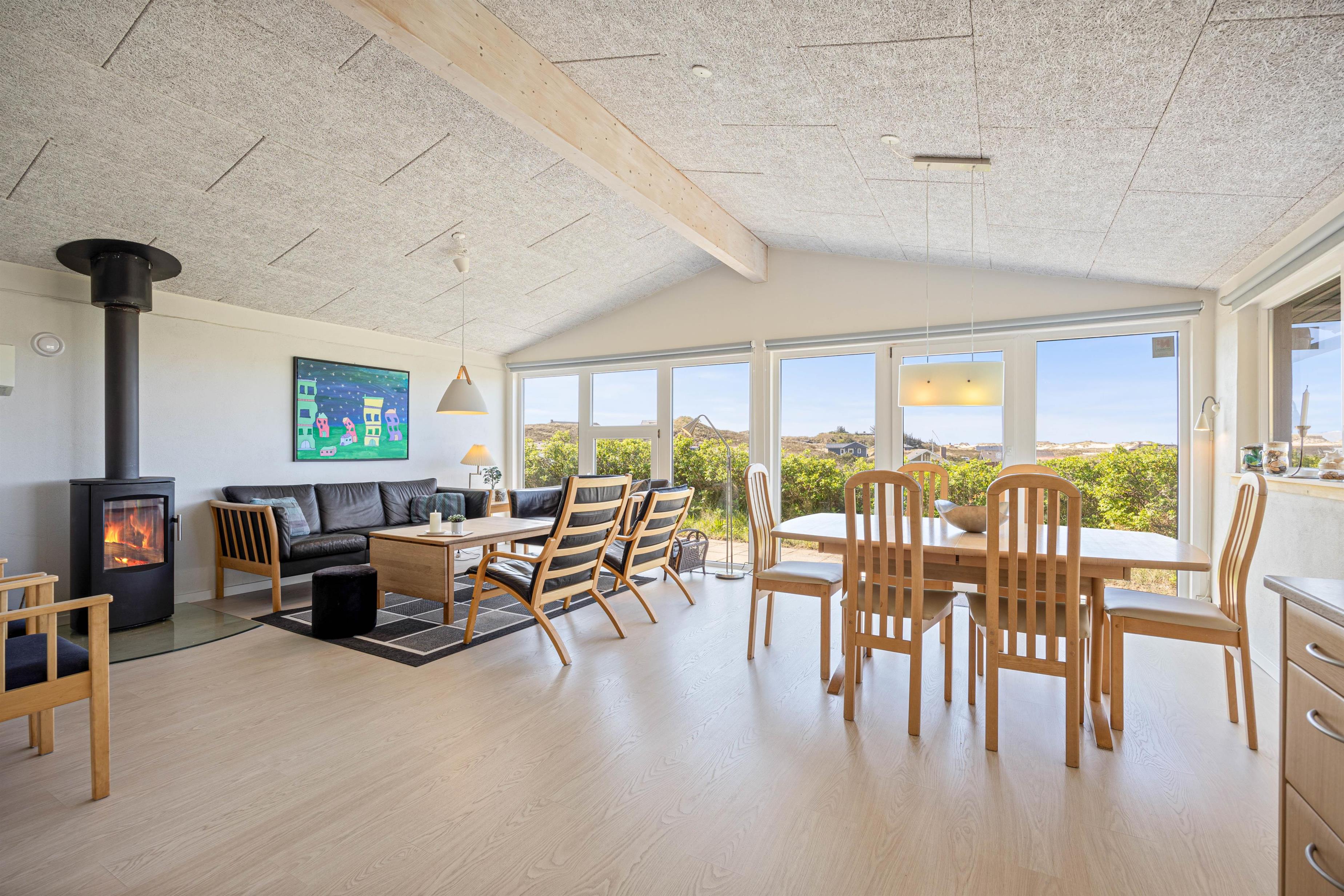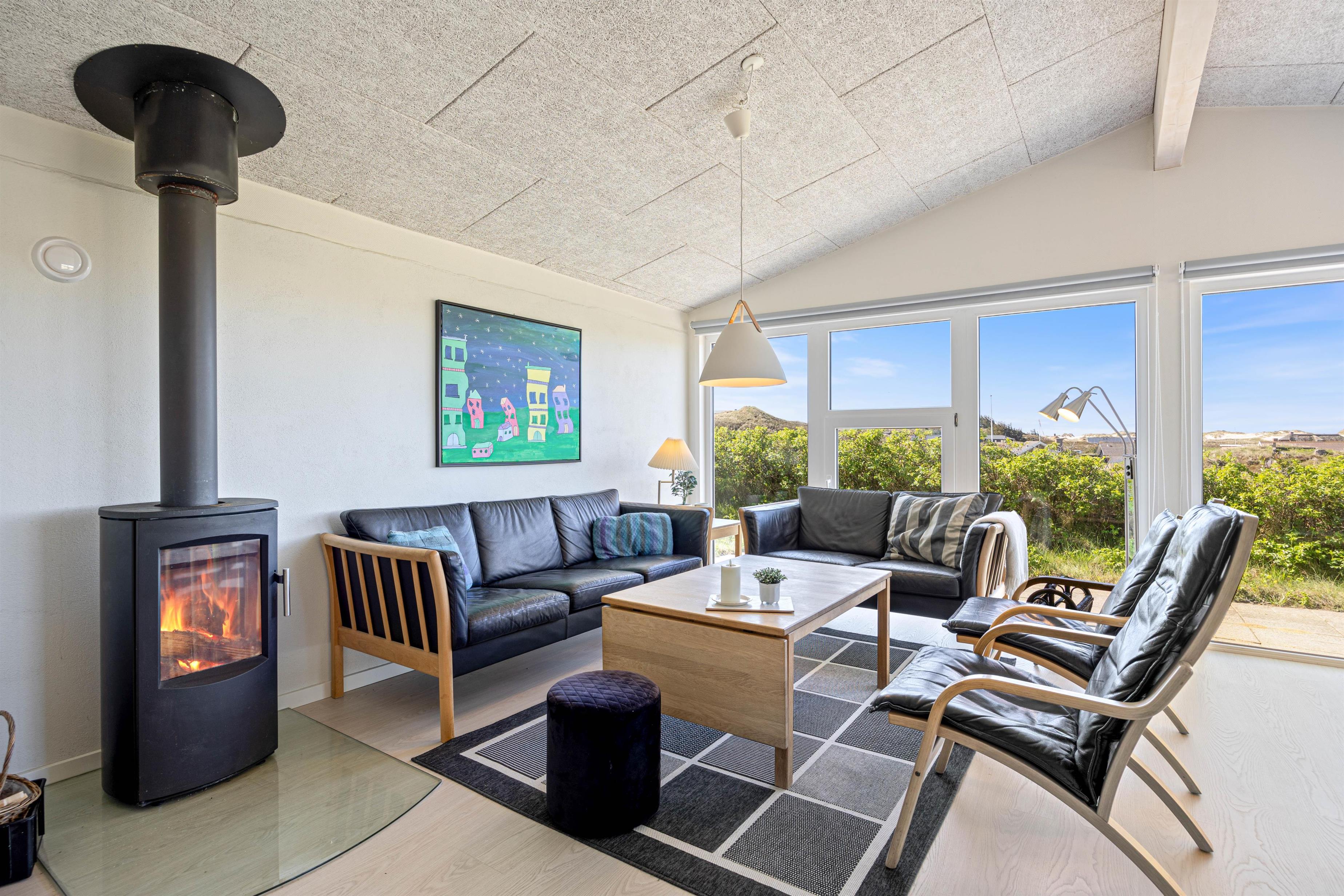 Sæt jer til rette i sofagruppen ved det brede vinduesparti og nyd udsigten over klitlandskabet. Luft til luft varmepumpen sørger for, at temperaturen altid er behagelig. Træk jer tilbage med en god bog, tænd eventuelt op i brændeovnen og lad feriestemningen brede sig.
