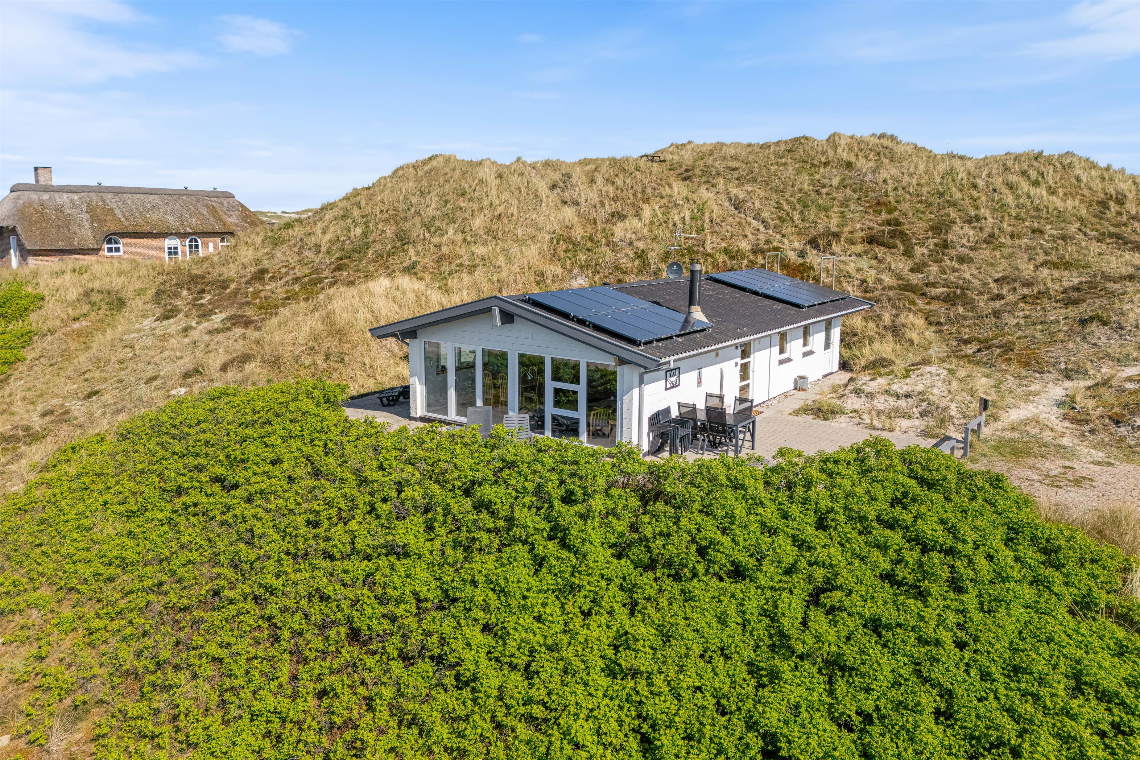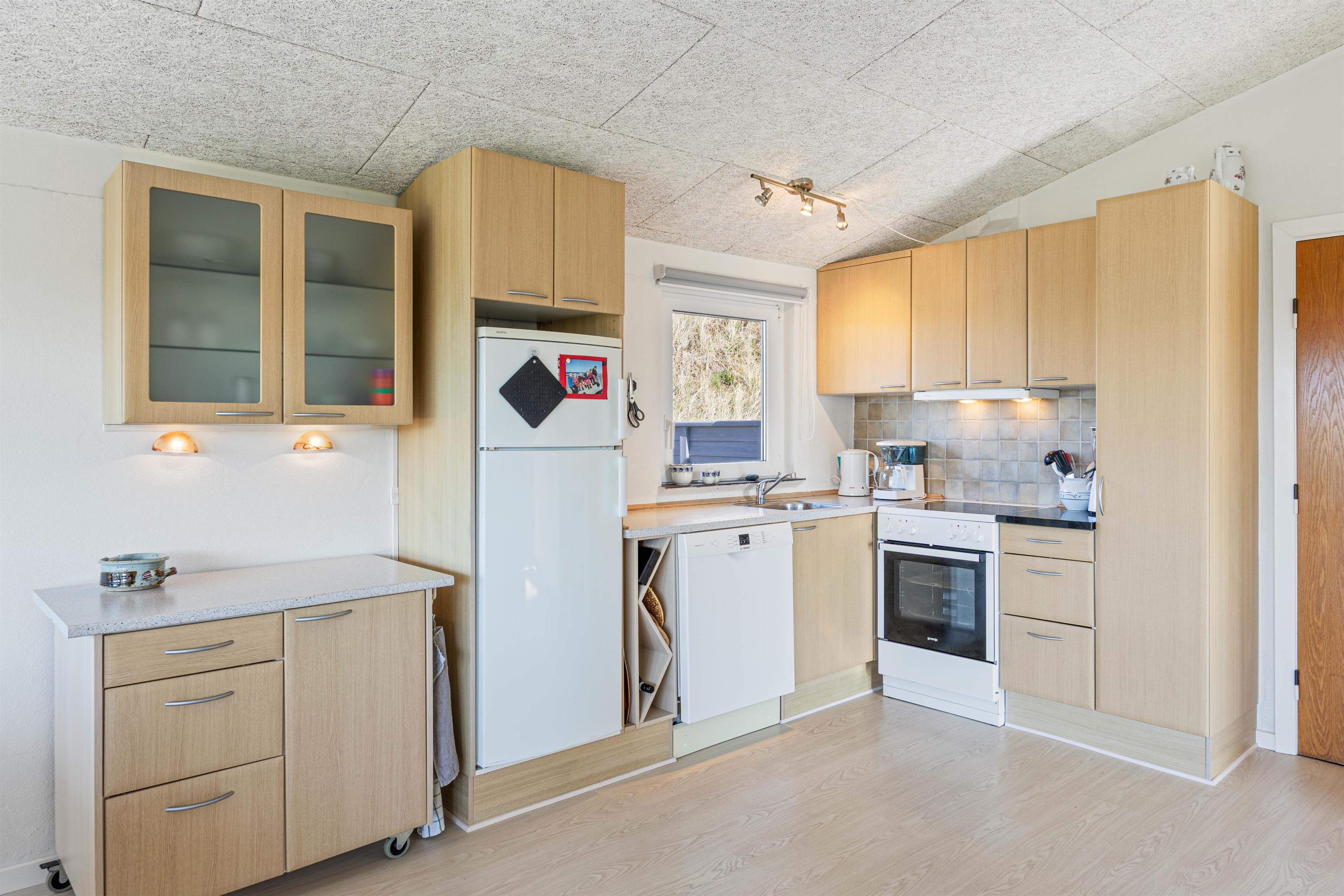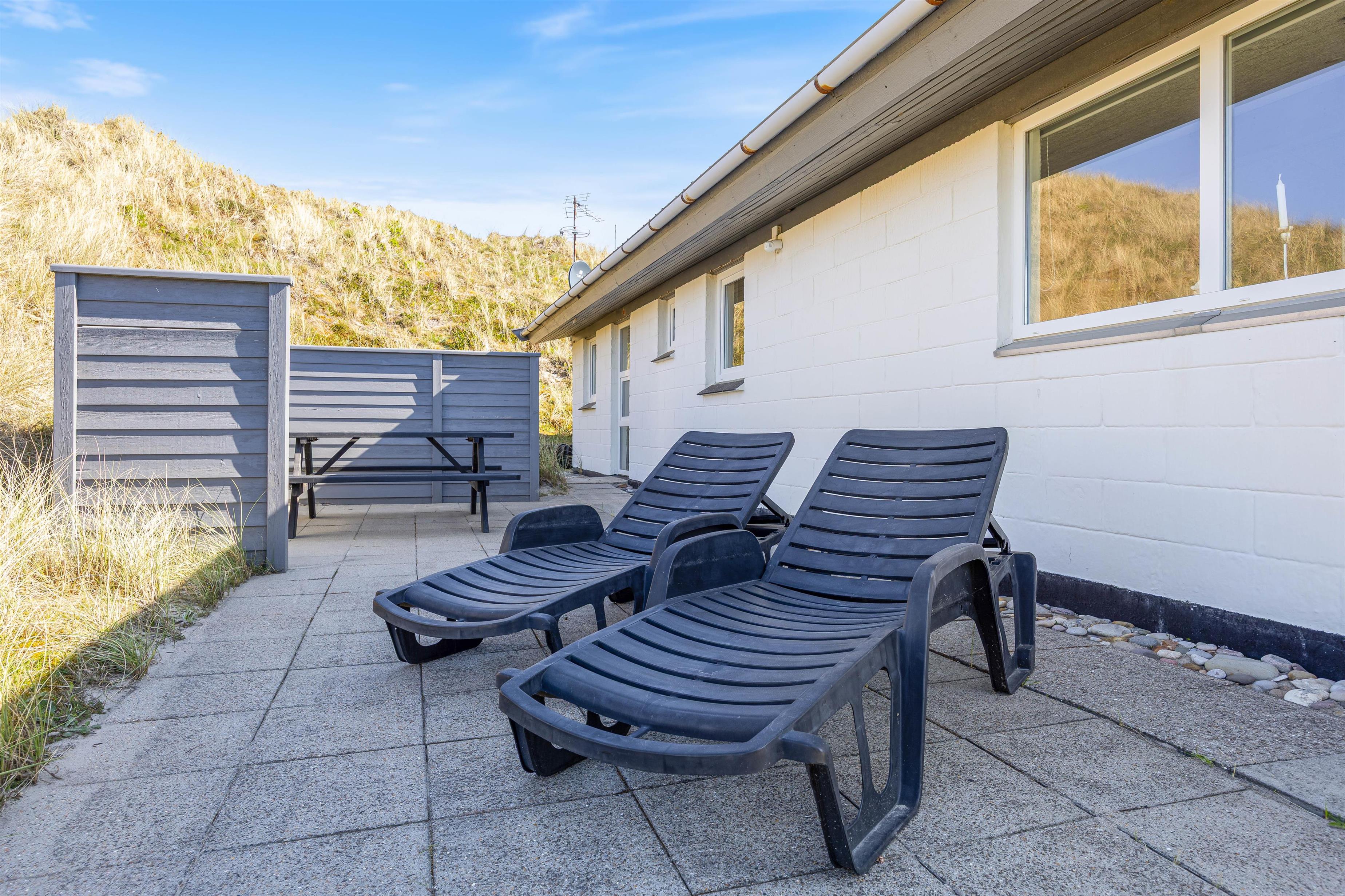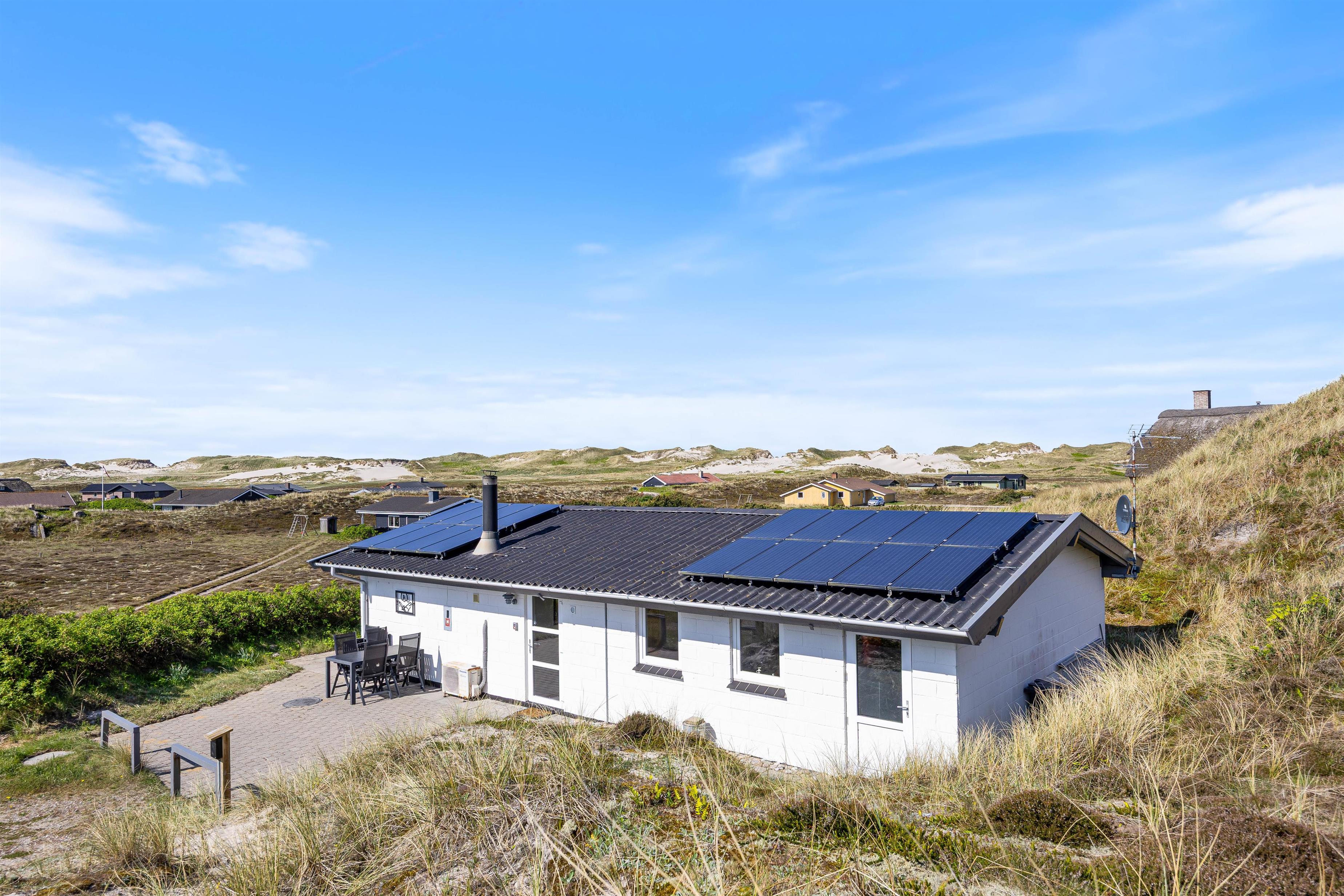Sæt jer til rette i sofagruppen ved det brede vinduesparti og nyd udsigten over klitlandskabet. Luft til luft varmepumpen sørger for, at temperaturen altid er behagelig. Træk jer tilbage med en god bog, tænd eventuelt op i brændeovnen og lad feriestemningen brede sig.