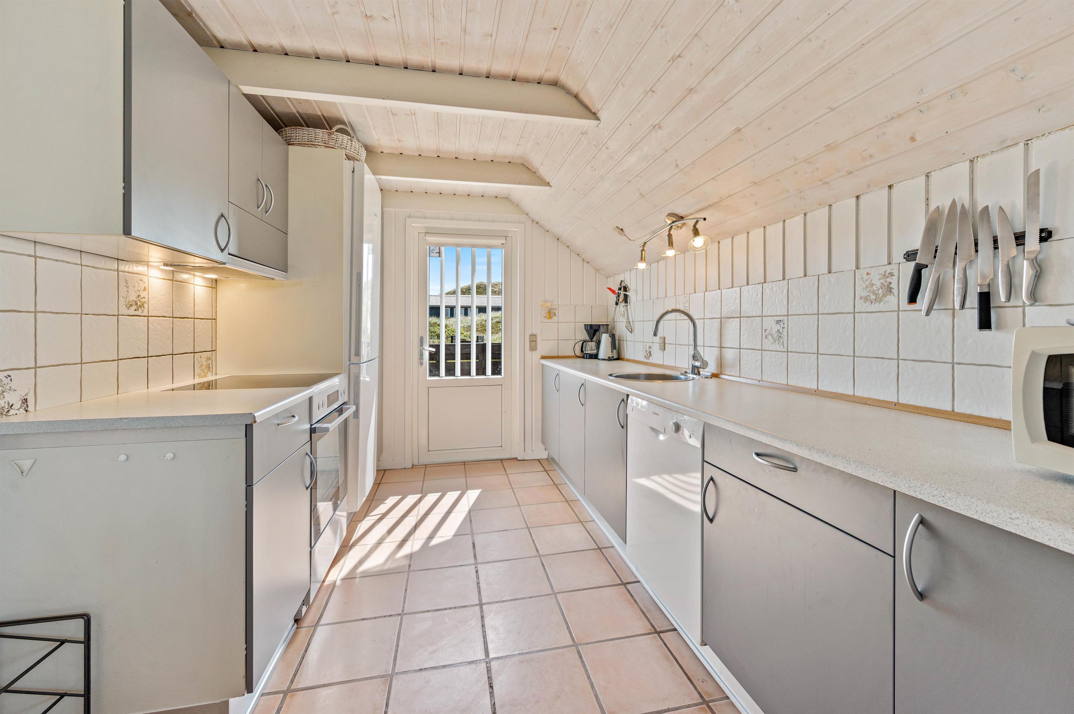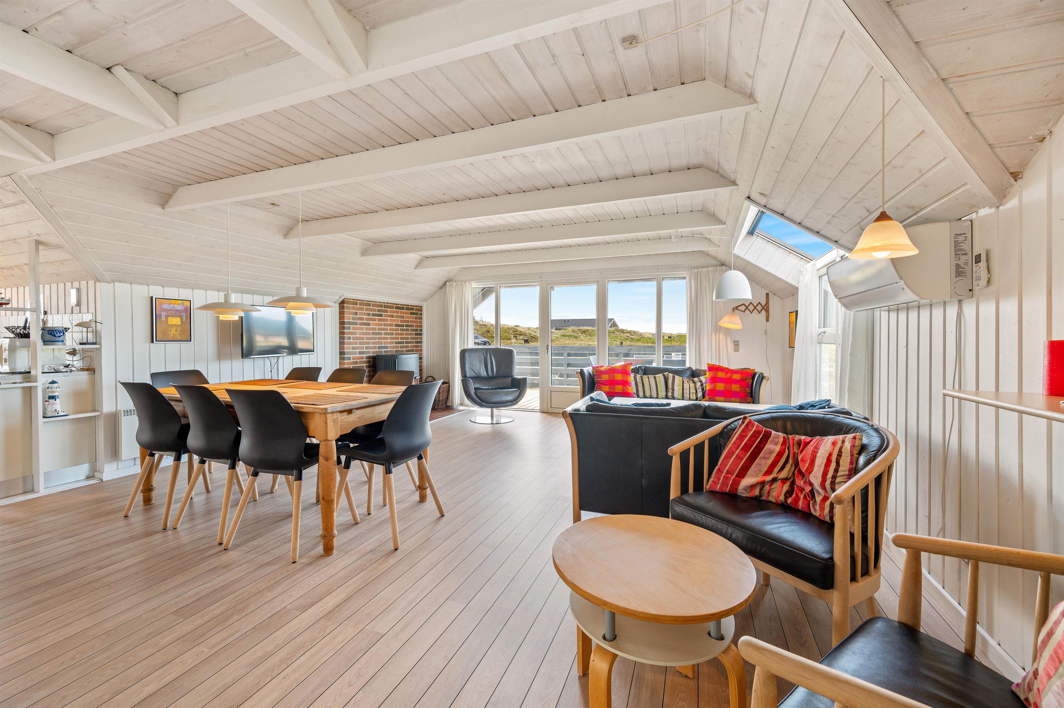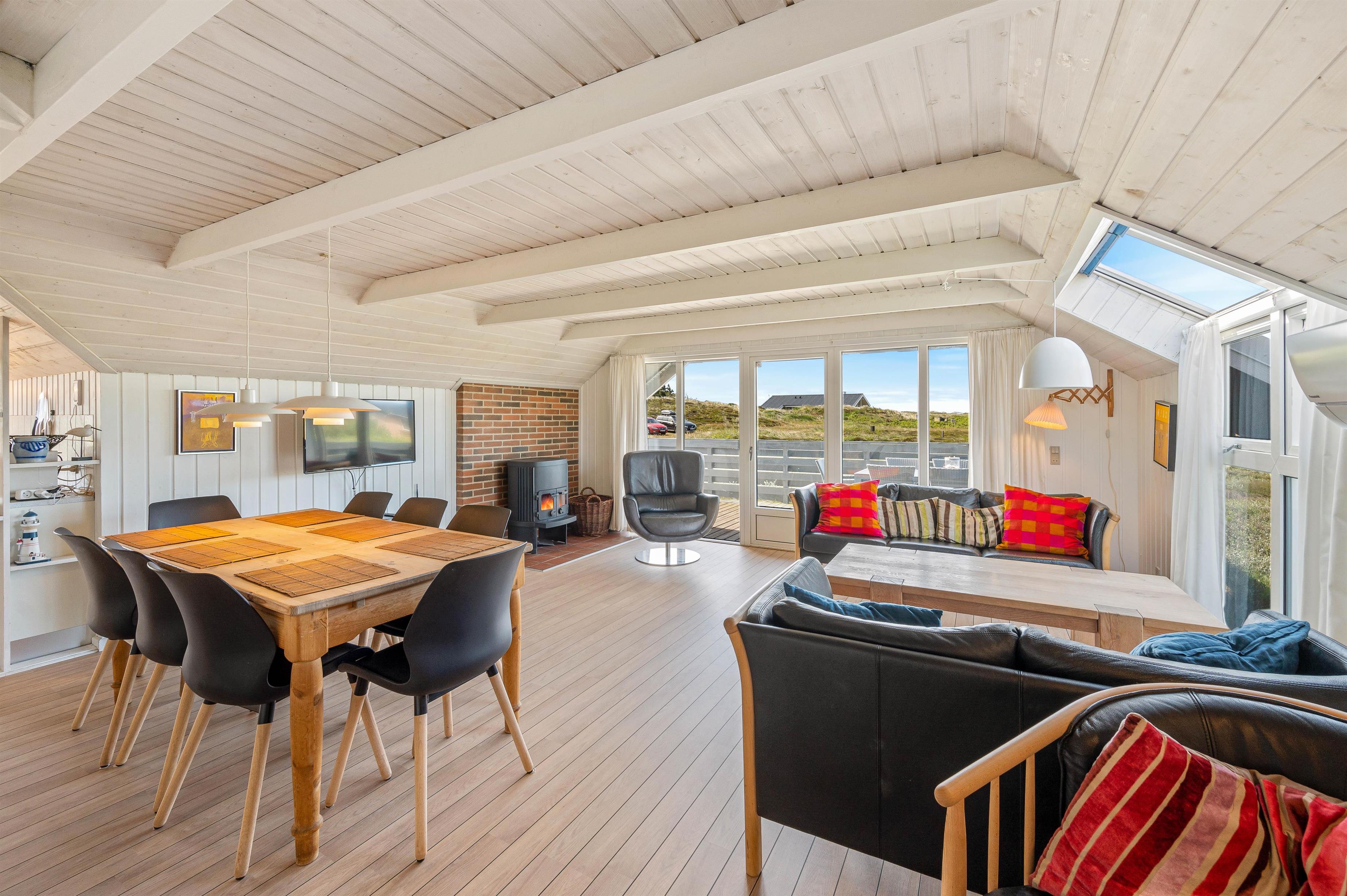 Der er en opvaskemaskine, en mikroovn og en fryser på 30 L i sommerhusets køkken. Stuen er hyggeligt indrettet, og har lyse trævægge og et lyst trægulv. Udsigten fra stuen mod syd og mod vest er fantastisk, og den giver følelsen af at være helt alene i dette smukke klit og hede landskab. Der er en brændeovn, TV, DVD og gratis trådløst internet.