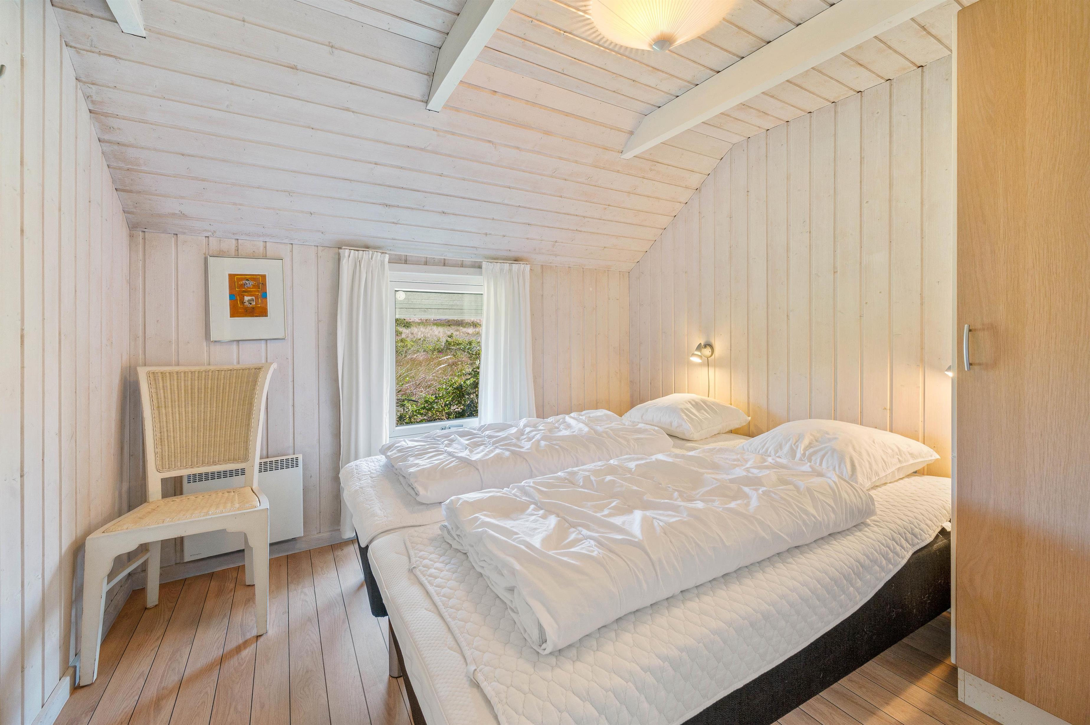 Et skønt sommerhus med plads til 8 personer. Der er 4 soveværelser, 2 af værelserne har hver en dobbeltseng, et værelse har 2 enkeltsenge, og det sidste har en etageseng. Der er 2 badeværelser i feriehuset, begge har gulvvarme og en bruseniche. Det store badeværelse har desuden en hjørnespa og en sauna. Og her finder I også sommerhusets vaskemaskine og tørretumbler.