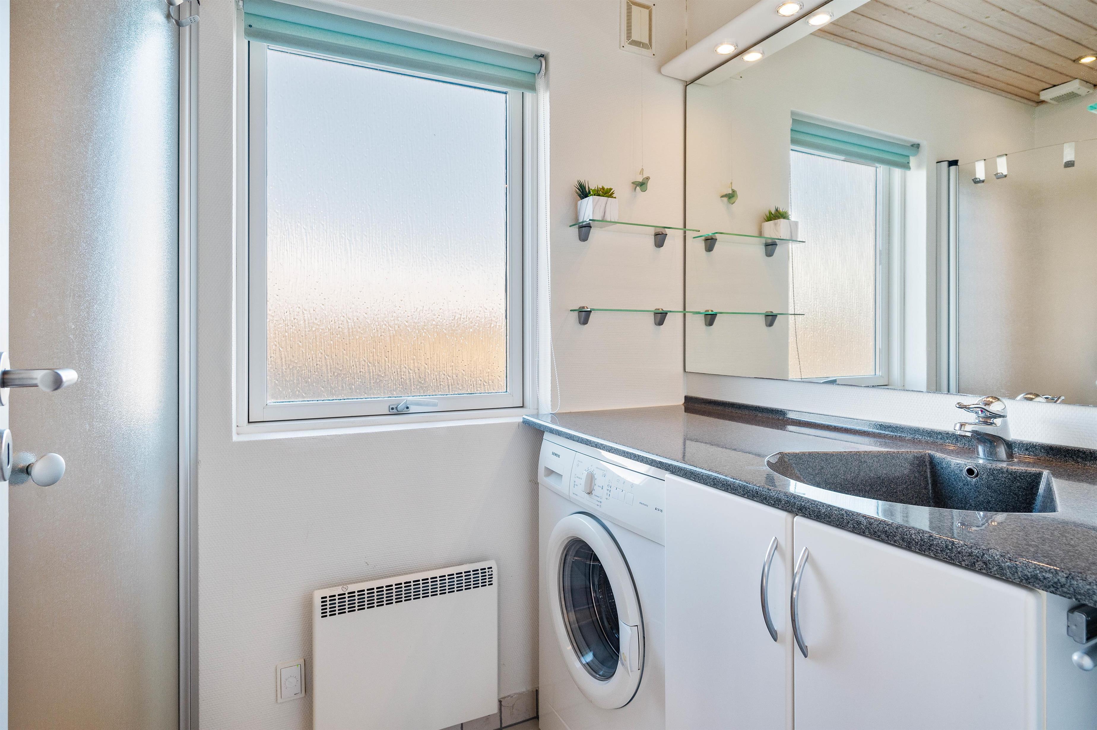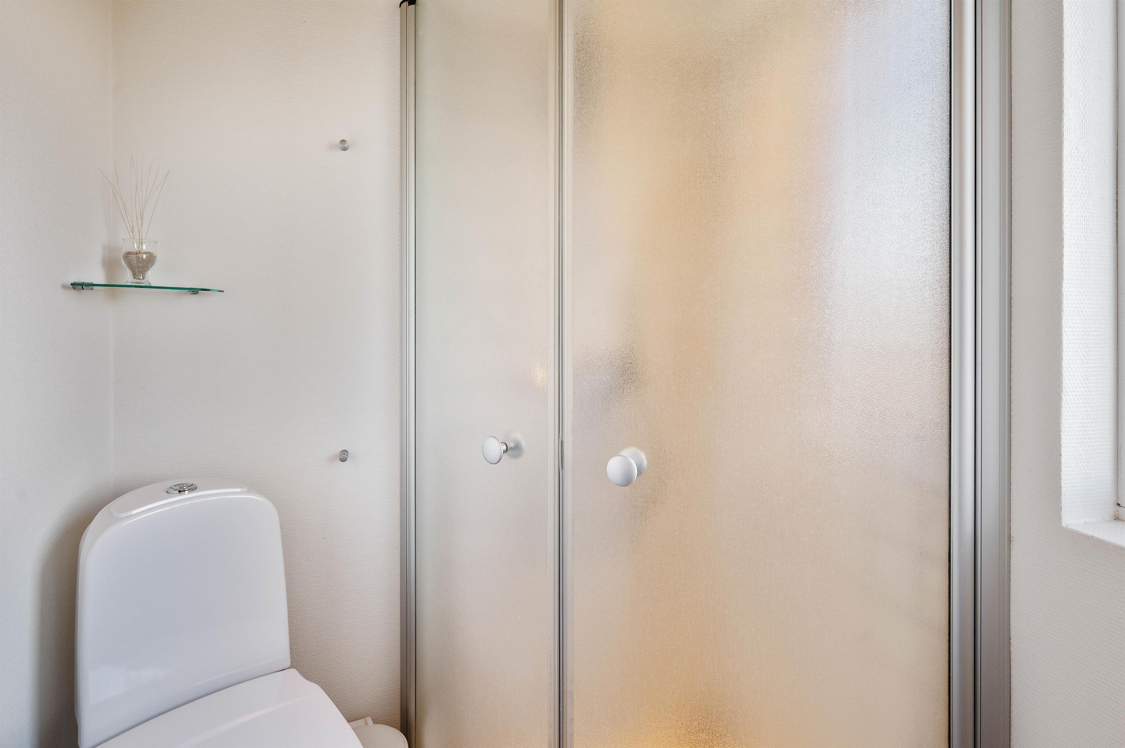 Sommerhuset har et fint badeværelse med gulvvarme samt 3 gode værelser. Der er 1 dobbeltseng, 3/4 seng og 1 Etageseng.