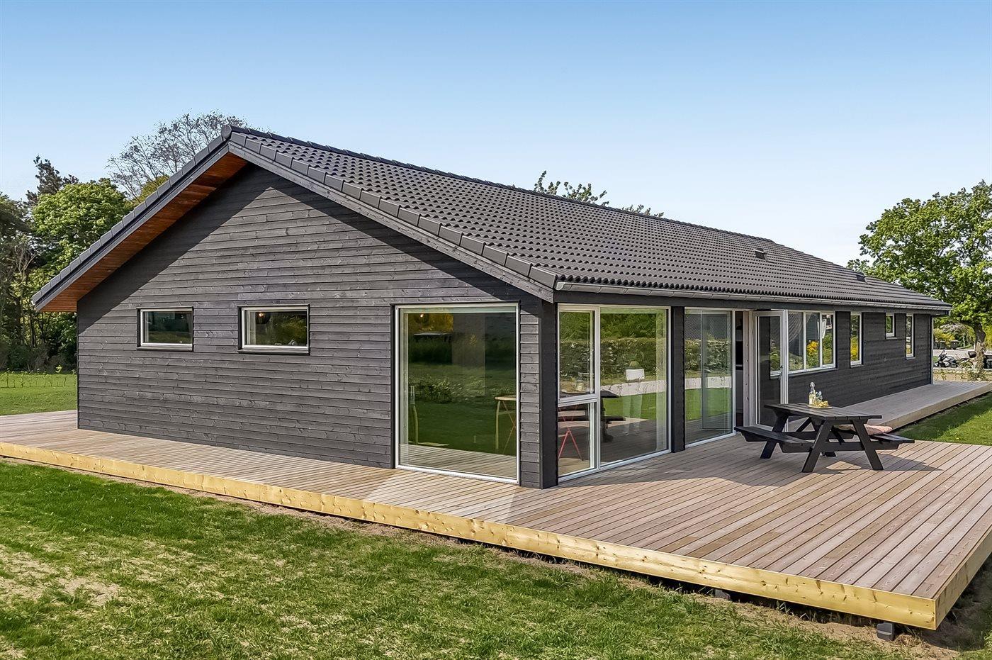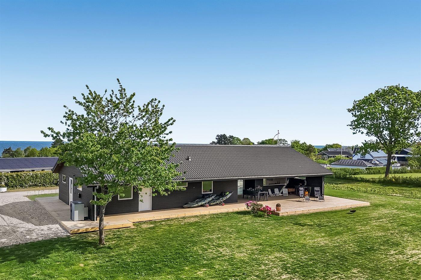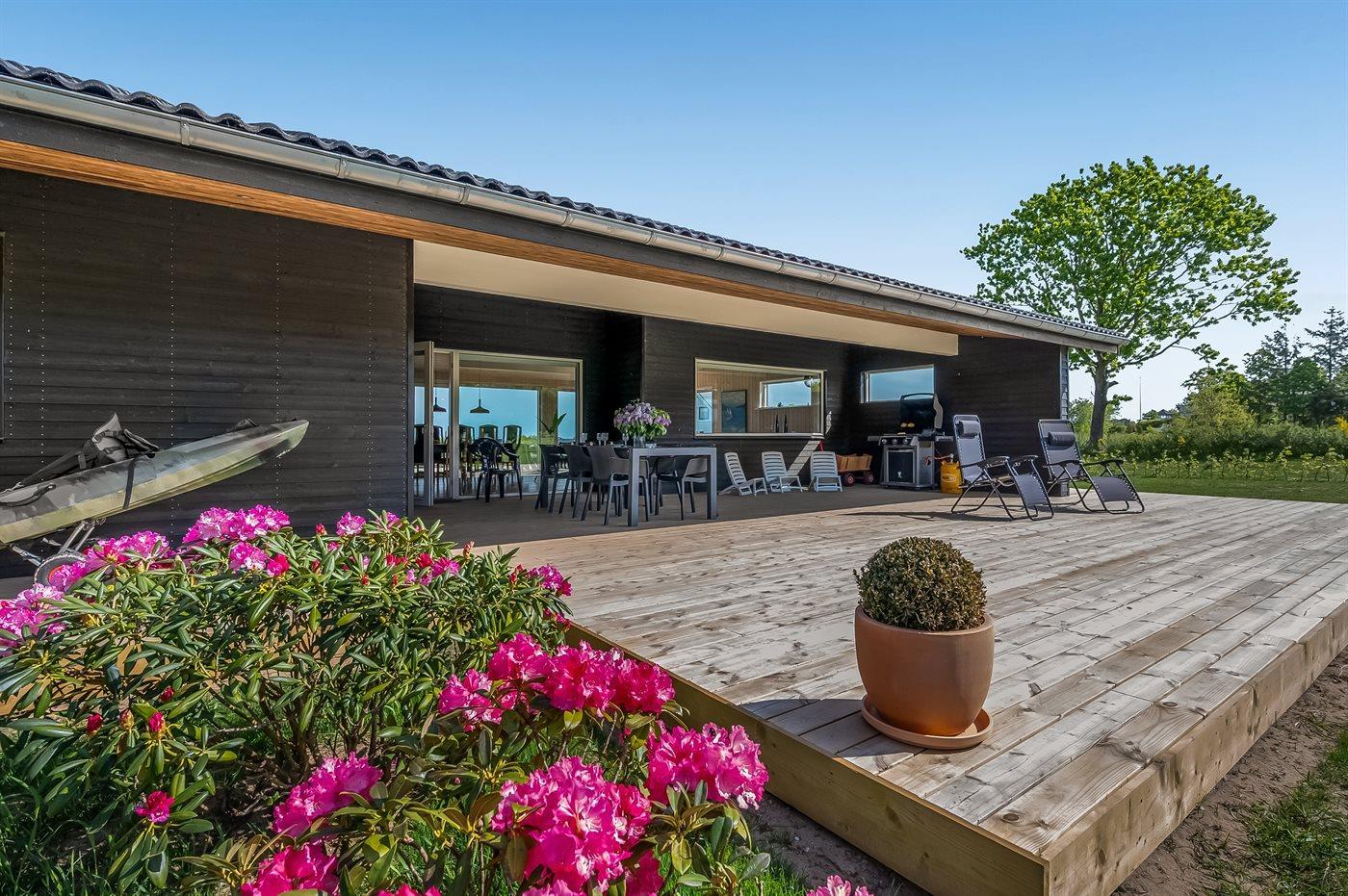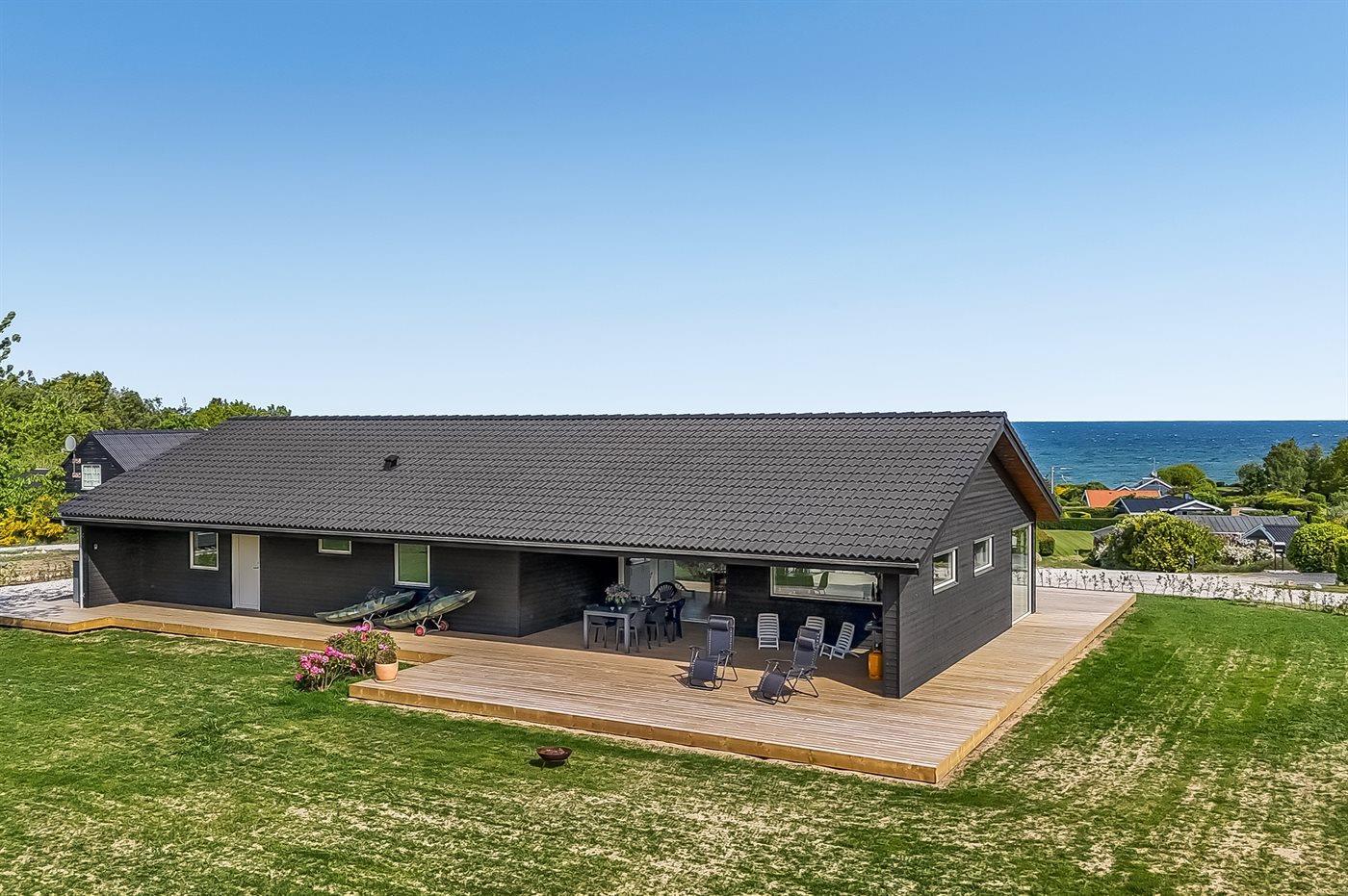 Nybygget sommerhus ved Skovgårde Strand med havudsigt og store terrasser, perfekt til afslapning og familieferie.