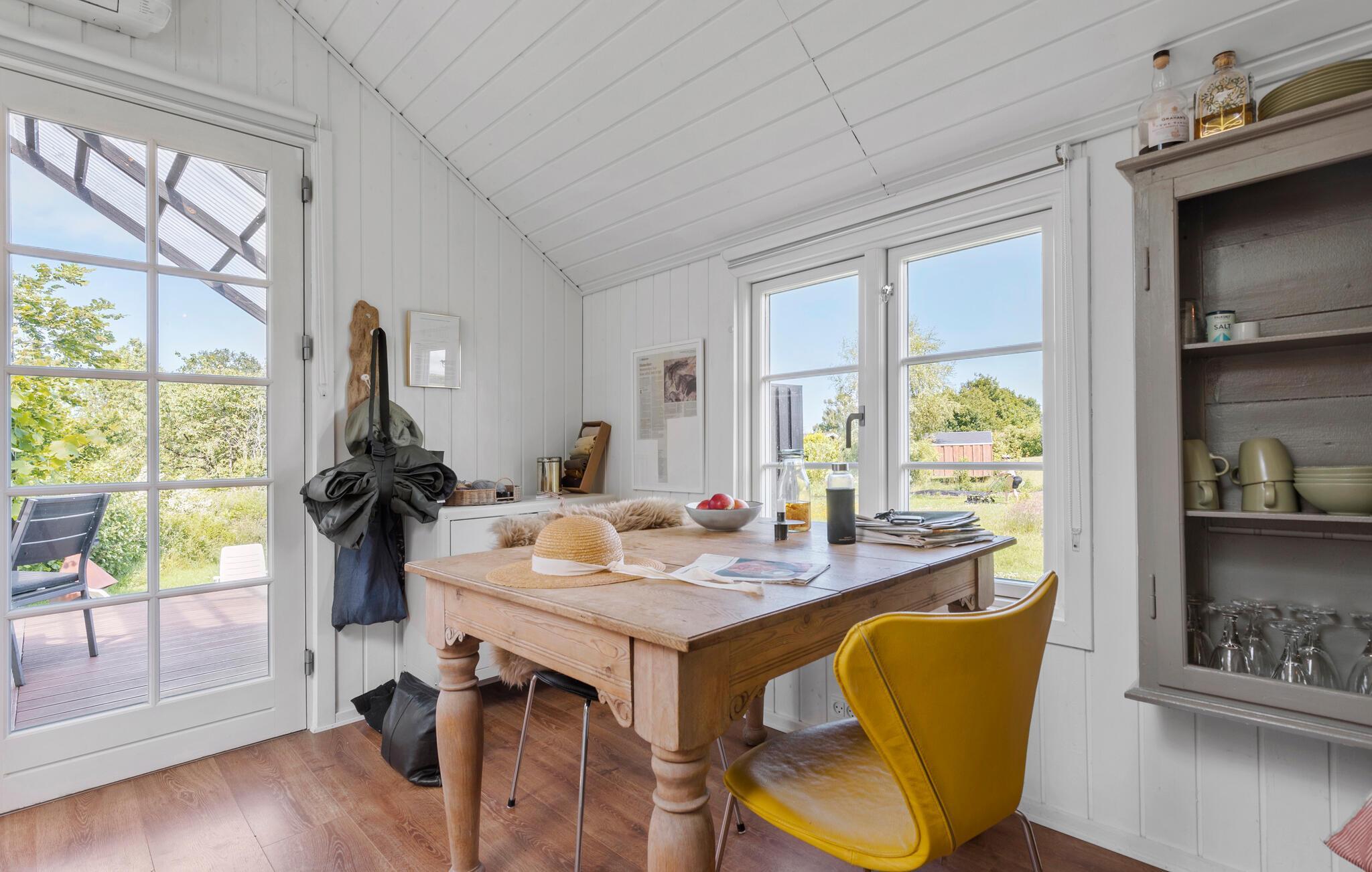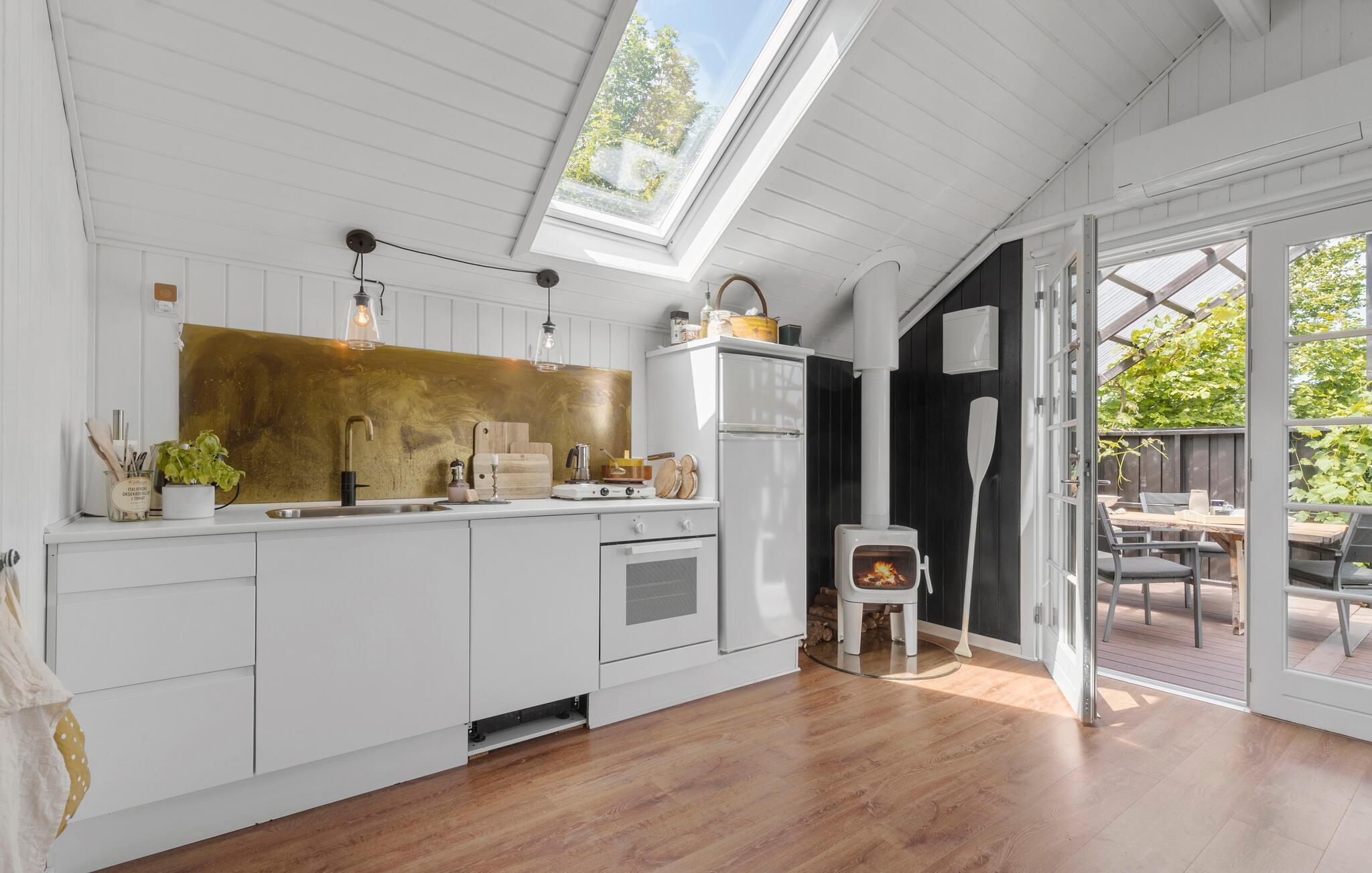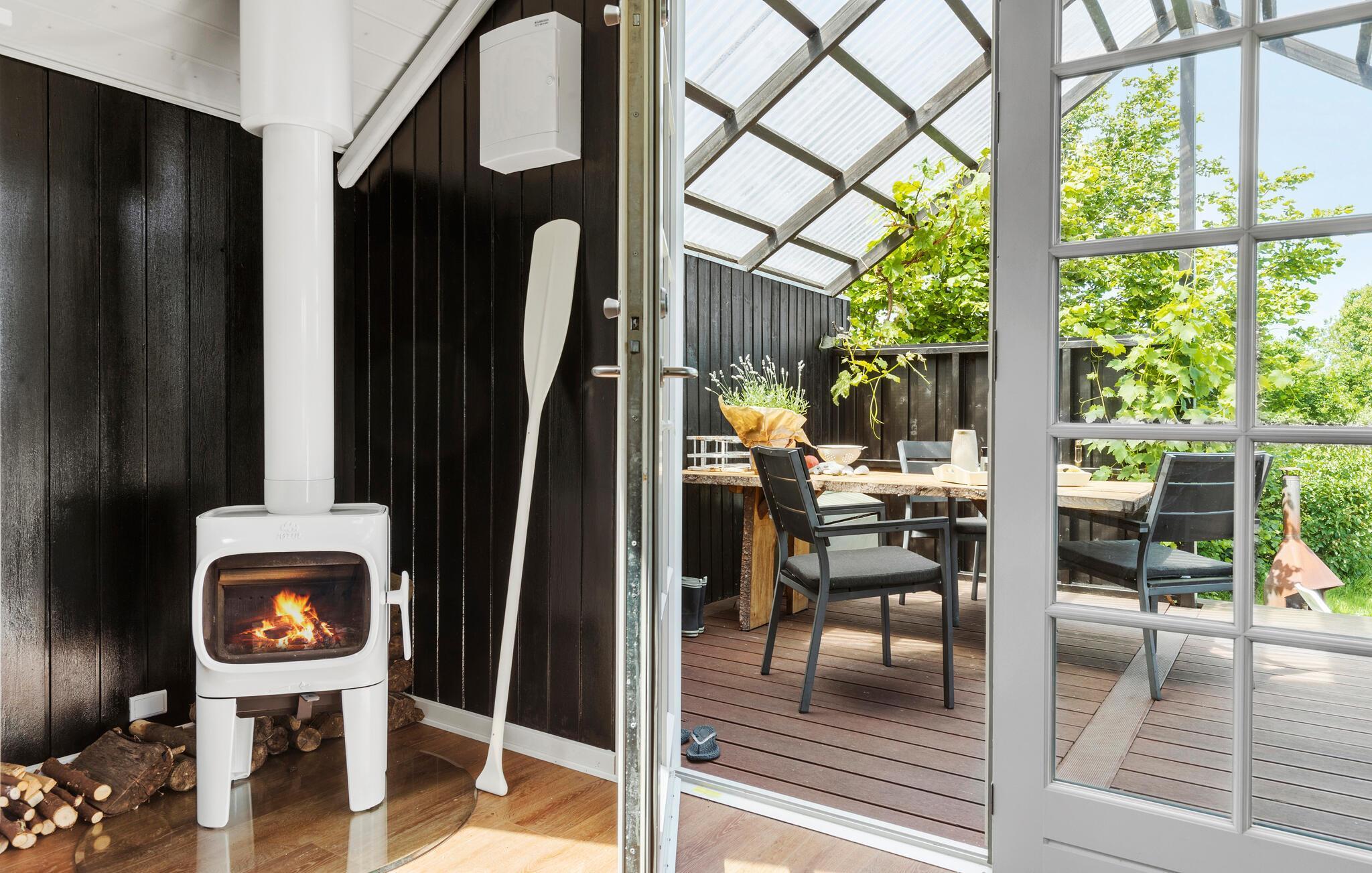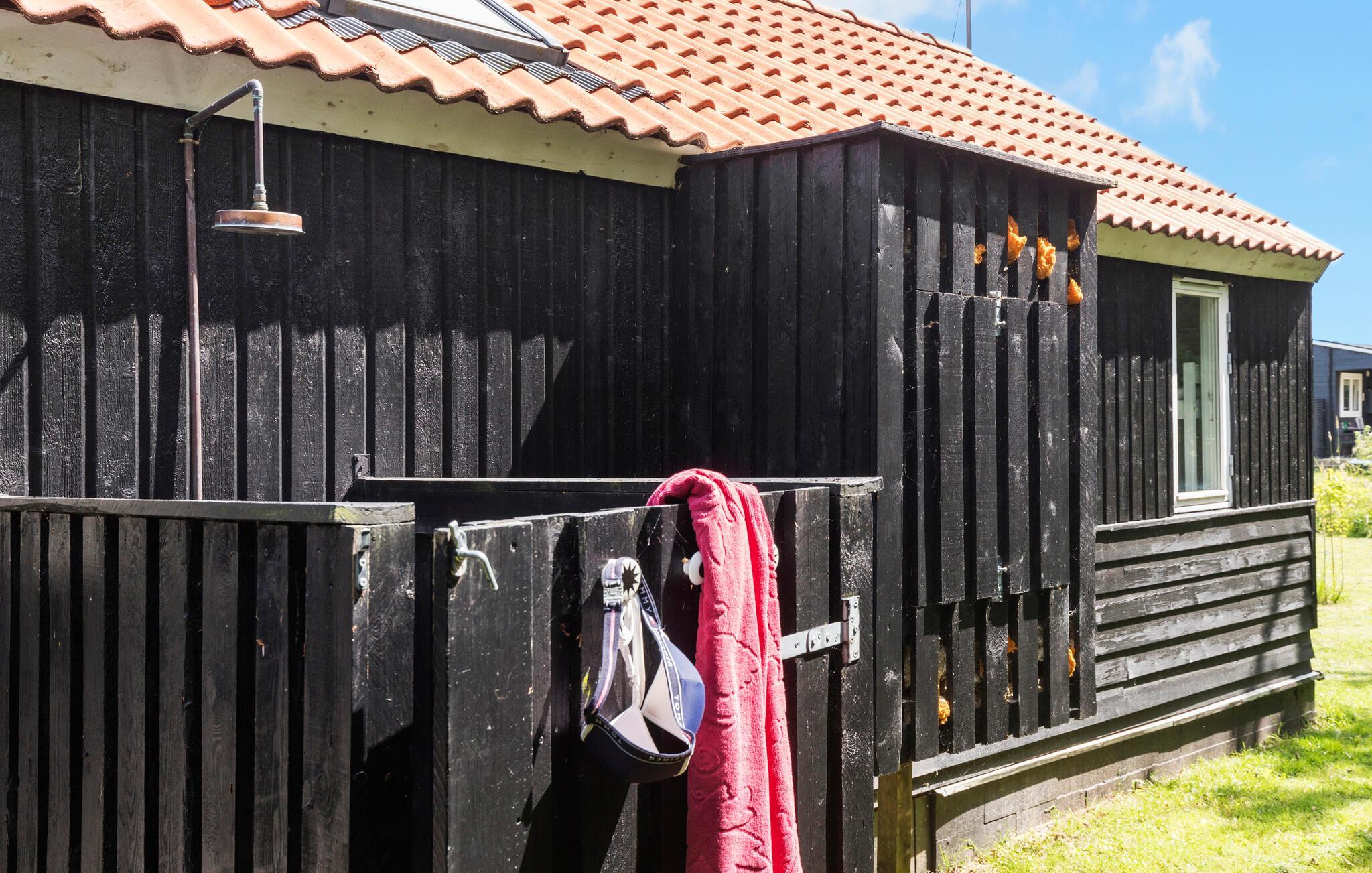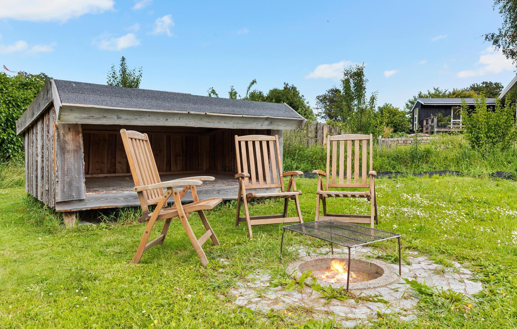 Tilbring dagene udenfor på den overdækkede træterrasse. Sæt jer ved bordet, nyd måltiderne i den friske luft eller slap af i en af ??havestolene. Benyt jer af den lille solterrasse med liggestole eller find en samling brændestykker til et hyggeligt bål om aftenen. Udendørsbruseren er oplagt til varme sommerdage, og der er også en shelterhytte.