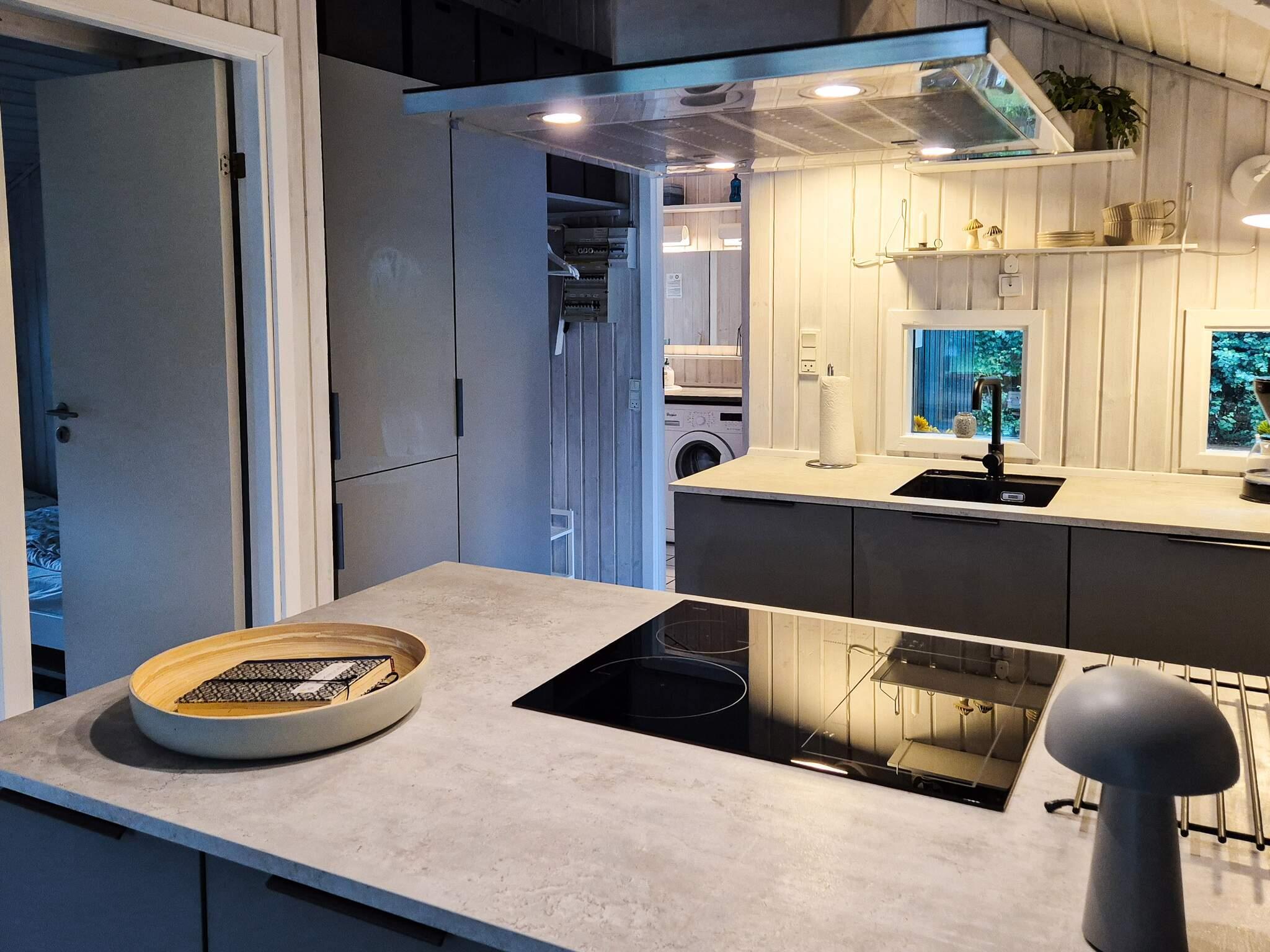 Boligens hjerte er det åbne køkken og opholdsstue, komplet med spiseplads og hyggeligt siddehjørne. En brændeovn tilføjer varme og charme på køligere aftener, mens store vinduespartier og direkte udgang til den rummelige terrasse bringer masser af naturligt lys ind. Huset har tre komfortable soveværelser og en sovealkove i stuen, et yndet sted for børn at nyde deres eget hyggelige hjørne. Badeværelset har gulvvarme, boblebad og sauna, hvilket gør det nemt at slappe af efter en dag udendørs.