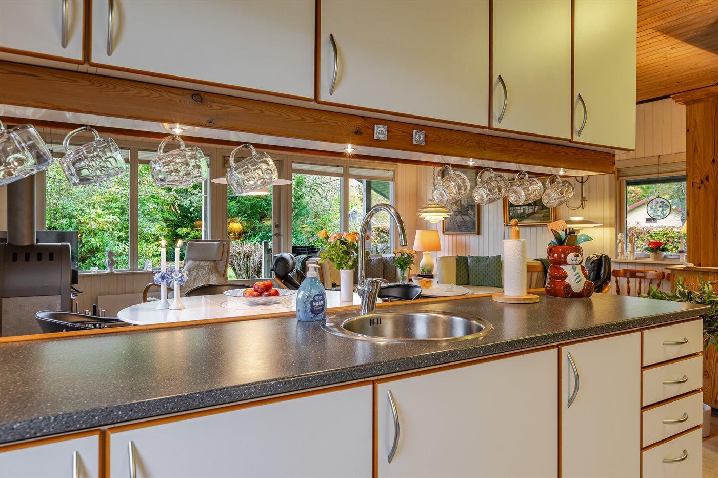Køkkenet er udstyret med 1 køleskab. Der er 4 keramiske kogeplader. Mikrobølgeovn. Ferieboligen har kombineret komfur (med ovn) og opvaskemaskine.
